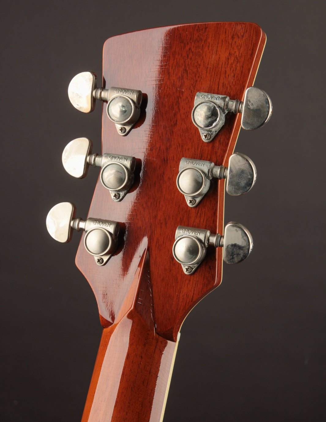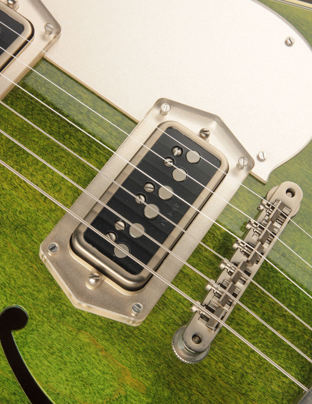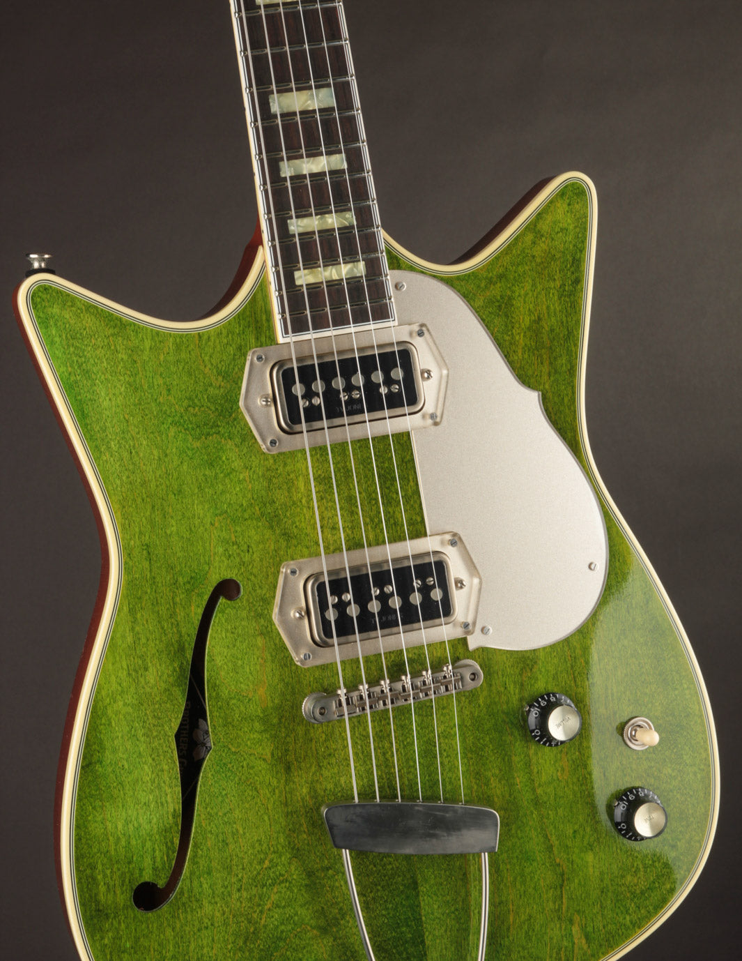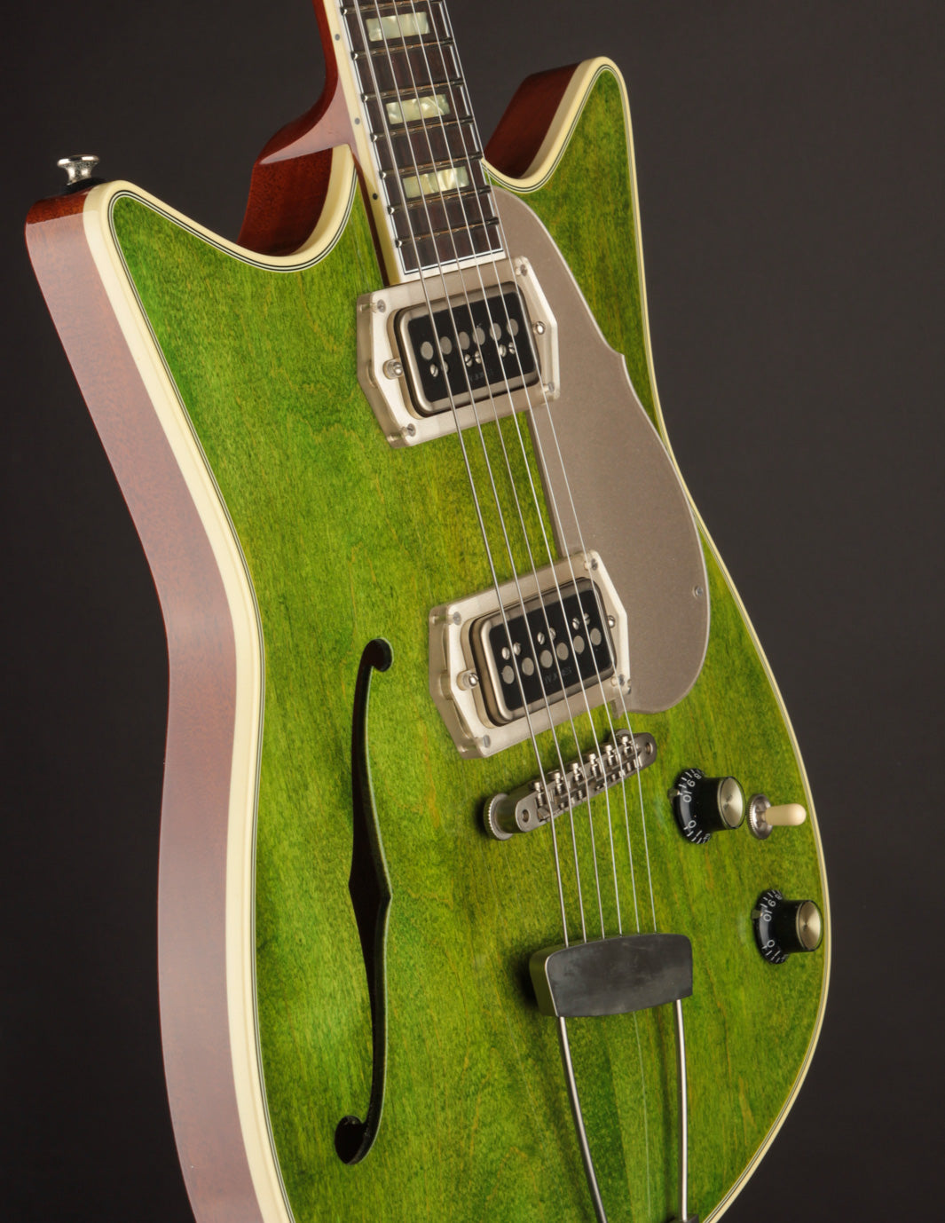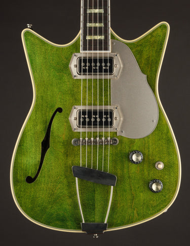 The lightly relic’d Faded Evergreen finish has a quiet sophistication that photos can’t quite capture—subtle, striking, and beautifully matched by the clear acrylic appointments throughout. The pickup surrounds and pickguard (backed in Silver), along with small block inlays and Grover "Milk Bottle" Rotomatics, give this guitar a vintage-inspired, broken-in feel that’s immediately inviting. One part vintage Gretsch, one part vintage Gibson (though the overall feel leans way more in the Gibson direction).