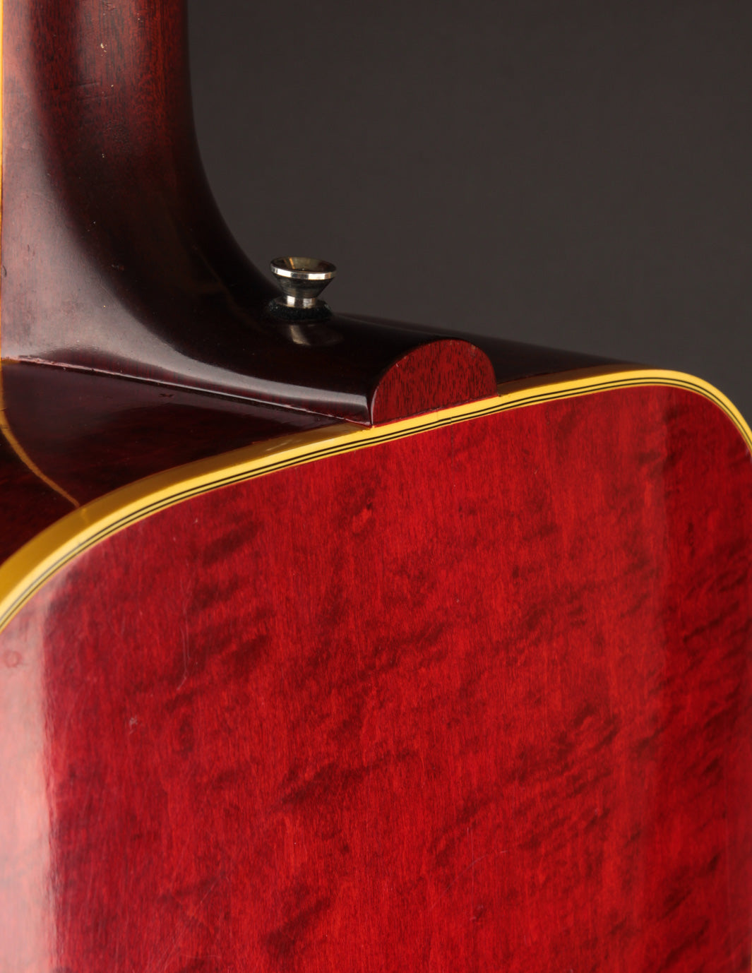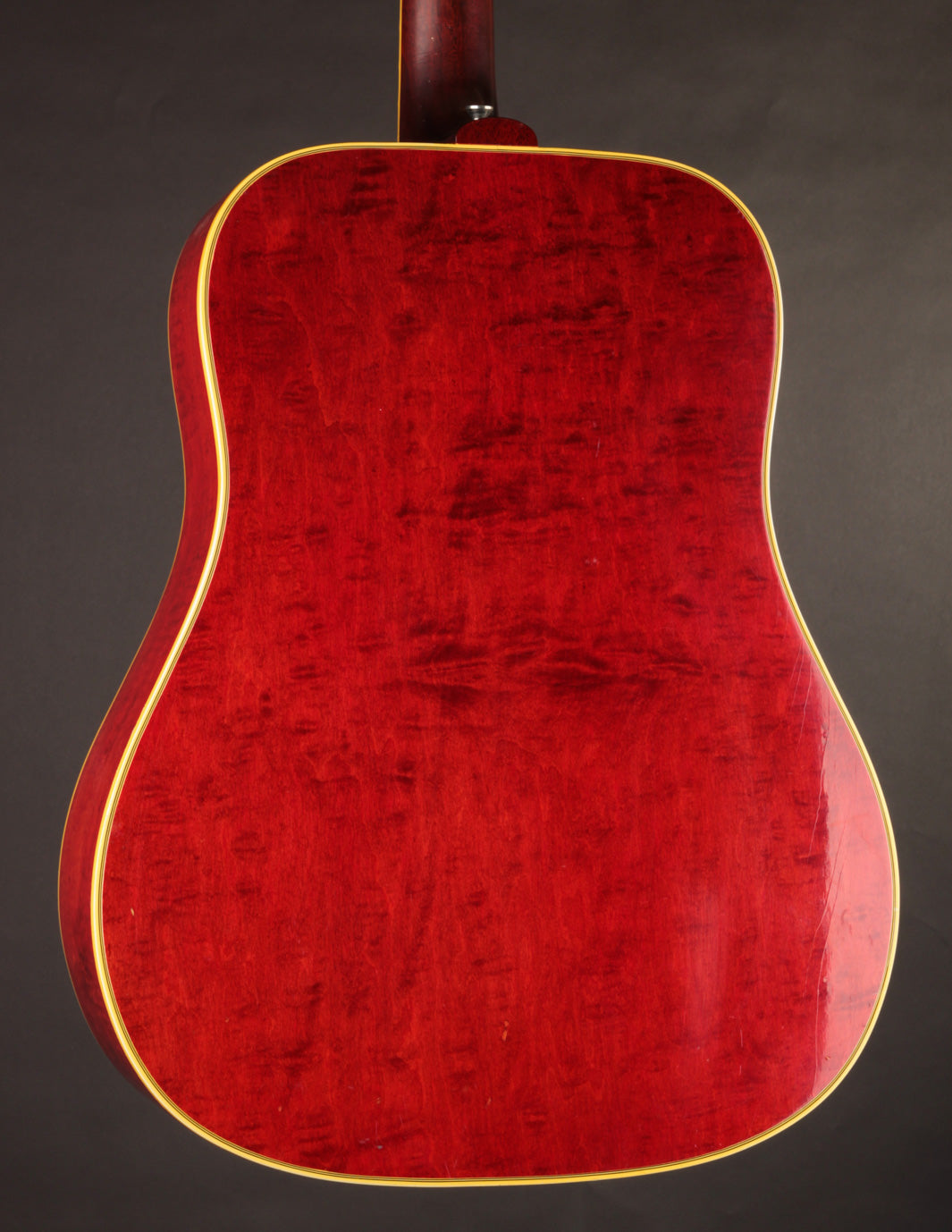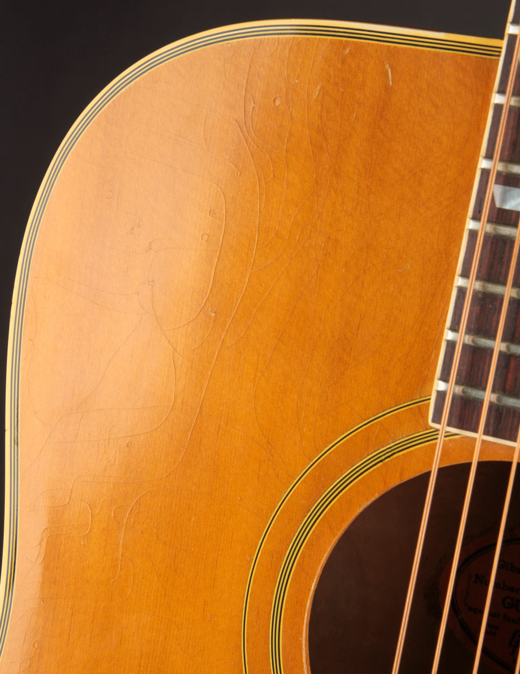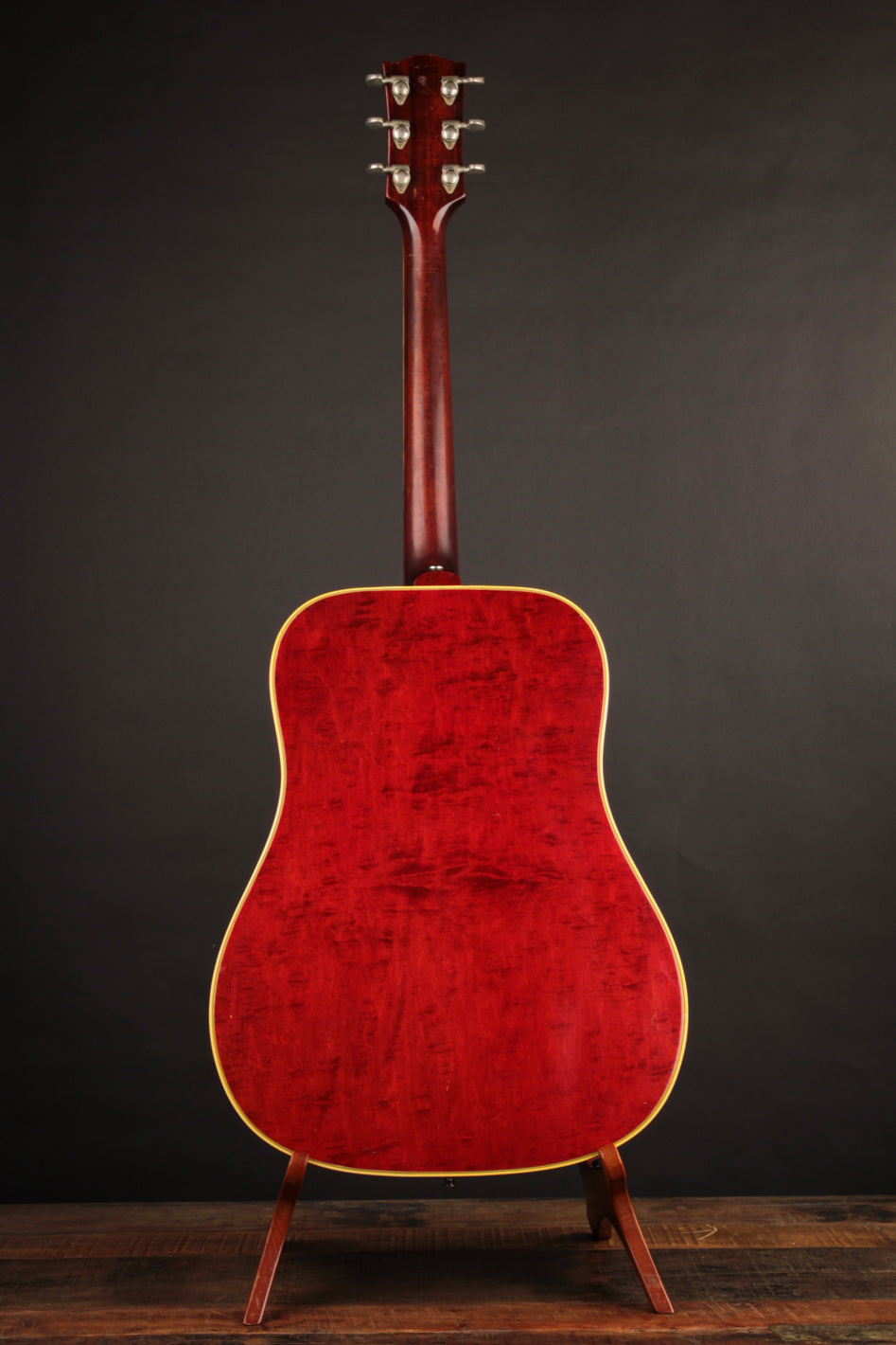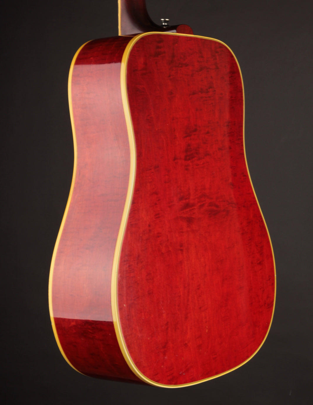 This 1968 Dove features its original Natural finish, with the Sitka Spruce top having ambered to a lovely golden hue, showing wonderful light lacquer checking throughout. The solid Maple back and sides show off their bold red finish with lovely curl and figure. The star of the show - the pickguard - is a beautiful vintage example acquired from an old Gibson repair shop and installed in-house to replace the original that had disintegrated. Although there's signs of play wear commensurate with a 55 year old guitar, it remains healthy and stable.