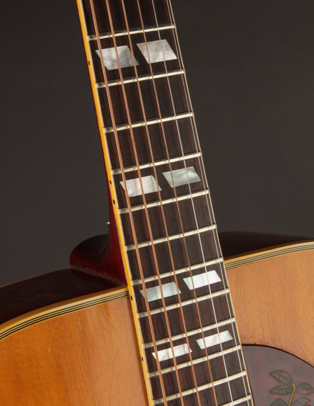 The slim to medium C carve Mahogany neck features a bound Rosewood fingerboard with parallelogram inlays and the original frets. Playability is smooth and fast, with a moderate taper up the neck. The original Grover Rotomatic tuners work great as well.