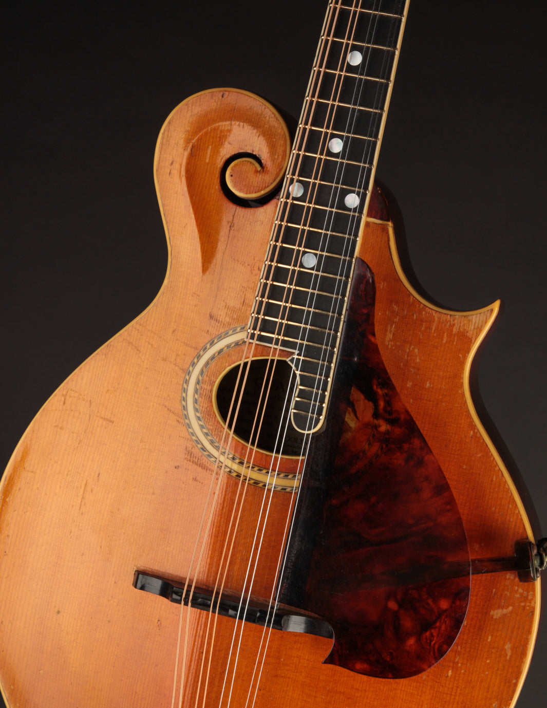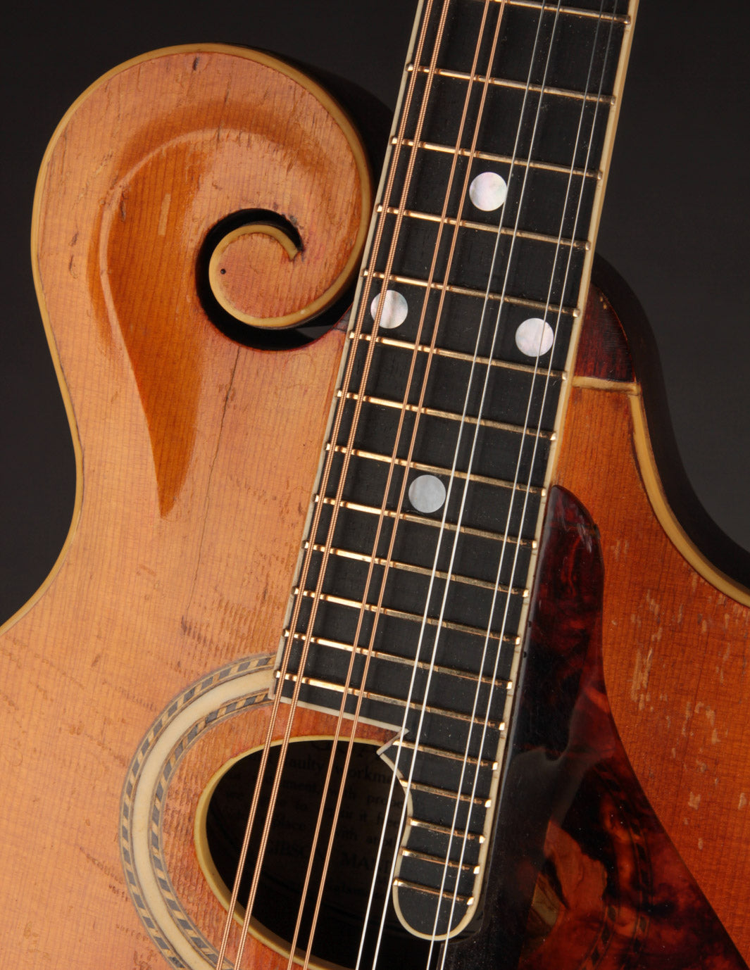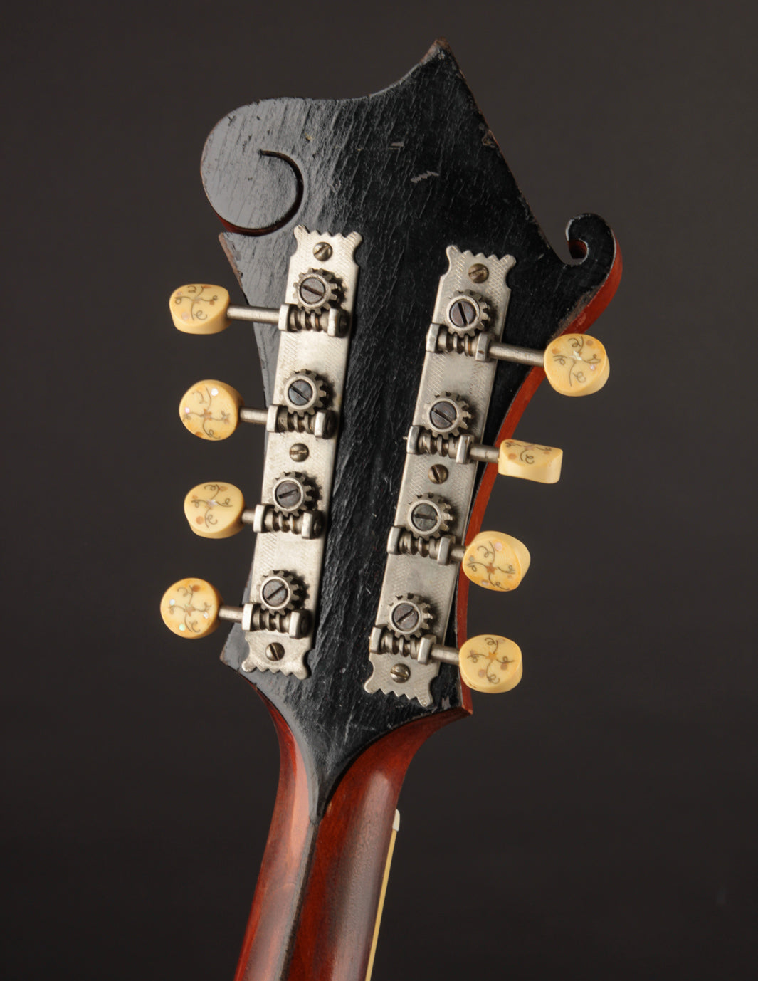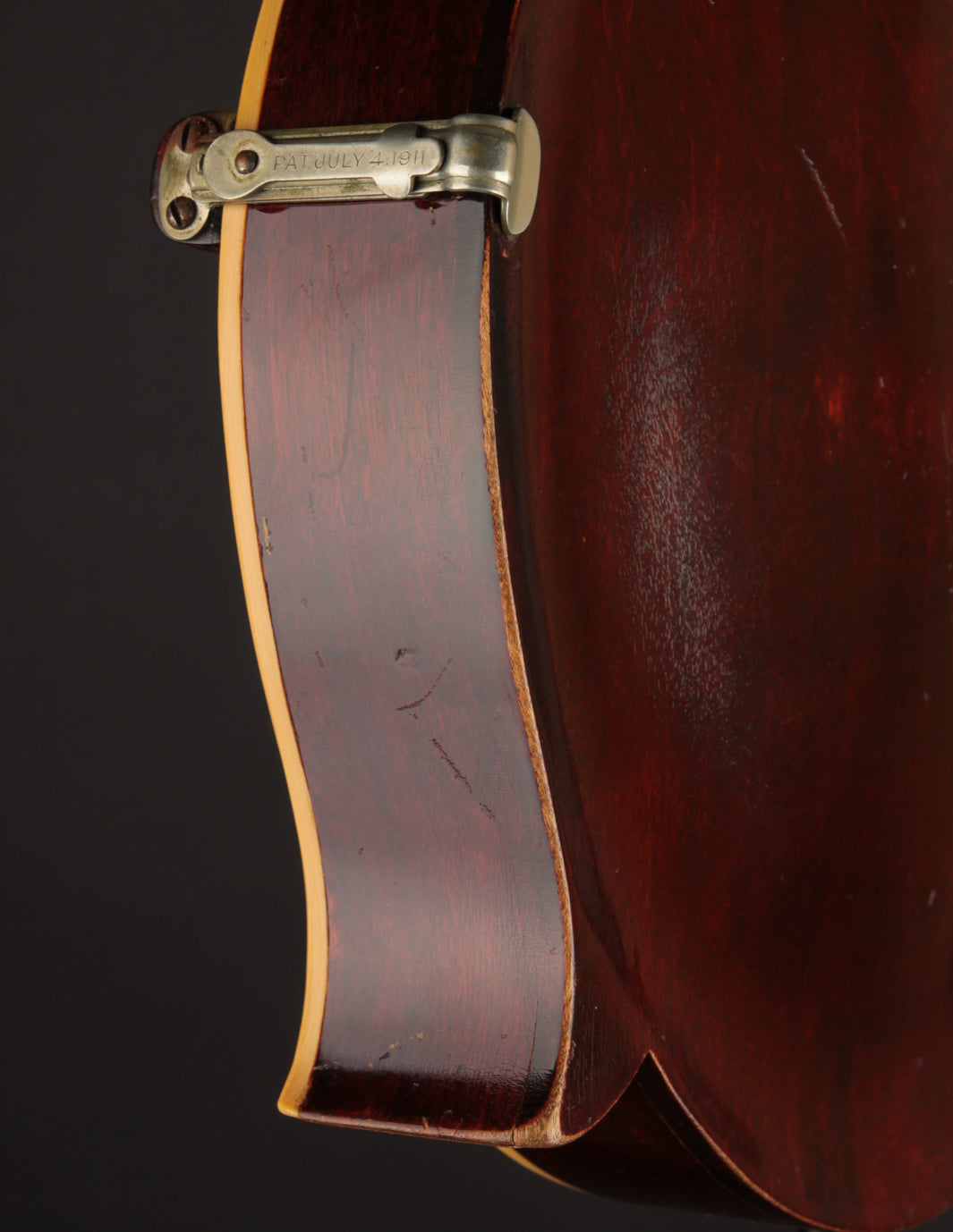 This great sounding, vintage F-2 just got a new lease on life, thanks to a pro, EVO-wire refret and setup. Strange as it may seem, the refret seems to have enhanced the lively voice of the mandolin. Playability is, of course, outstanding. We are suckers for the older, bulb-post Handel engraved tuners, still functioning well at well over 100 years old. Plenty of typical playwear, and stable surface cracks (below scroll and at lower-bount point), but otherwise in very good overall condition.