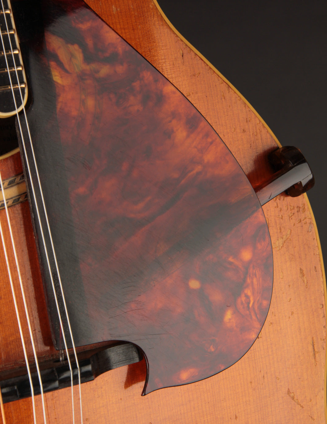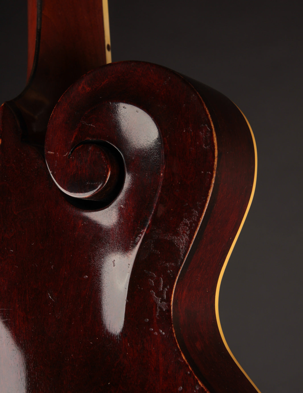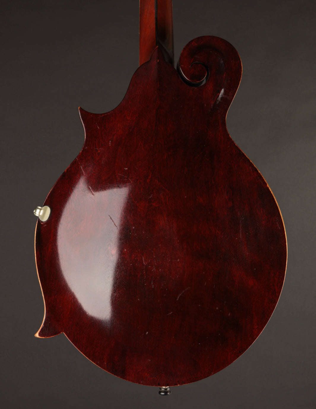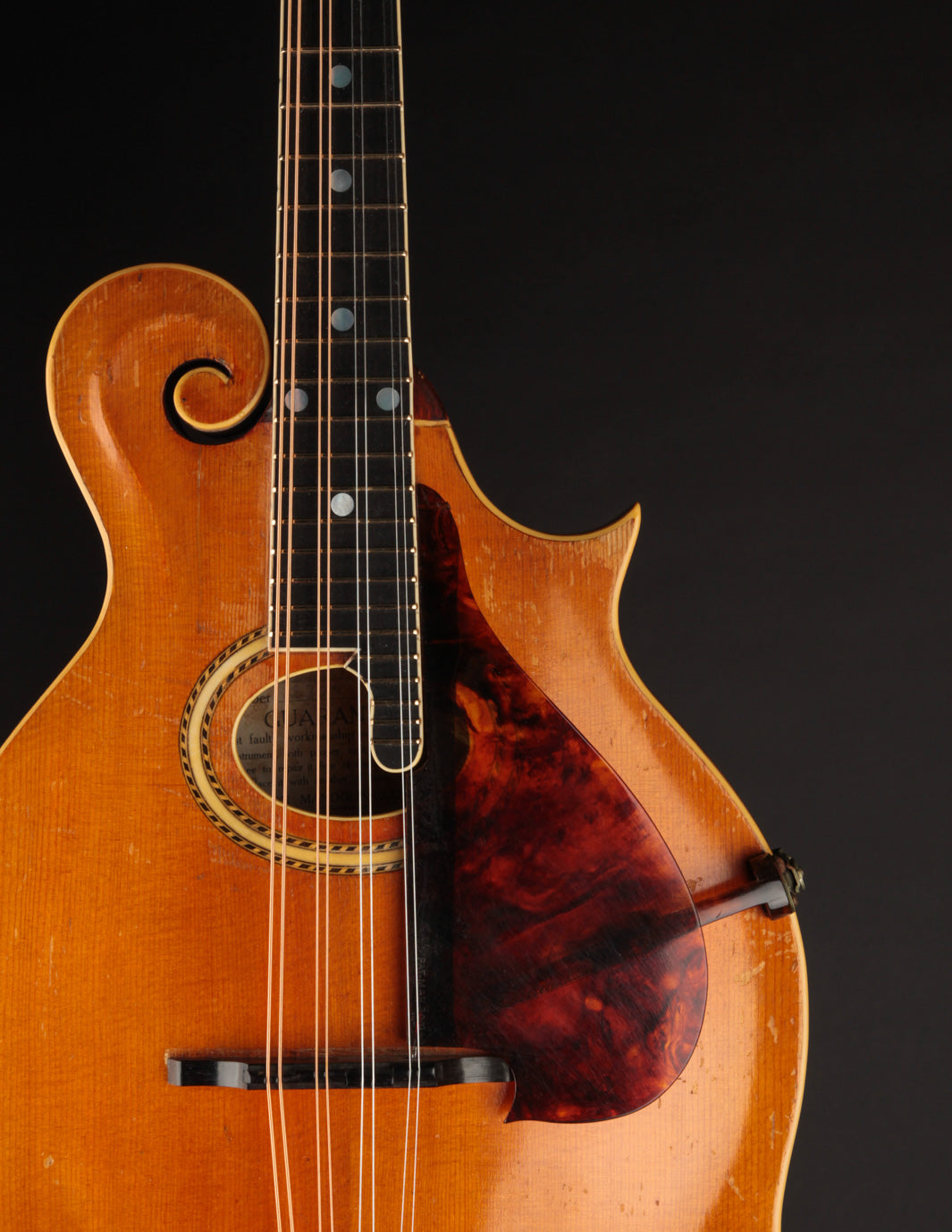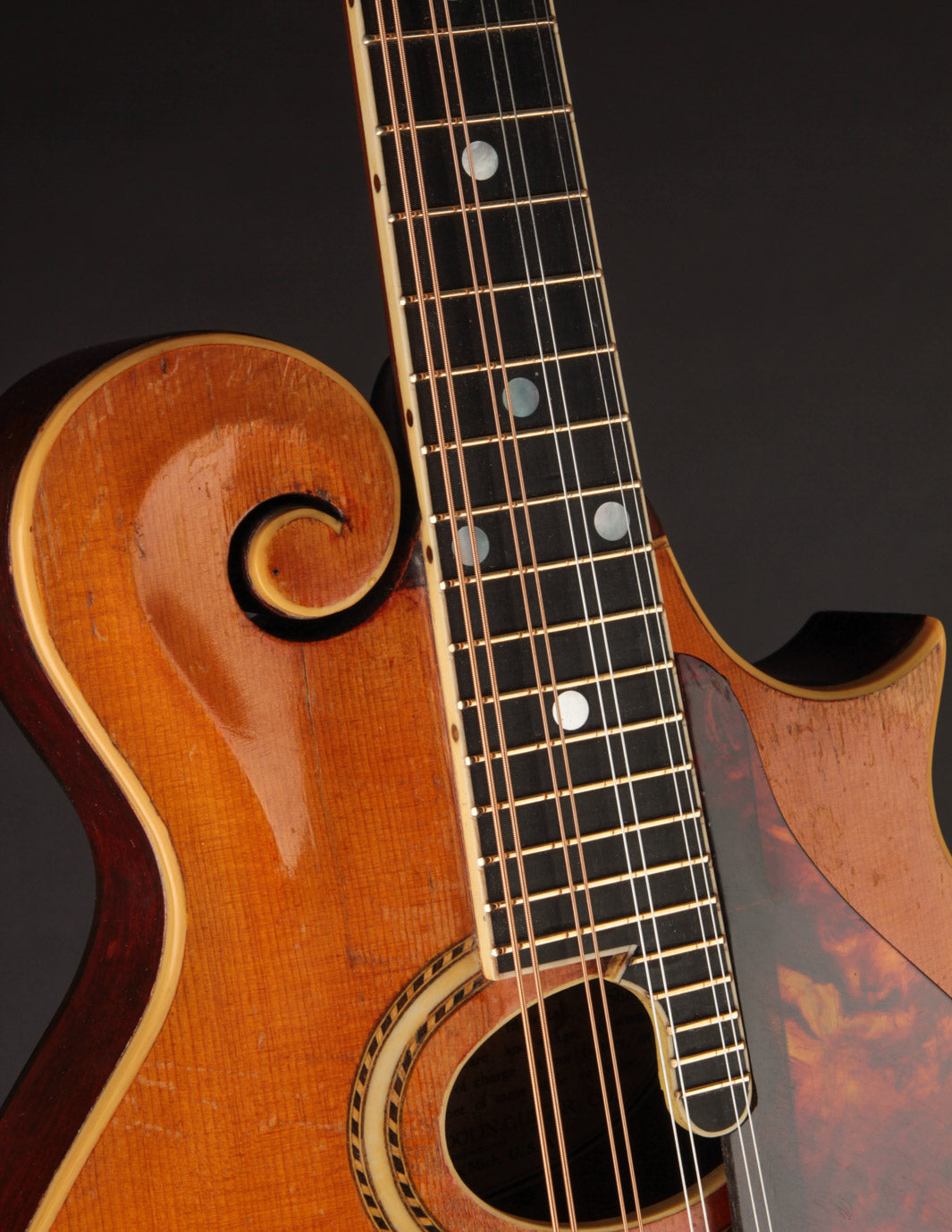 This great sounding, vintage F-2 just got a new lease on life, thanks to a pro, EVO-wire refret and setup. Strange as it may seem, the refret seems to have enhanced the lively voice of the mandolin. Playability is, of course, outstanding. We are suckers for the older, bulb-post Handel engraved tuners, still functioning well at well over 100 years old. Plenty of typical playwear, and stable surface cracks (below scroll and at lower-bount point), but otherwise in very good overall condition.