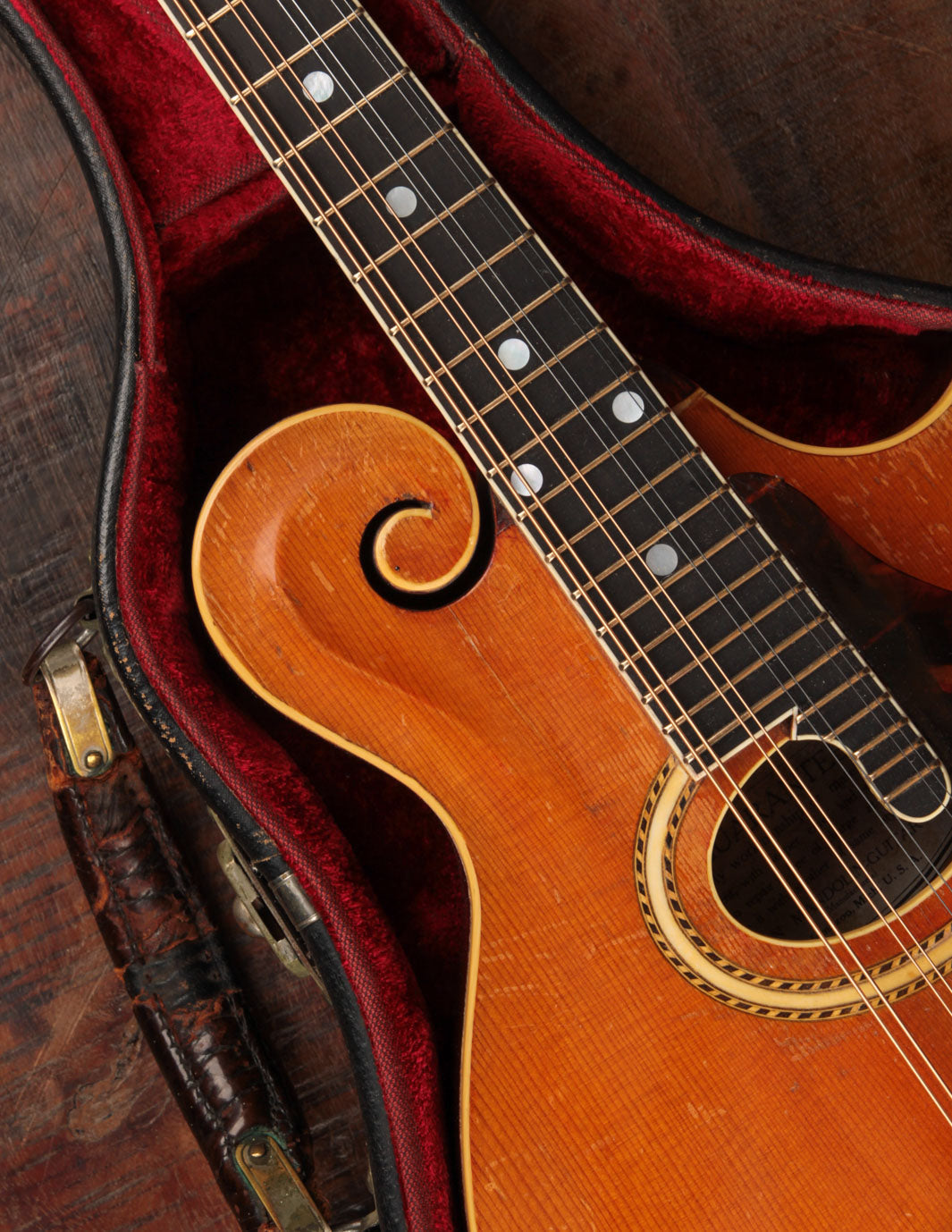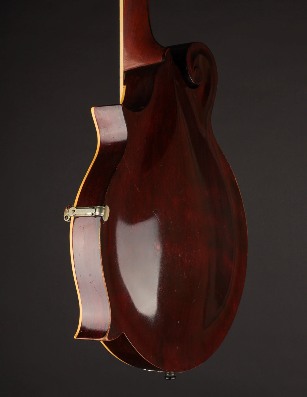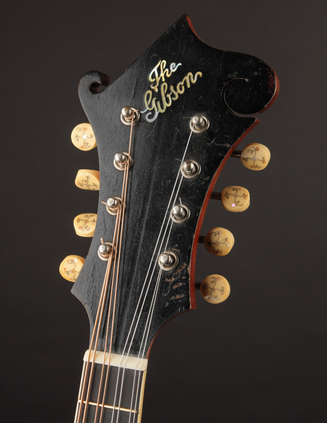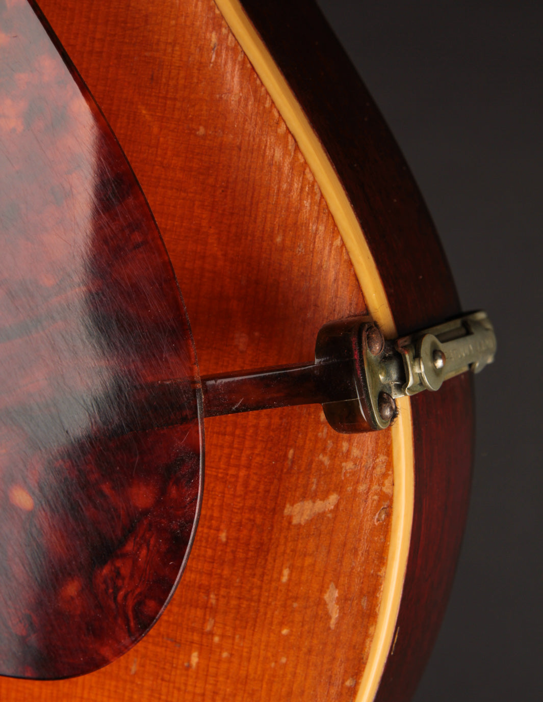 This great sounding, vintage F-2 just got a new lease on life, thanks to a pro, EVO-wire refret and setup. Strange as it may seem, the refret seems to have enhanced the lively voice of the mandolin. Playability is, of course, outstanding. We are suckers for the older, bulb-post Handel engraved tuners, still functioning well at well over 100 years old. Plenty of typical playwear, and stable surface cracks (below scroll and at lower-bount point), but otherwise in very good overall condition.