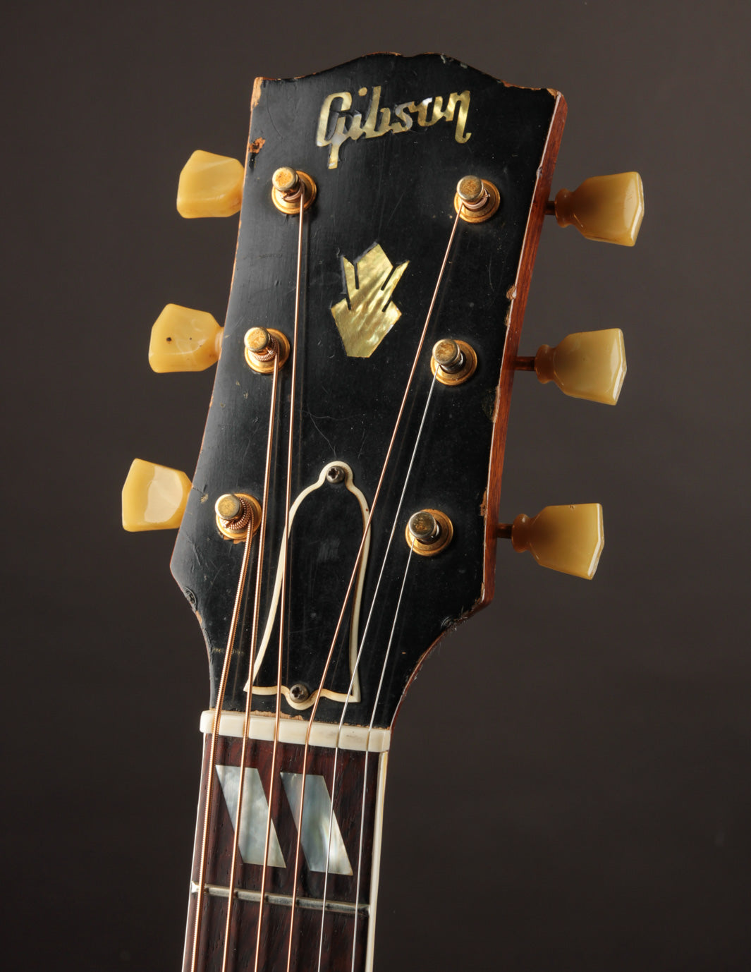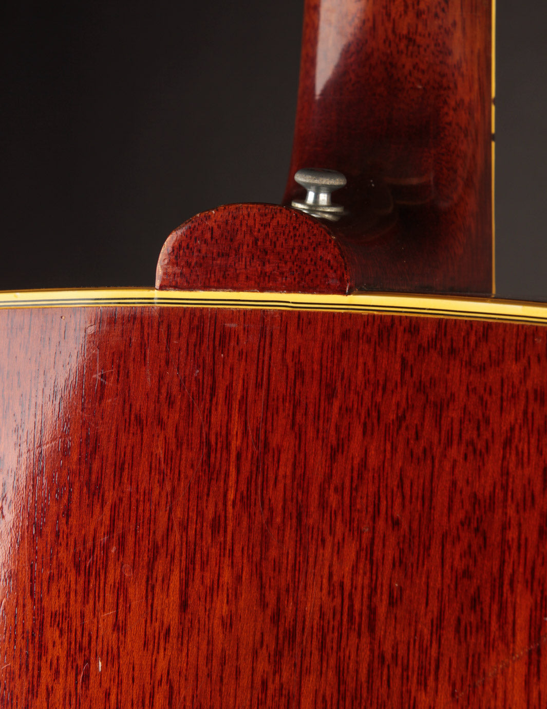 We rate this guitar in very good overall vintage condition. The finish shows expected checking; and there is mild scratching on the back from shirt buttons. There's localized, brushed-on finish touch-up on areas of bare wood near the sound hole. The original bridge has been replaced. Our shop has checked the entire guitar's structure for stability & given it a fresh setup. Priced with a non-original thermoplastic hard case.