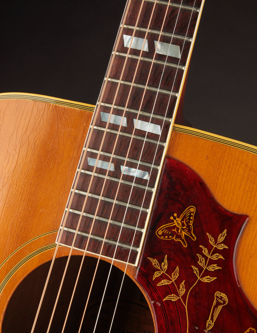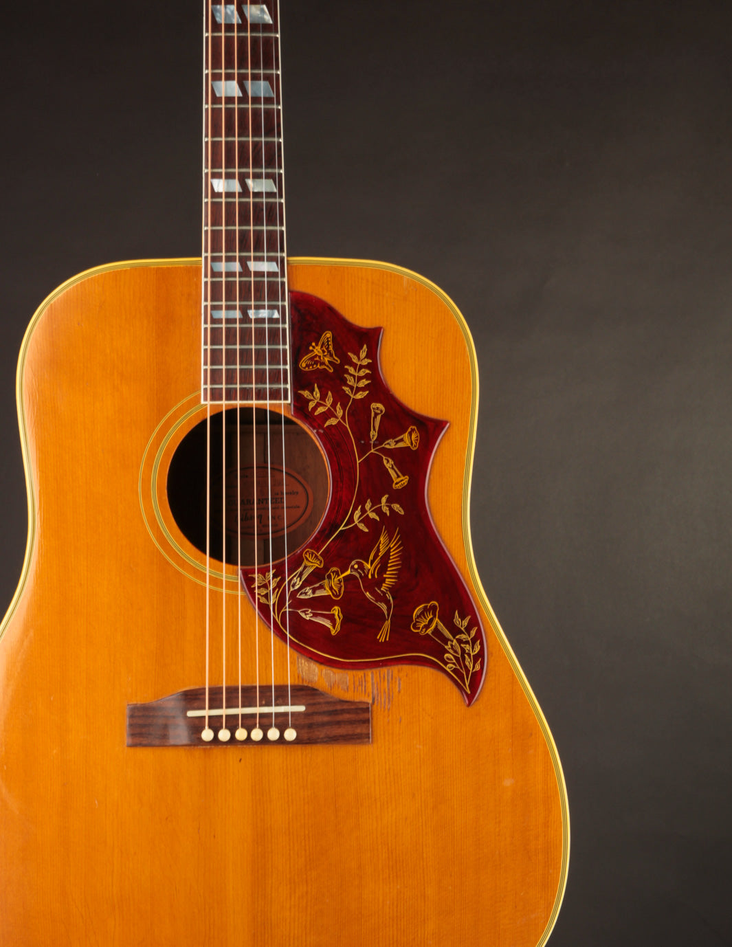 This great-sounding 1964 Gibson Hummingbird has just arrived for consignment! We're leading with description of the sound, because that's what's important here. If finish touch ups or replaced bridges bother you, keep on scrolling. But if you've been in the market for a warm, thumpy-sounding, wide-neck Hummingbird that still manages to sound clear and chimey -- this is your guitar. It's very resonant in-hand; and chording all over the neck, whether open or with a capo, yields the present, compressed attack that microphones love to devour. A fantastic recording guitar!