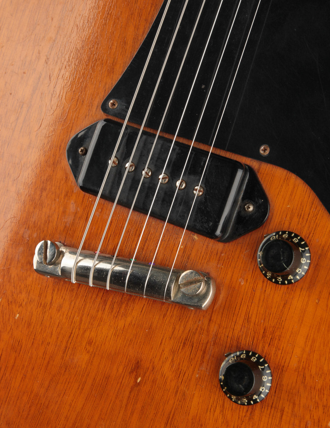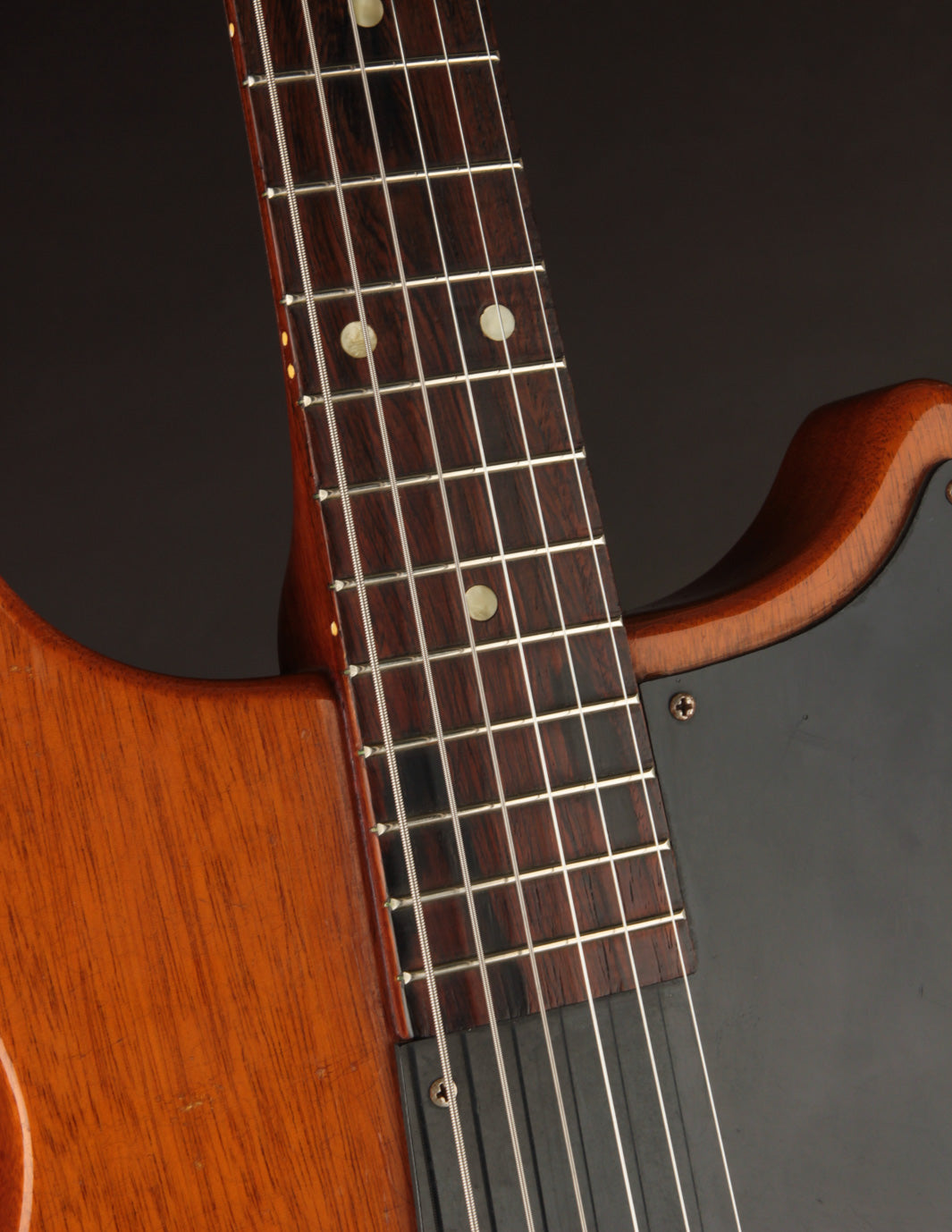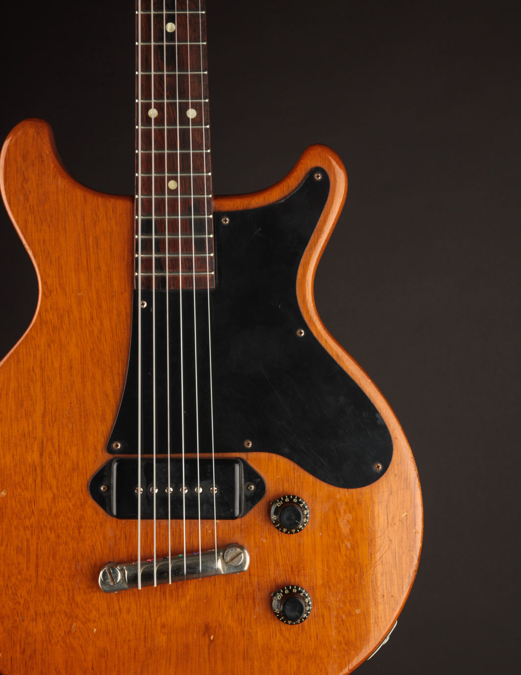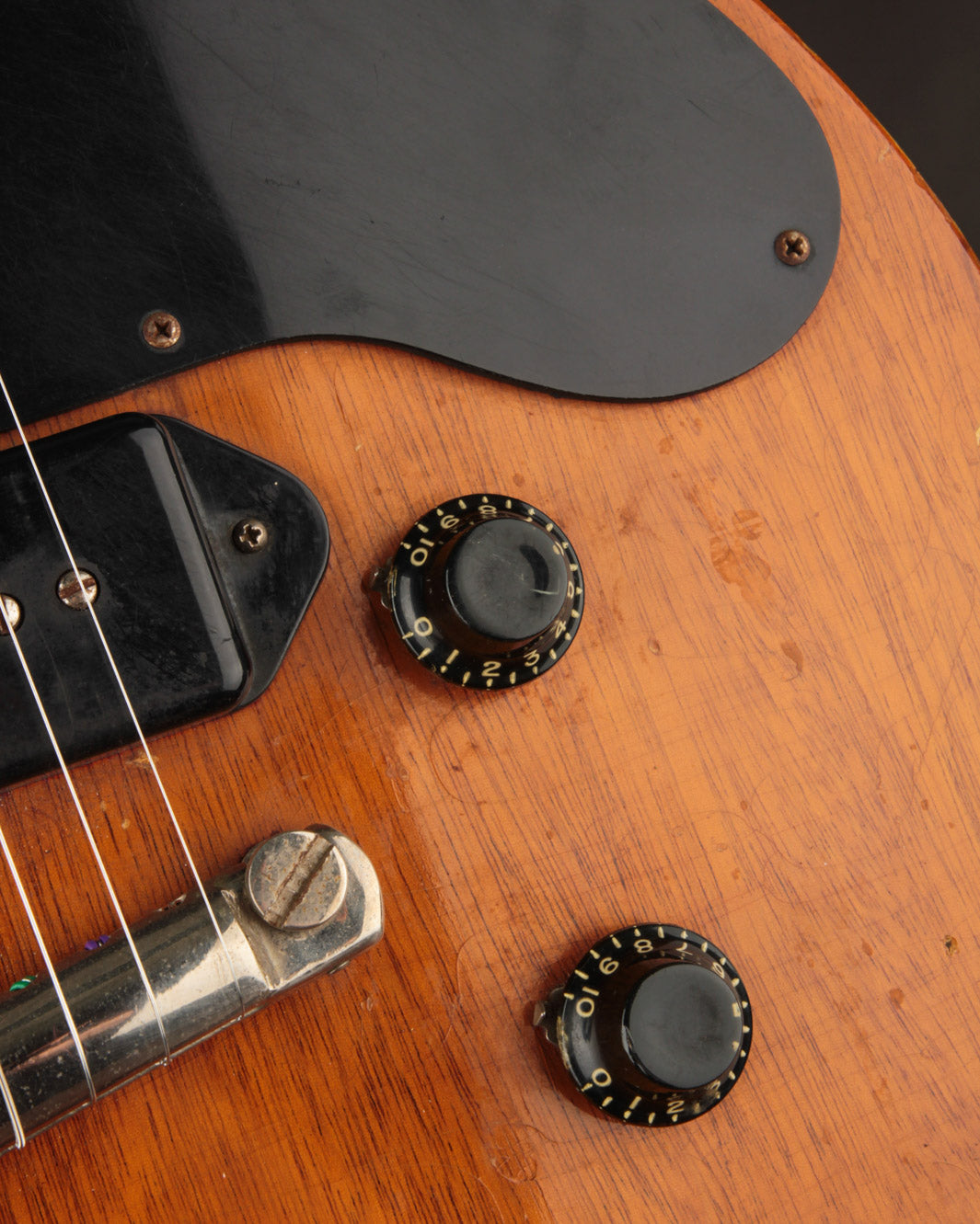 No surprise here, but the original P90 in this guitar absolutely rips! It's got great output and combination of chime and grunt that have made many a Junior-style guitar a go-to option for rock tones, slide work, and beyond. The original small fretwire remains in great shape and feels great in hand, and the narrow nut combined with the full C profile makes for a super fun playing experience. The volume pot was replaced prior to our acquisition, and it received a new nut, but remains otherwise original.