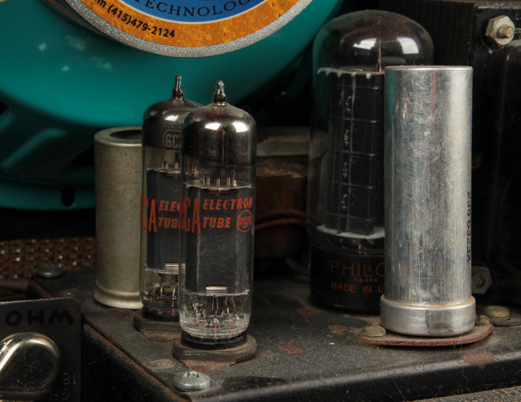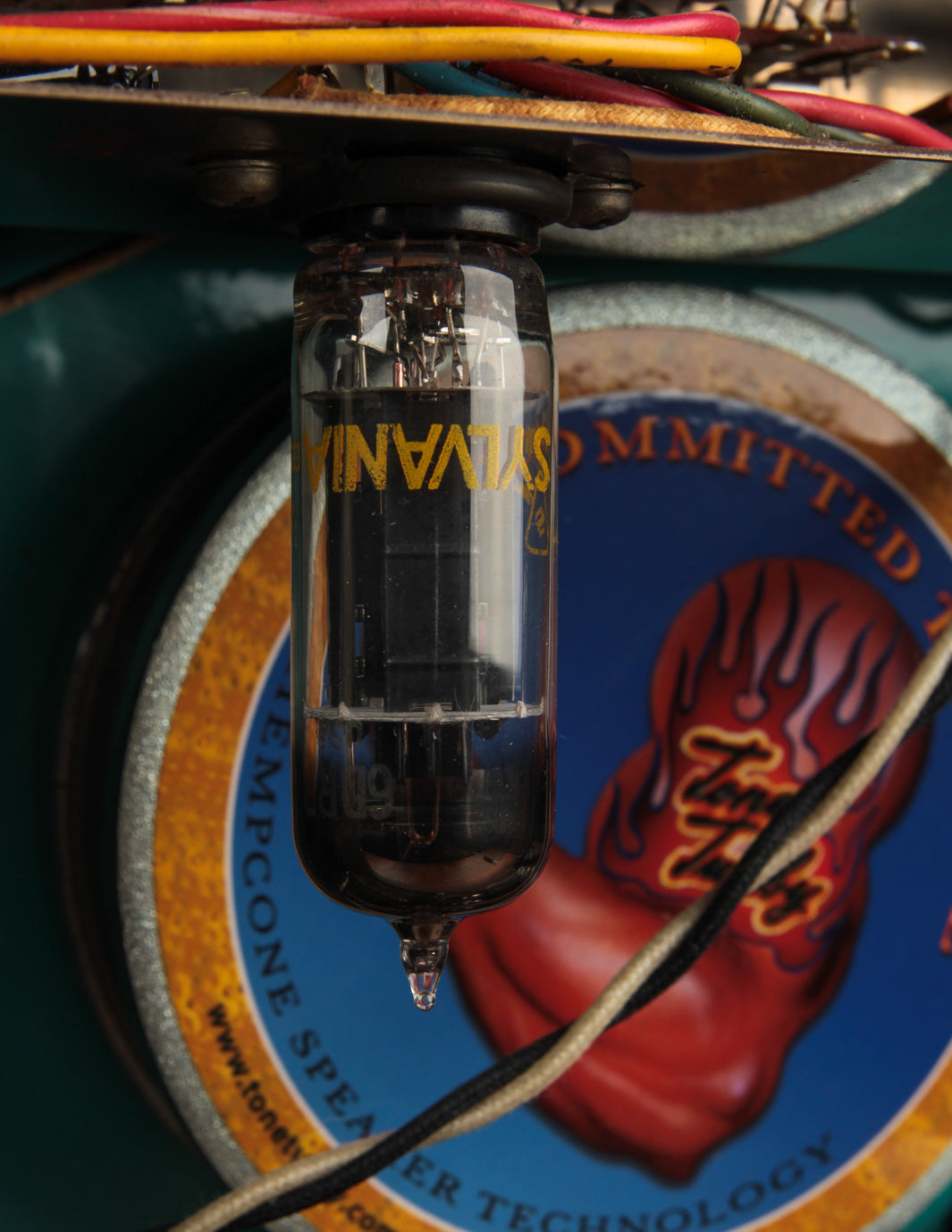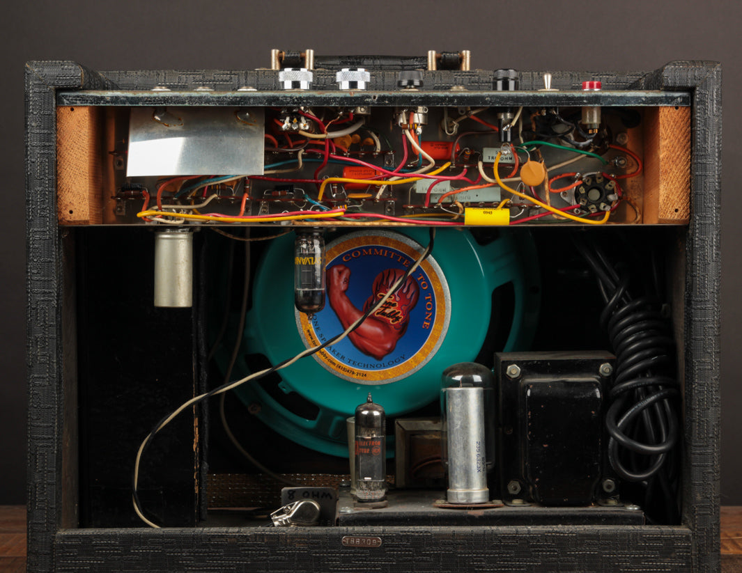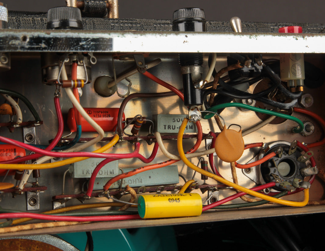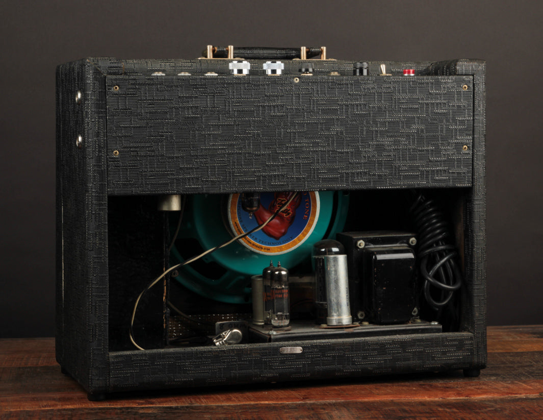 The circuit combines a unique top-mounted preamp chassis utilizing a 12AX7, 6DR7, and 6EU7 along with a separate power amp chassis using dual 6973 power tubes and a 5U4 rectifier. With simple but effective controls and Valco's quirky "shoebox" reverb circuit, you've got a great low-powered combo that excels in a small club gig setting or in the studio.