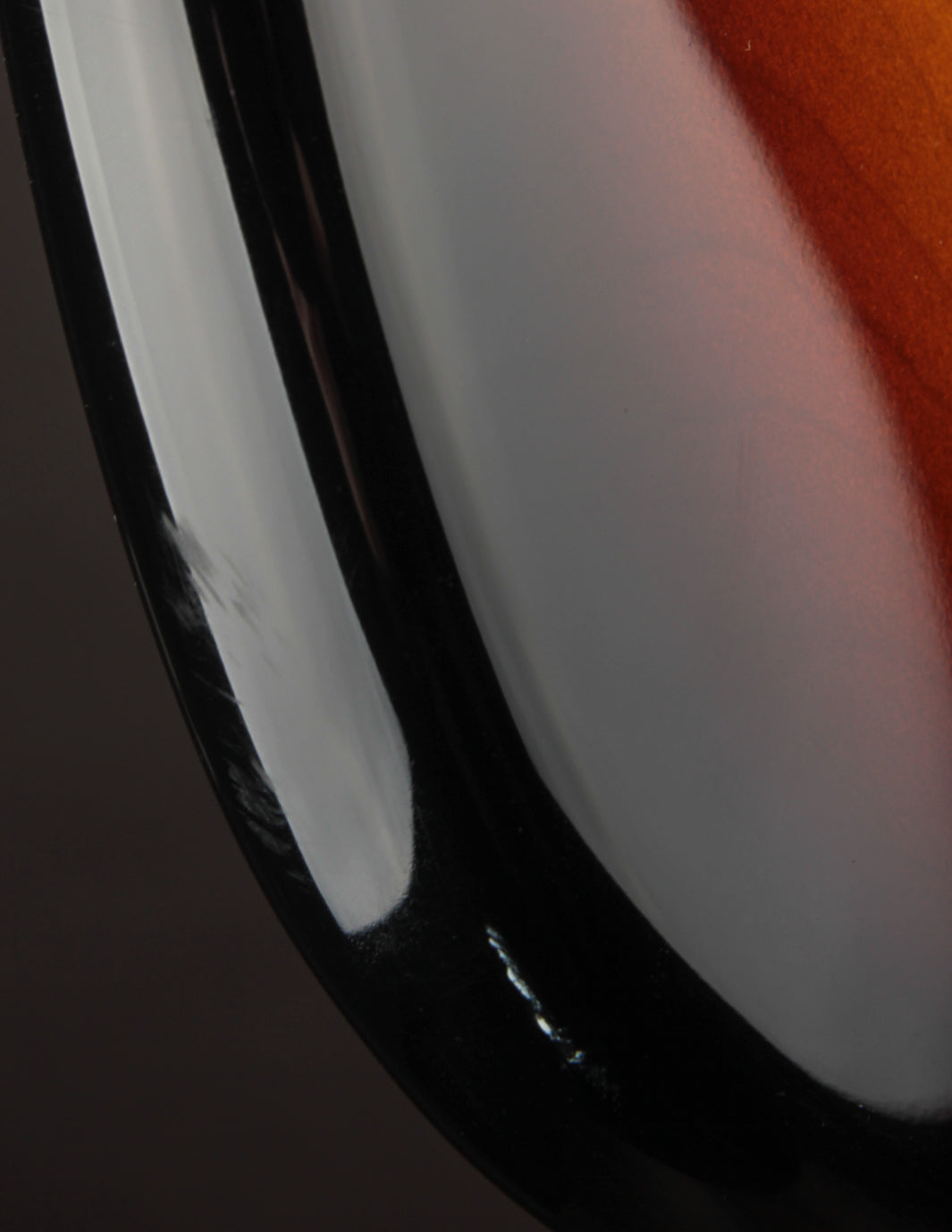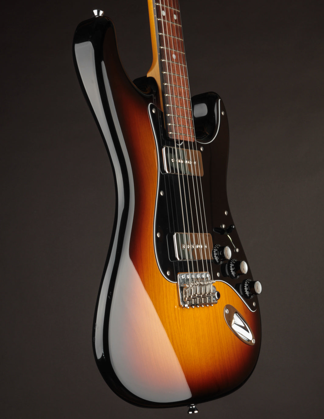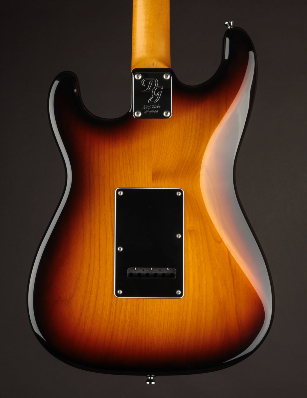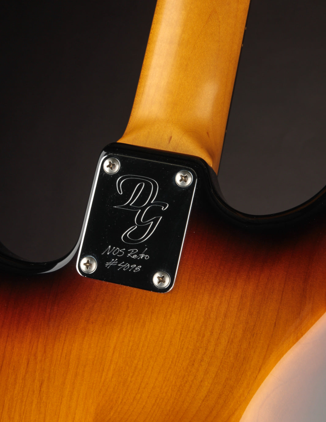 59 Burst Alder body, maple neck/Indian Rosewood fingerboard, twin Grosh G-90 pickups w/chrome covers, reflector knobs, reverse headstock painted black with a gold Grosh logo, MoP dots on just the 3,5,7, 9, 12, and 15th frets (ideas taken from a vintage S-100), white tuner buttons, and a volume for the neck pickup, a volume for the bridge pickup, and a master tone.