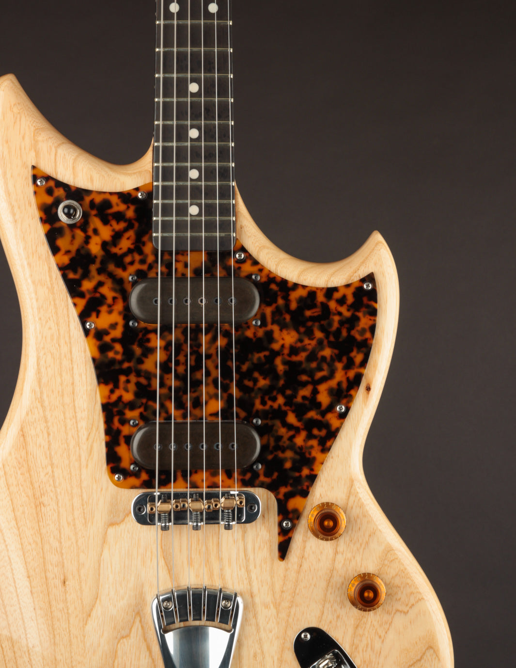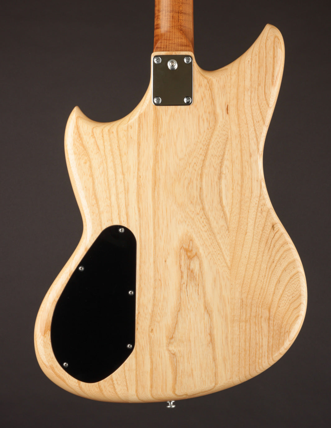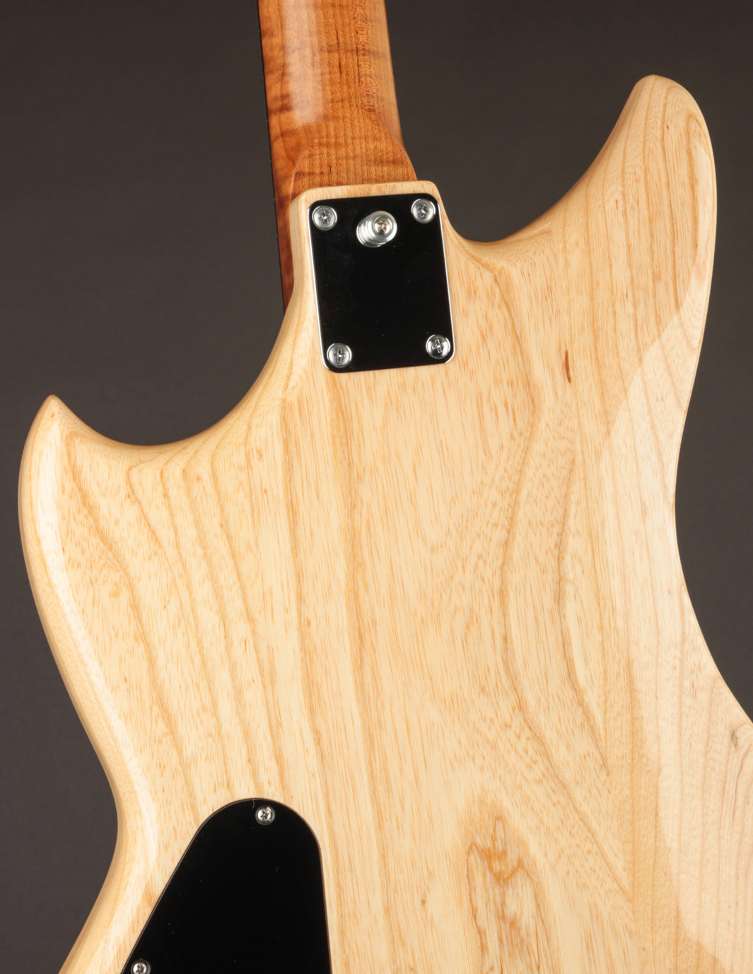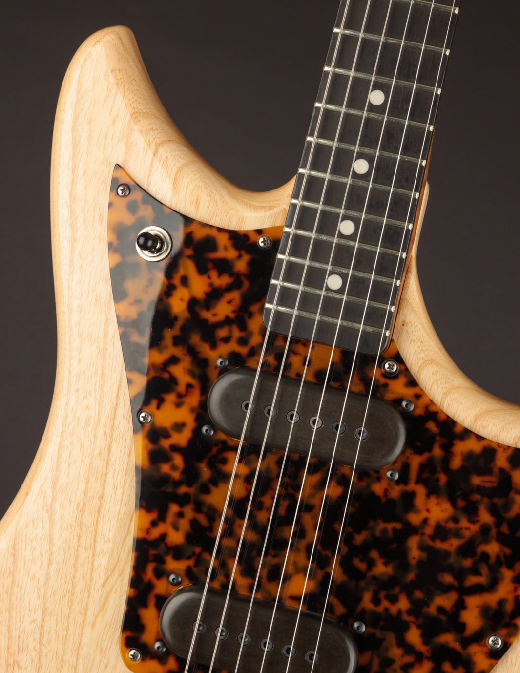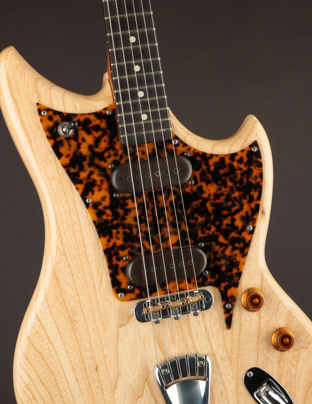 This Red Tail Hawk one's got some really cool specs that make it a truly killer example of the High Spirit offset. The natural Ash body sports a custom made acrylic dark tortoise pickguard, and is loaded with a hybrid set of Danger Dog (neck) and Hot Dog (bridge) pickups and of course, Connor's custom designed bridge a tailpiece.