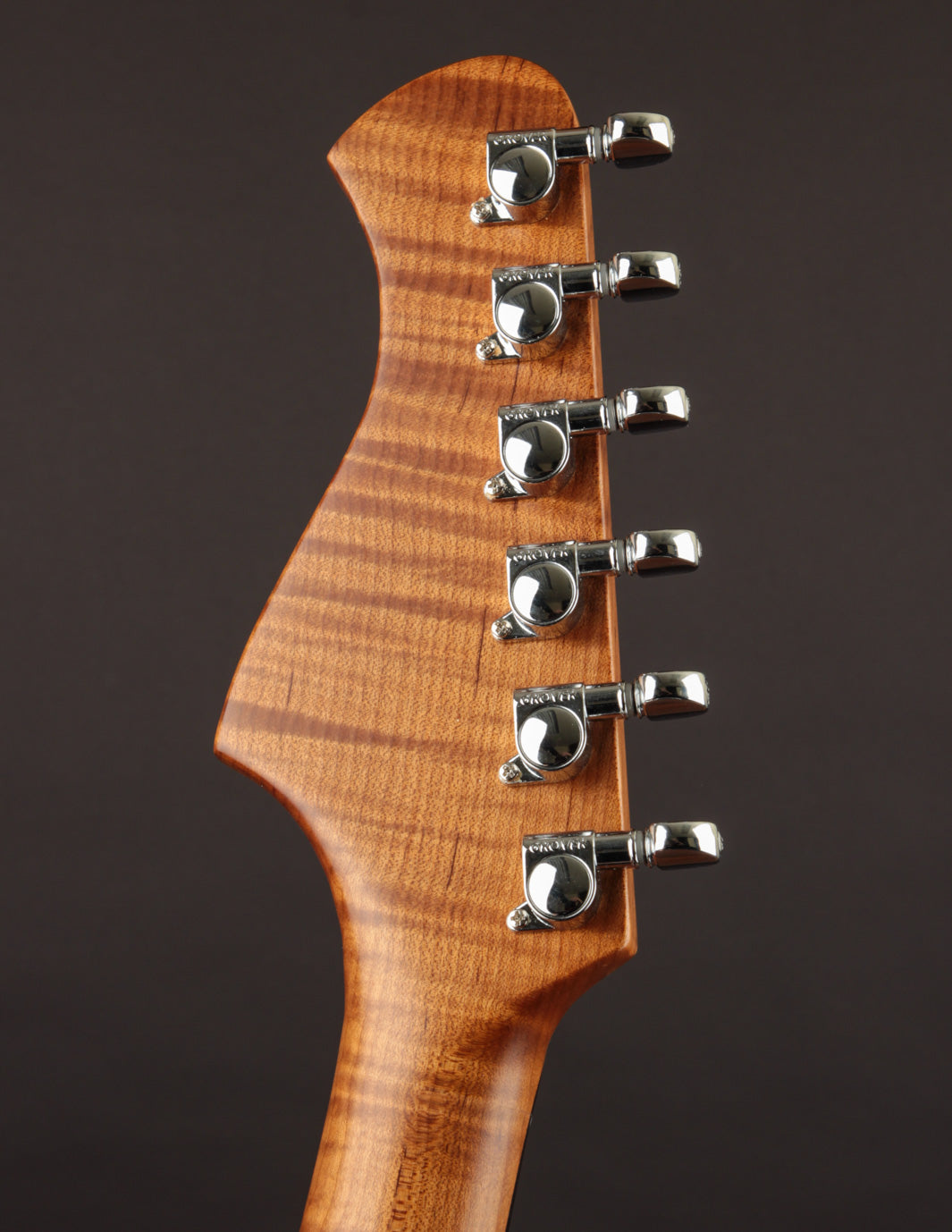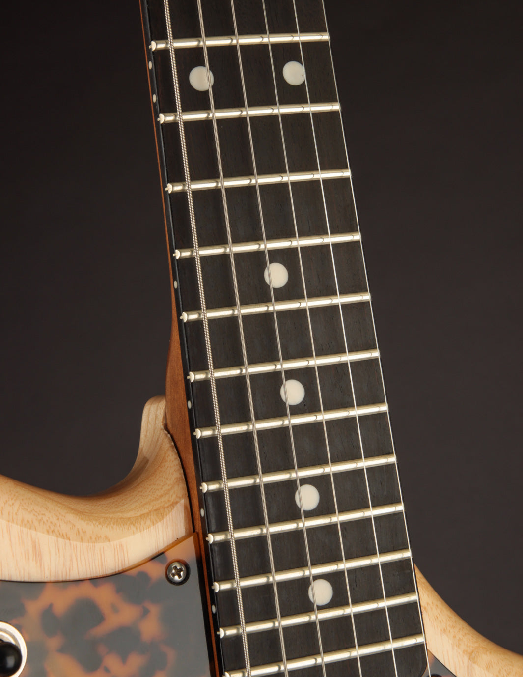 The neck is a beautifully carved piece of roasted Figured Maple and features an Ebony fingerboard, which is a first for us! The one thing we noticed is how seamlessly the Ebony board transitioned into the black-painted top of the headstock - super sleek! The medium C carve is super comfortable with a nice taper as well.