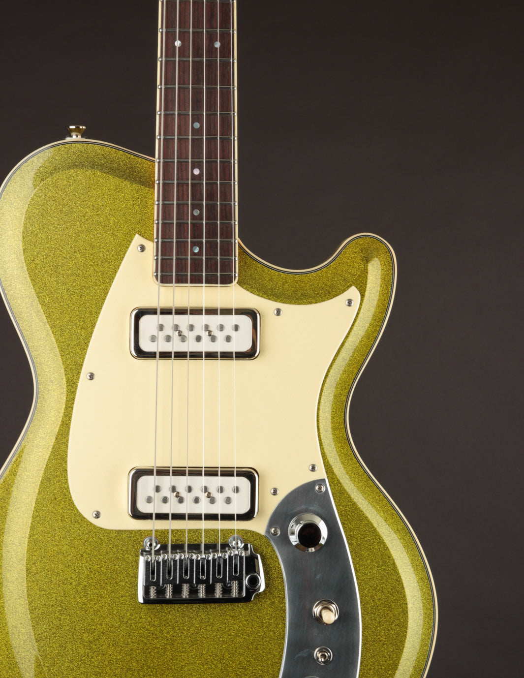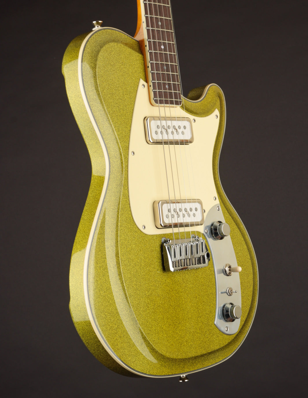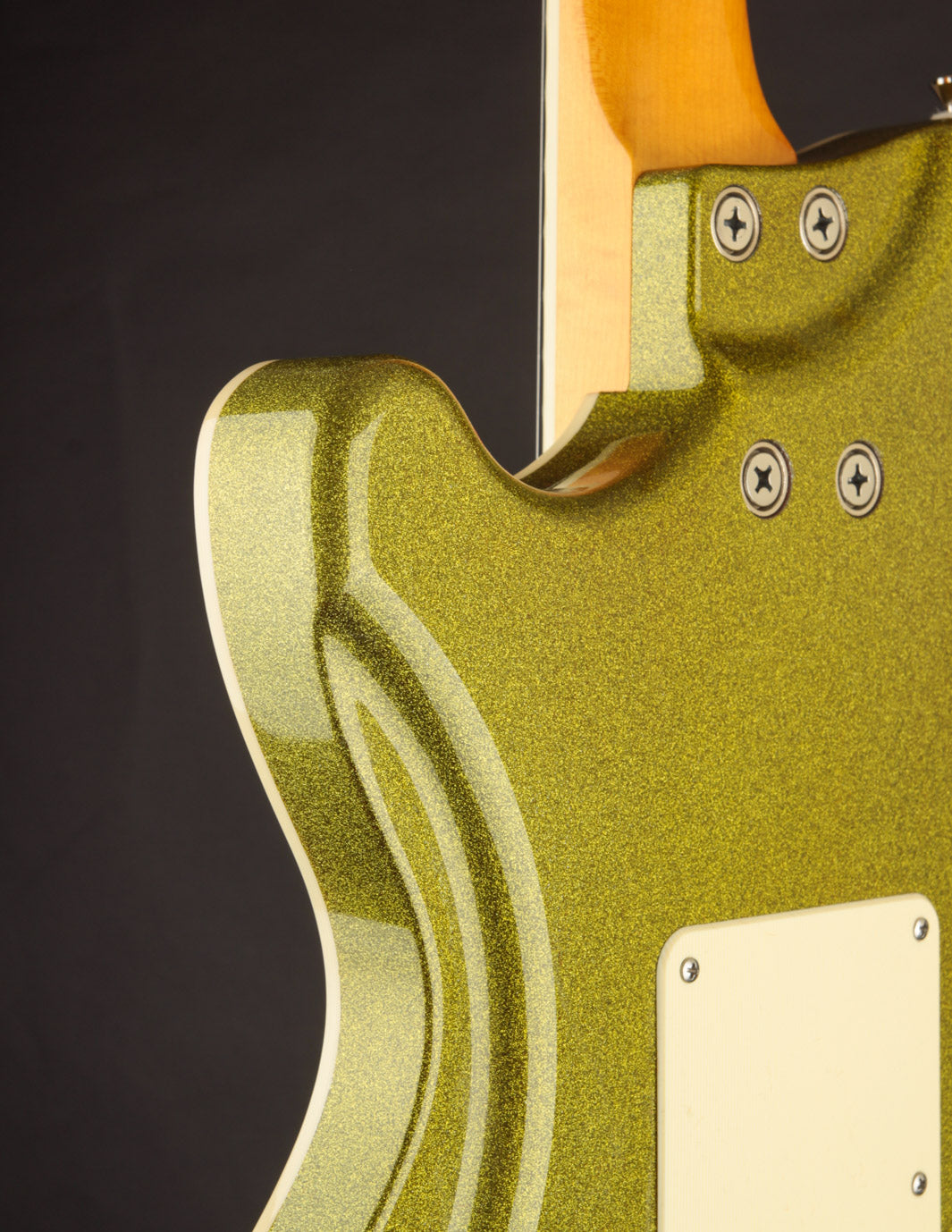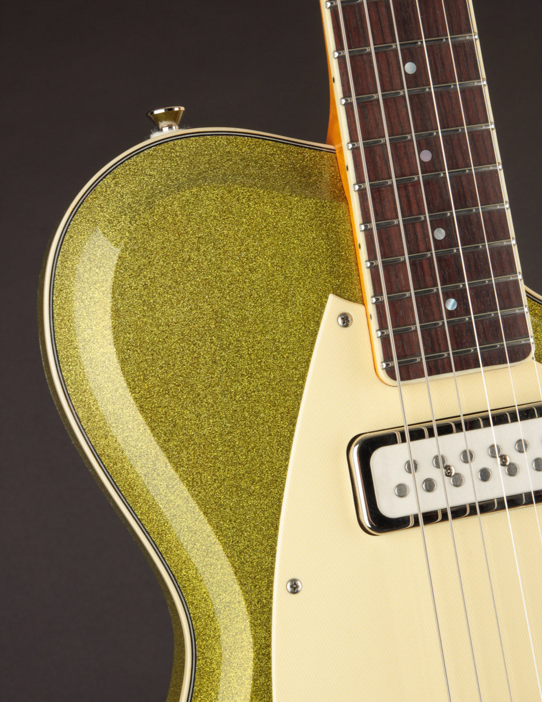 The ivoroid bound Birdseye Maple neck with an Indian Rosewood fingerboard adds a beautiful contrast to the Green Metal Flake finish, and its 60s Oval C feeling carve, 12” radius, and stainless steel frets deliver a refined/vintage/familiar feel. It’s worth mentioning here that Joe worked at Collings Guitars for 5 years, the last 3 were in the set-up department, so if you’ve played and loved a Collings electric guitar, you’ll have a really good idea of what the DMO feels and plays like in-hand. That is to say, it’s damned near flawless.