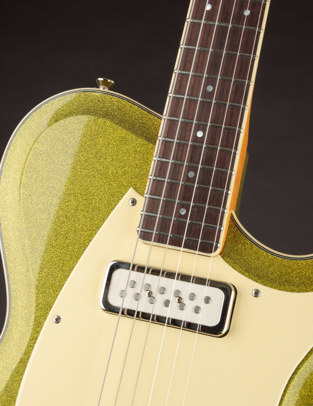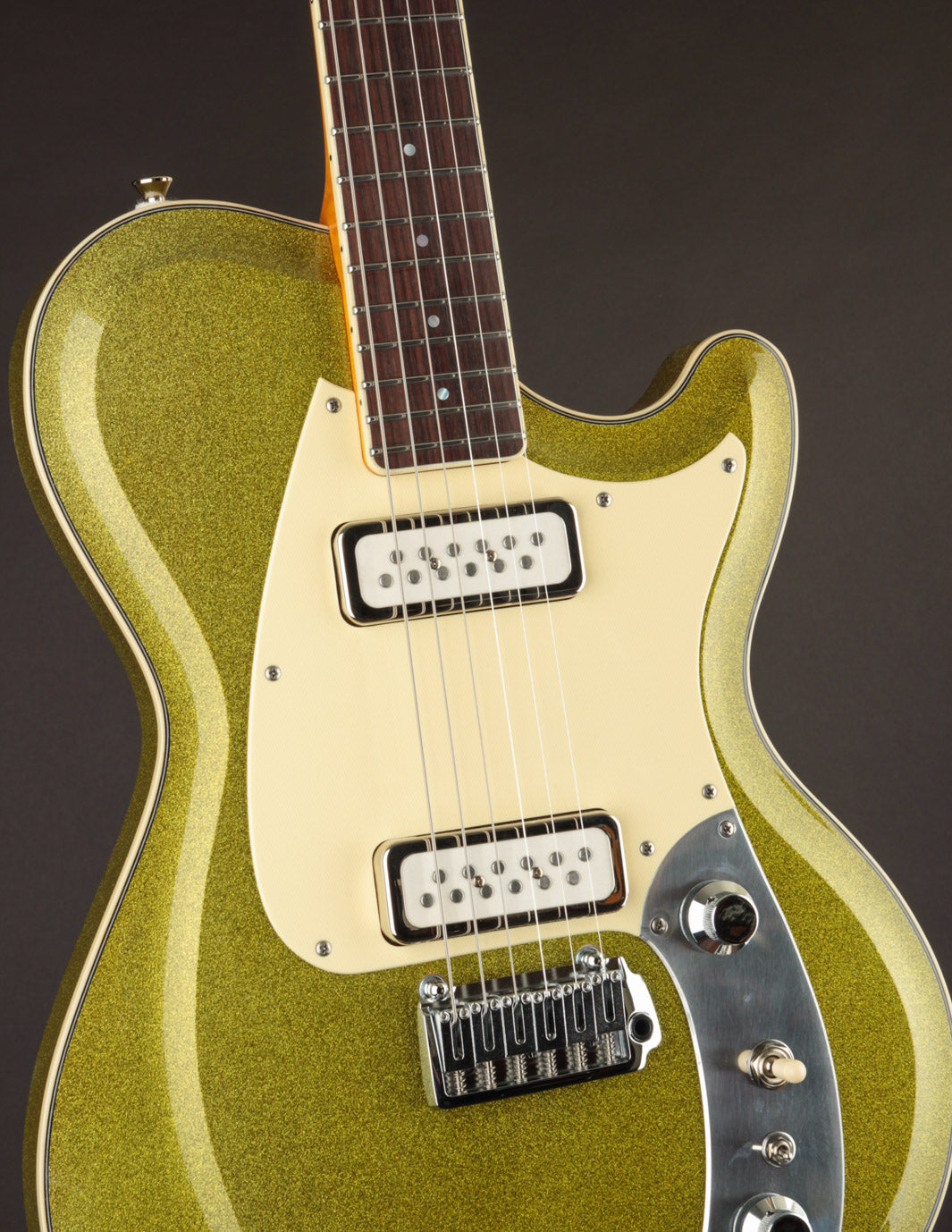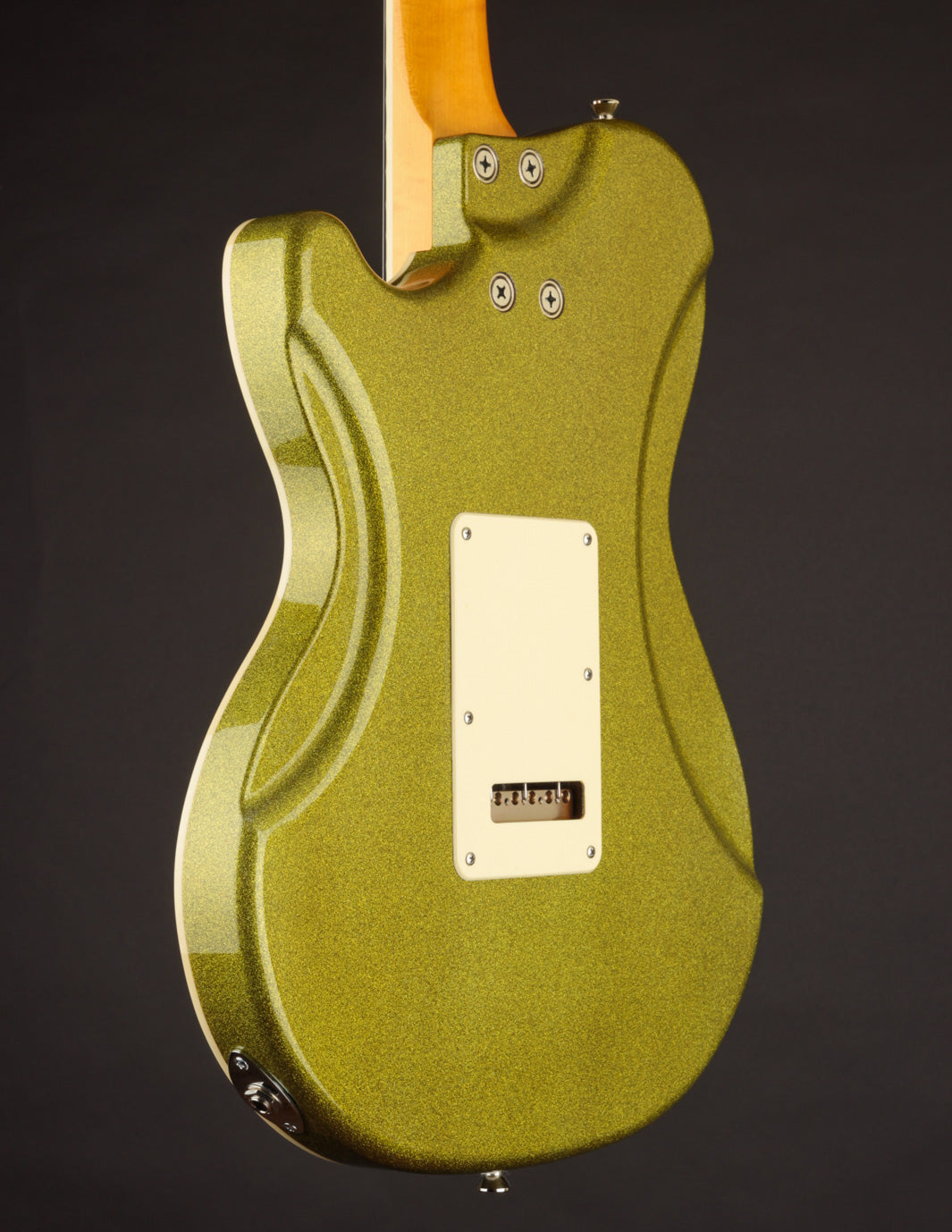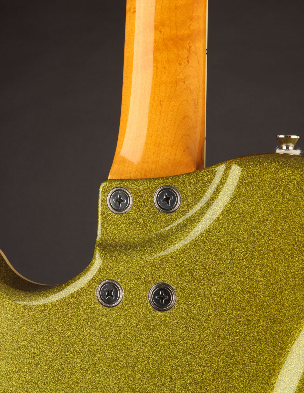 The ivoroid bound Birdseye Maple neck with an Indian Rosewood fingerboard adds a beautiful contrast to the Green Metal Flake finish, and its 60s Oval C feeling carve, 12” radius, and stainless steel frets deliver a refined/vintage/familiar feel. It’s worth mentioning here that Joe worked at Collings Guitars for 5 years, the last 3 were in the set-up department, so if you’ve played and loved a Collings electric guitar, you’ll have a really good idea of what the DMO feels and plays like in-hand. That is to say, it’s damned near flawless.