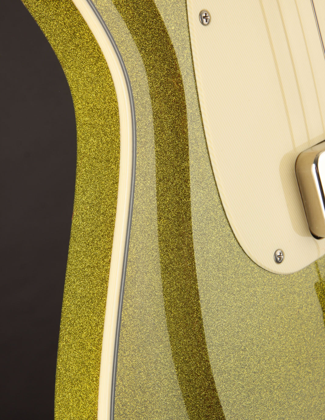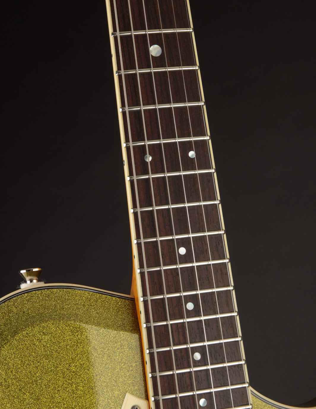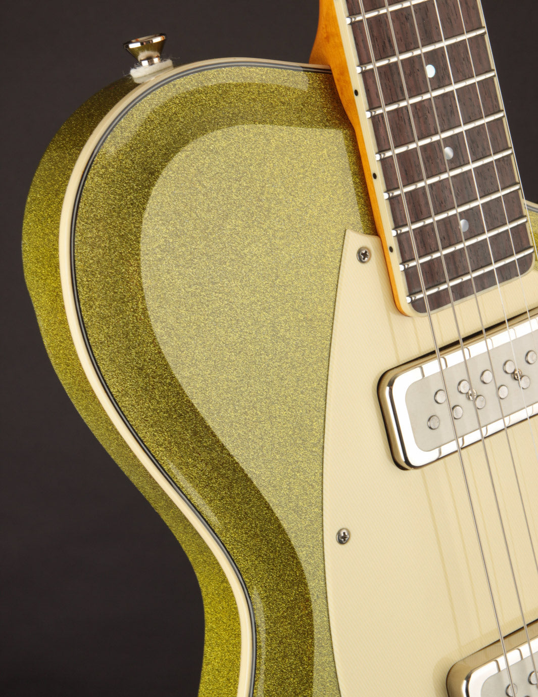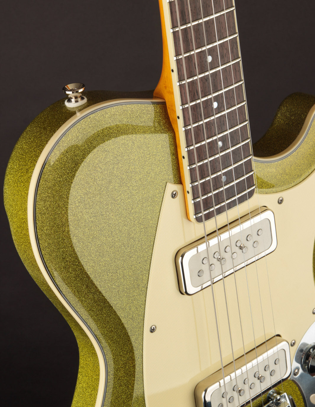 The ivoroid bound Birdseye Maple neck with an Indian Rosewood fingerboard adds a beautiful contrast to the Green Metal Flake finish, and its 60s Oval C feeling carve, 12” radius, and stainless steel frets deliver a refined/vintage/familiar feel. It’s worth mentioning here that Joe worked at Collings Guitars for 5 years, the last 3 were in the set-up department, so if you’ve played and loved a Collings electric guitar, you’ll have a really good idea of what the DMO feels and plays like in-hand. That is to say, it’s damned near flawless.