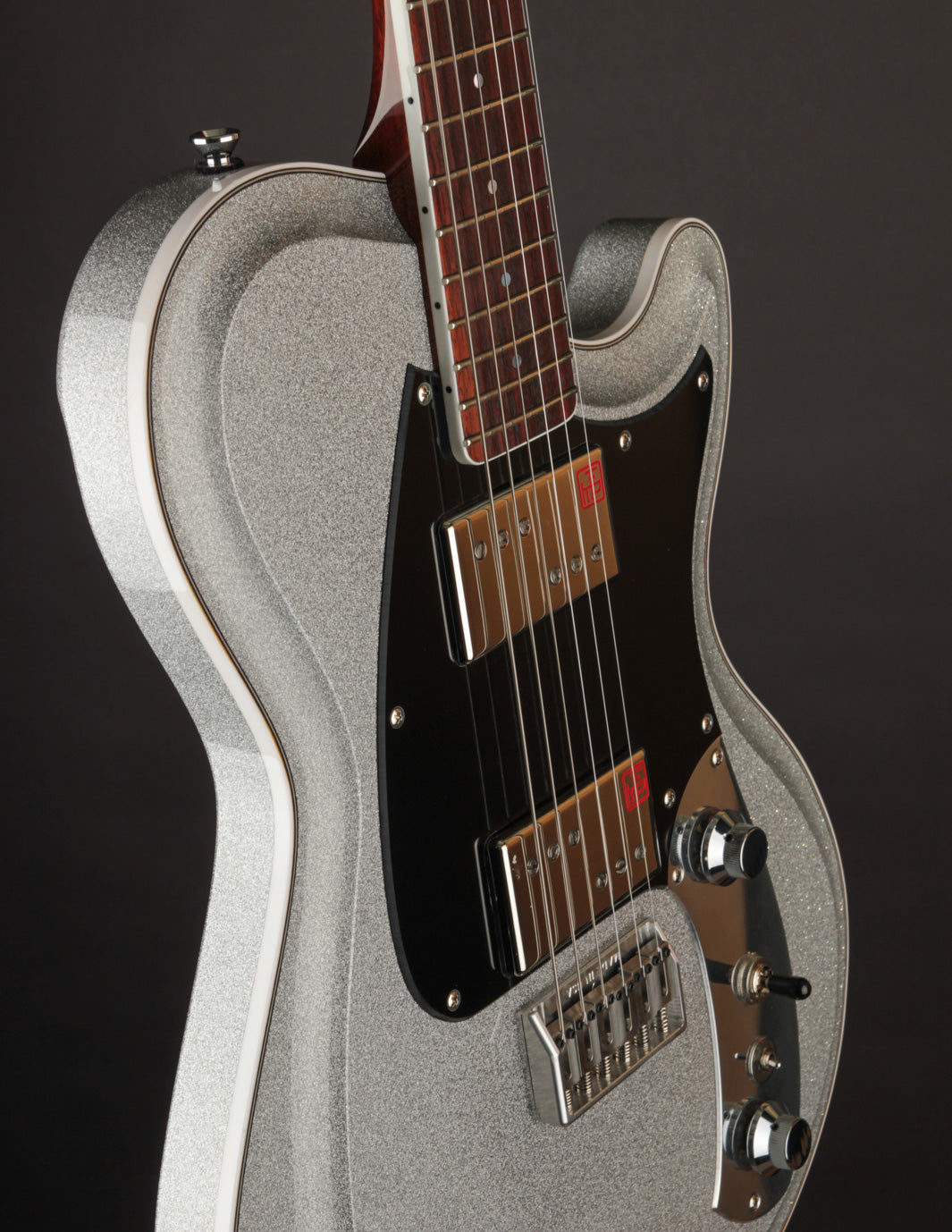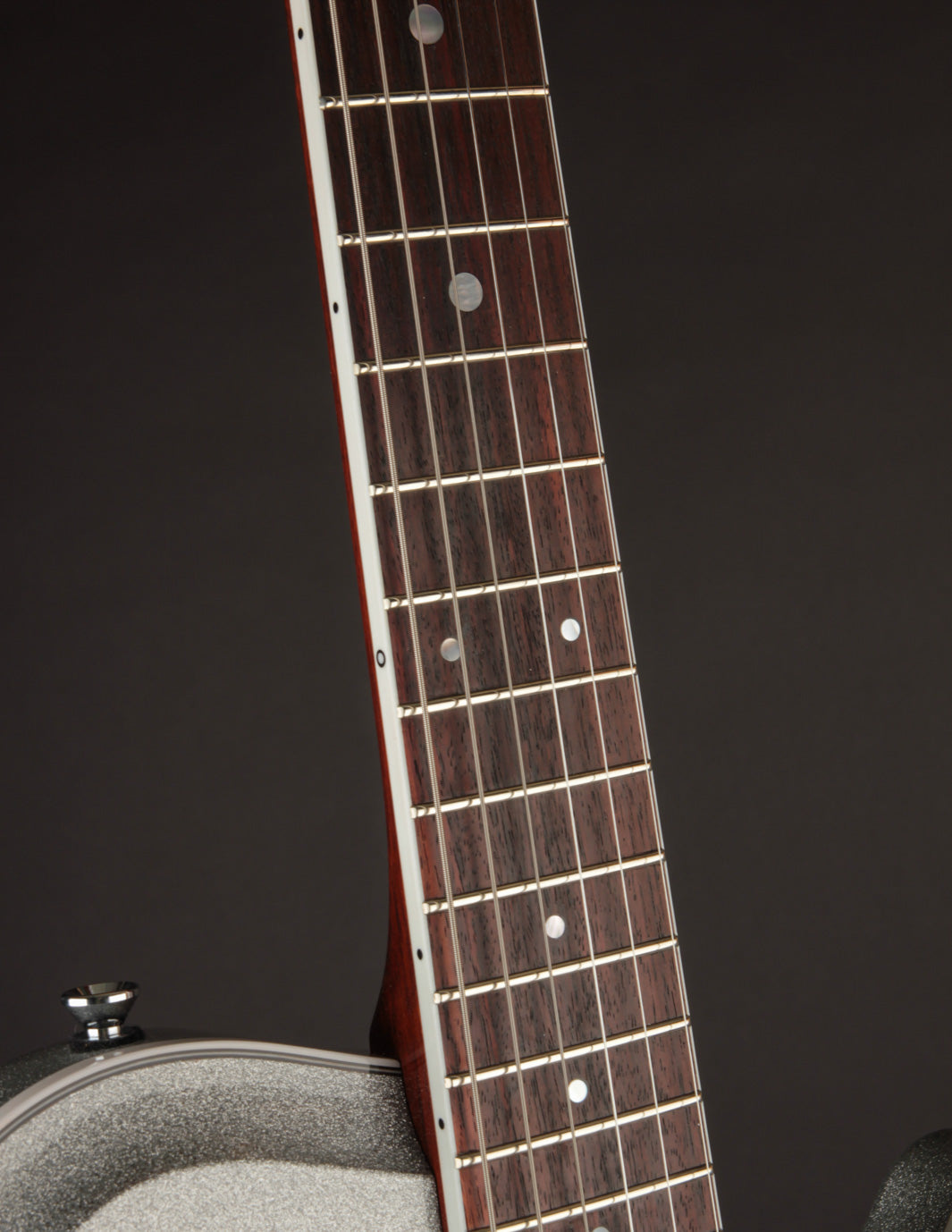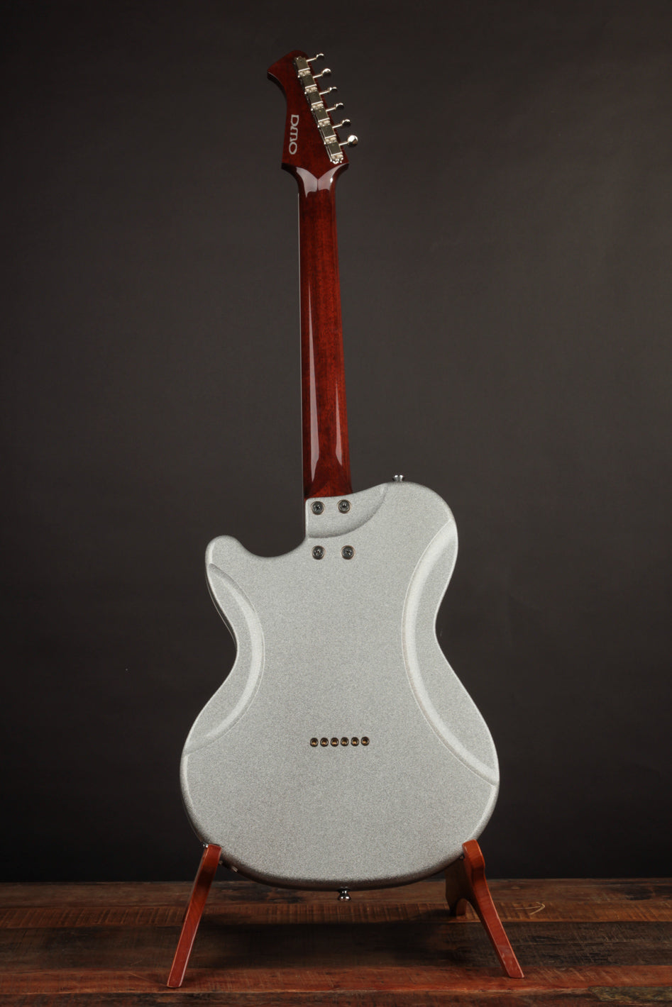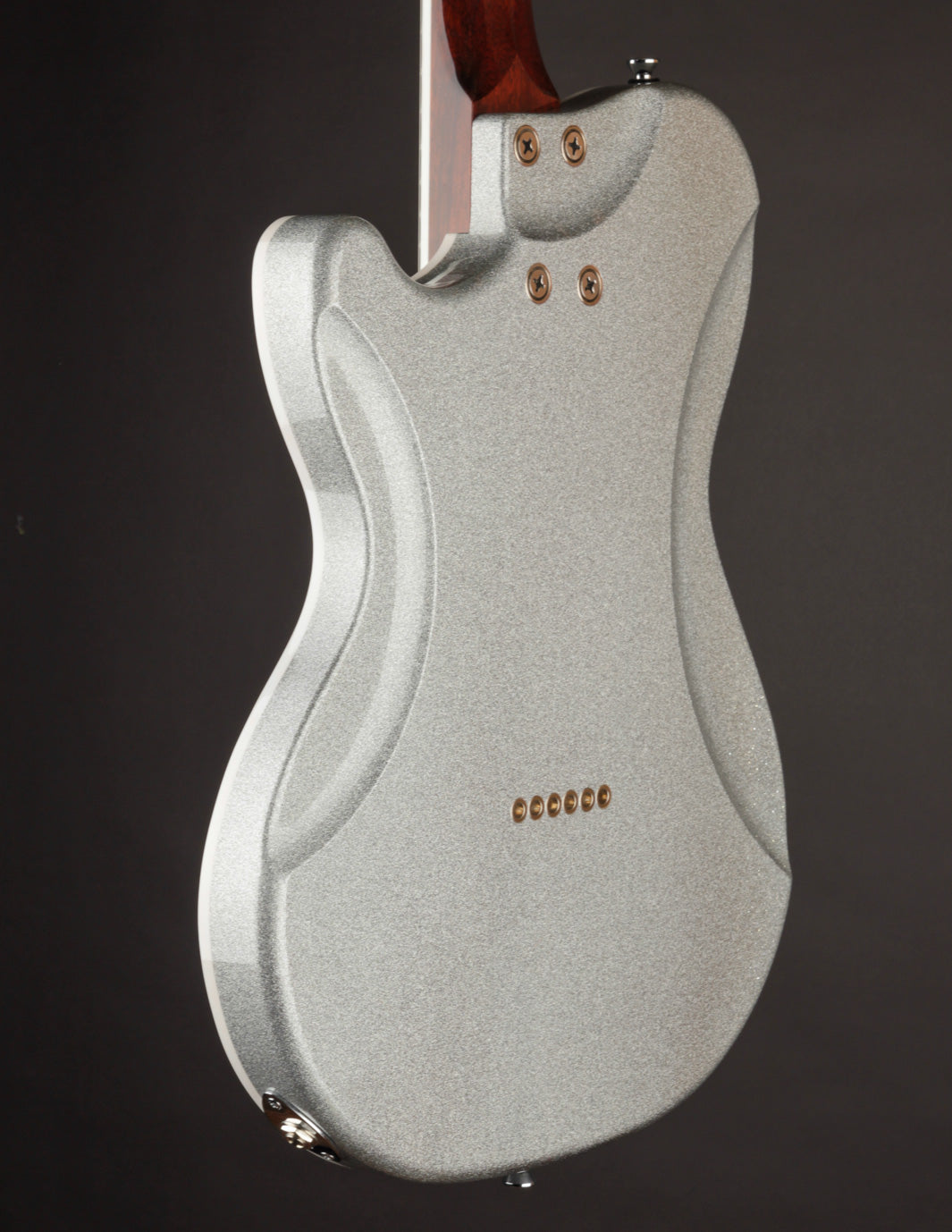 The bound Honduran Mahogany neck with an Indian Rosewood fingerboard adds a beautiful contrast to the Silver Metal Flake finish, and its 60s Oval C feeling carve, 12” radius, and stainless steel frets deliver a refined/vintage/familiar feel - think Fender/Gibson. It’s worth mentioning here that Joe worked at Collings Guitars for 5 years, the last 3 were in the set-up department, so if you’ve played and loved a Collings electric guitar, you’ll have a really good idea of what the DMO feels and plays like in-hand. That is to say, it’s damned near flawless.