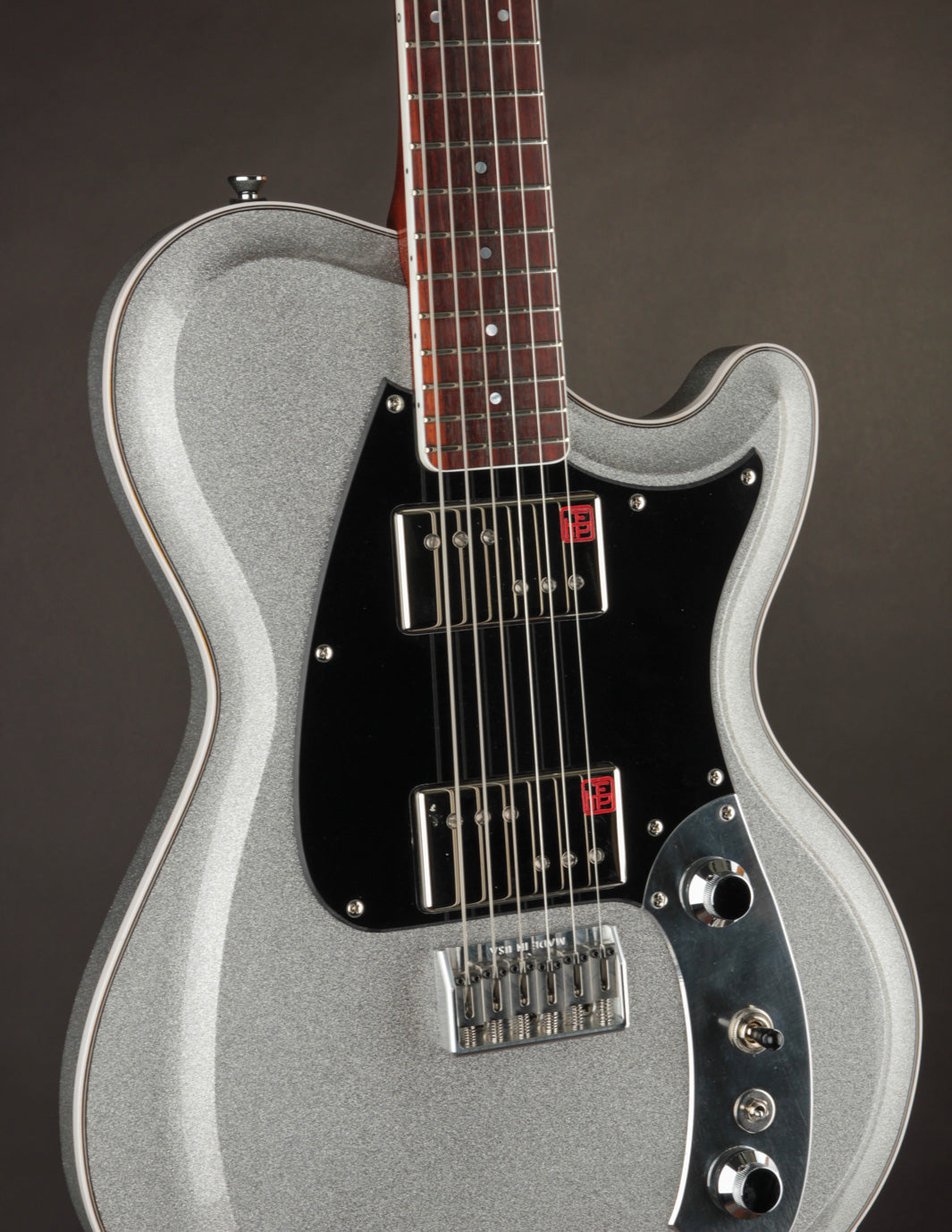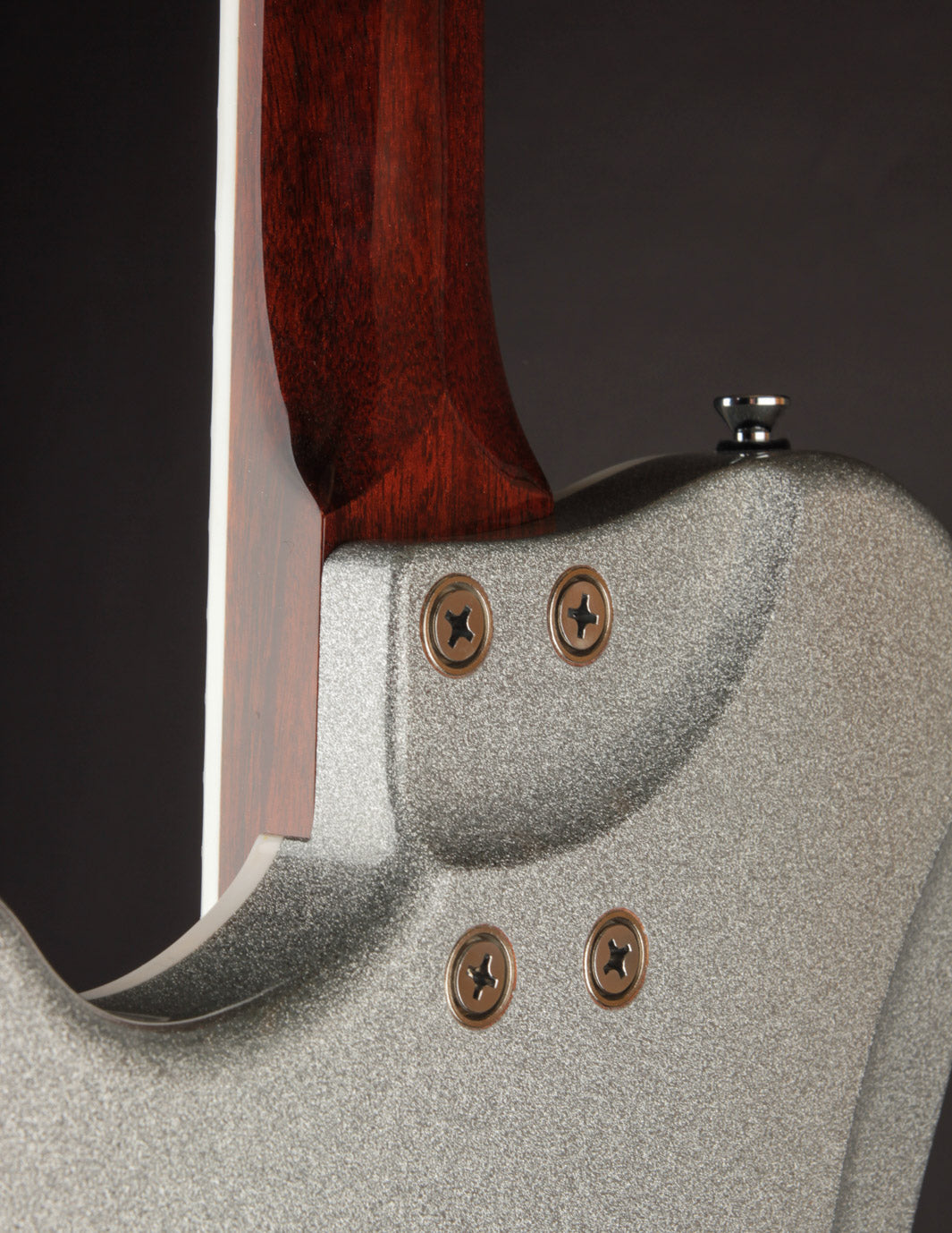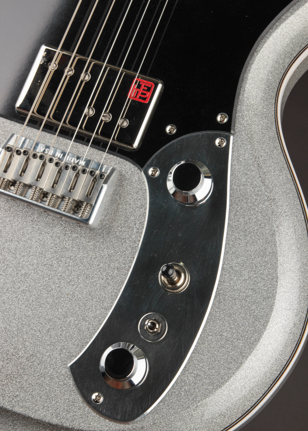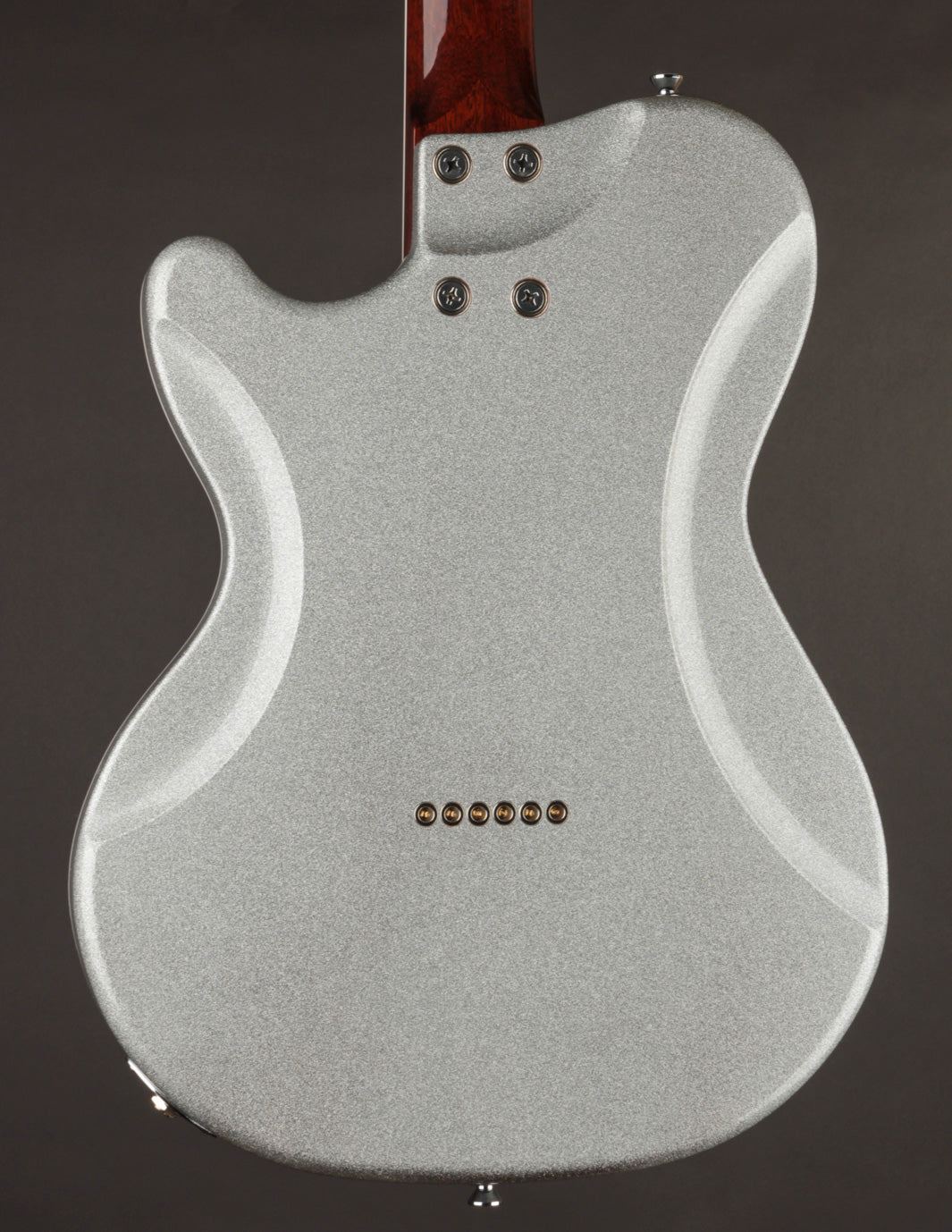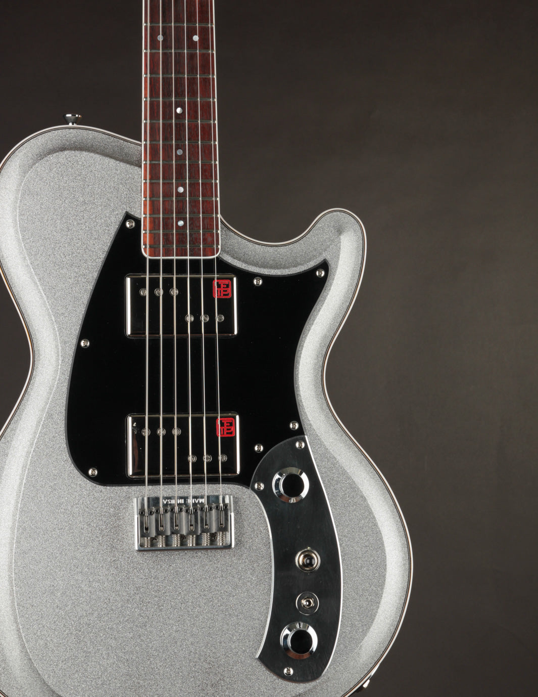 The bound Honduran Mahogany neck with an Indian Rosewood fingerboard adds a beautiful contrast to the Silver Metal Flake finish, and its 60s Oval C feeling carve, 12” radius, and stainless steel frets deliver a refined/vintage/familiar feel - think Fender/Gibson. It’s worth mentioning here that Joe worked at Collings Guitars for 5 years, the last 3 were in the set-up department, so if you’ve played and loved a Collings electric guitar, you’ll have a really good idea of what the DMO feels and plays like in-hand. That is to say, it’s damned near flawless.
