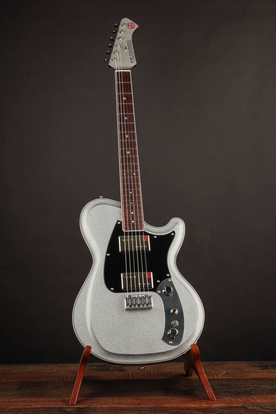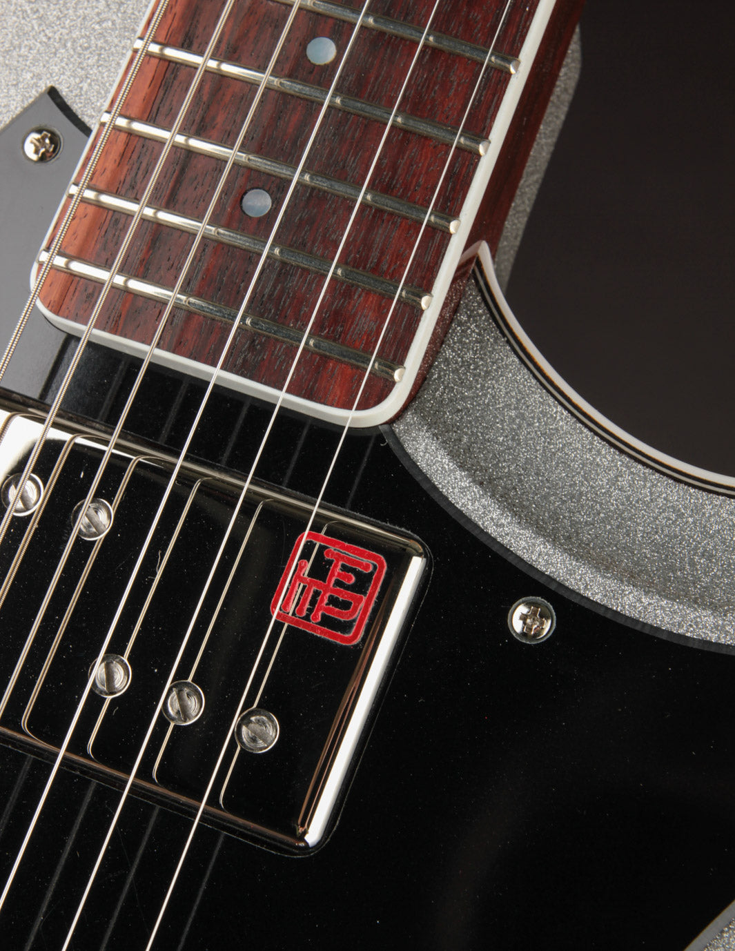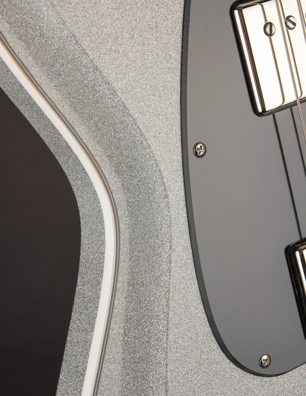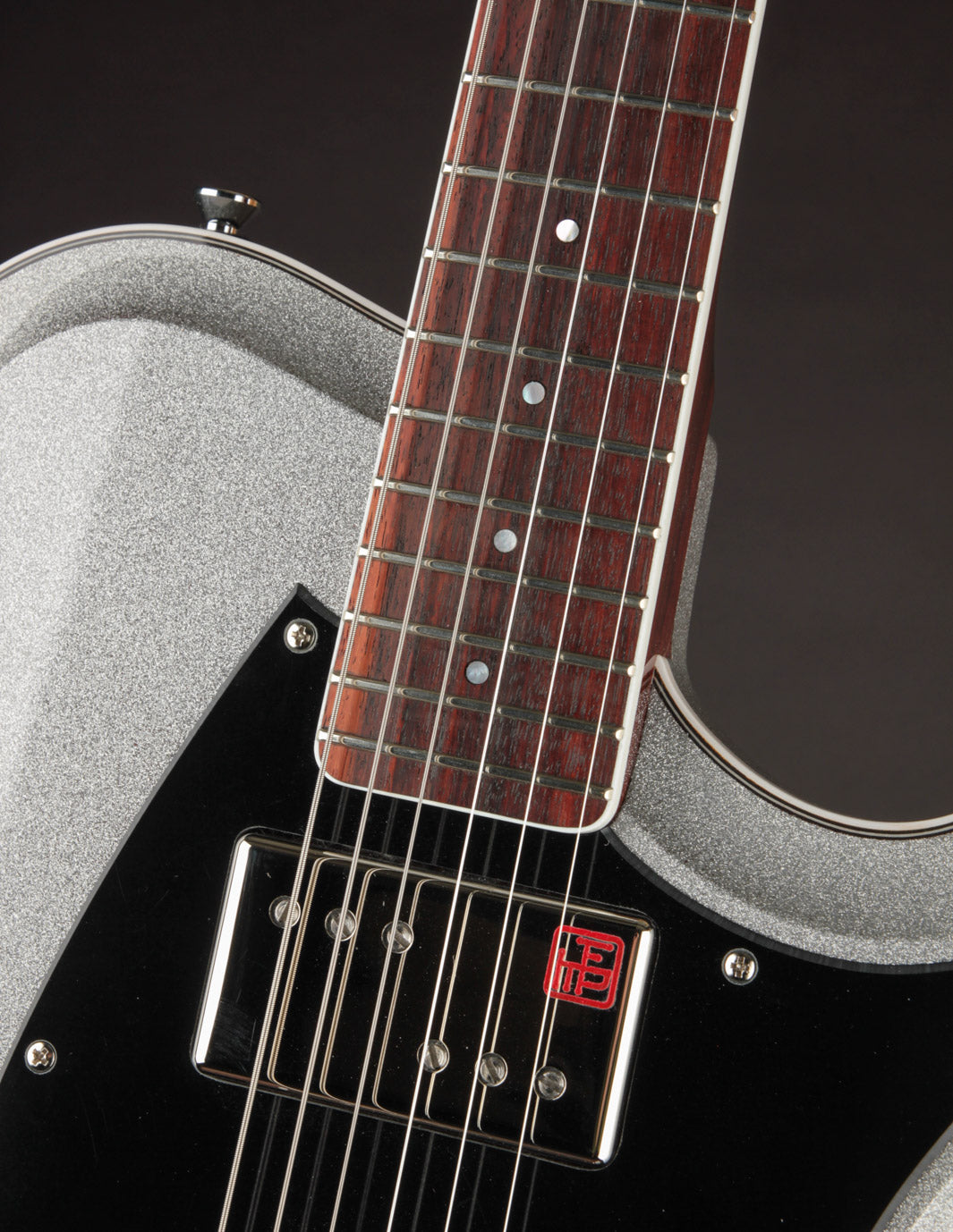 The bound Honduran Mahogany neck with an Indian Rosewood fingerboard adds a beautiful contrast to the Silver Metal Flake finish, and its 60s Oval C feeling carve, 12” radius, and stainless steel frets deliver a refined/vintage/familiar feel - think Fender/Gibson. It’s worth mentioning here that Joe worked at Collings Guitars for 5 years, the last 3 were in the set-up department, so if you’ve played and loved a Collings electric guitar, you’ll have a really good idea of what the DMO feels and plays like in-hand. That is to say, it’s damned near flawless.