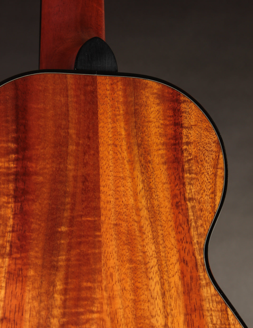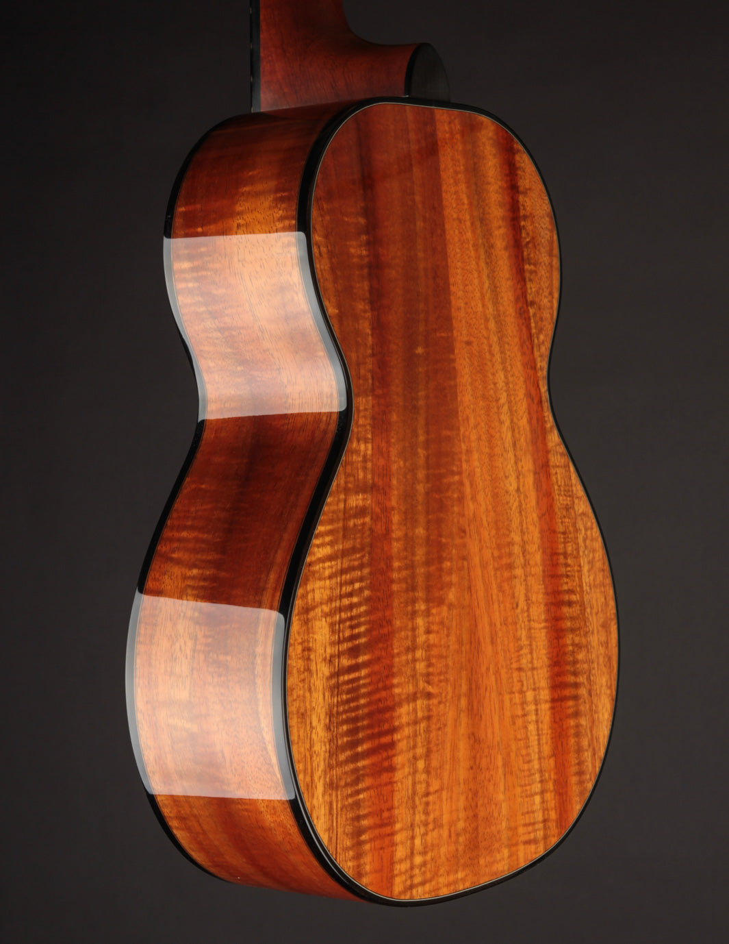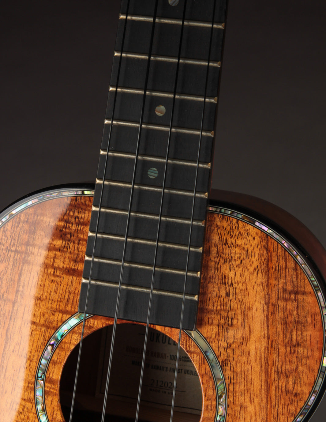 Kamaka pulled out all of the stops on this HF-2D2 Concert Deluxe. With some of the prettiest koa we've seen from their shop paired with tasteful abalone and a slotted peg head, this model delivers visually as well as tonally.