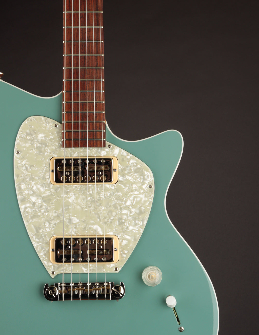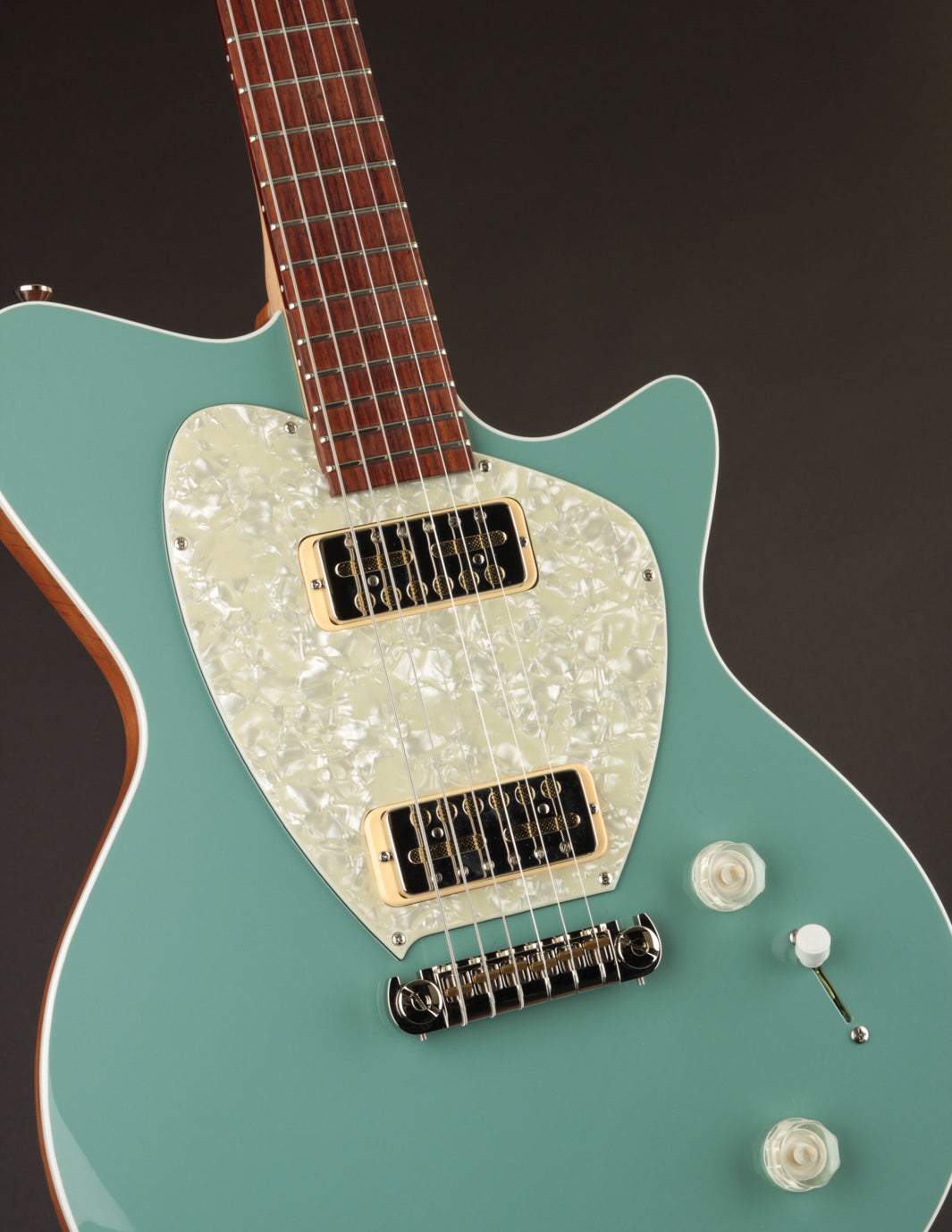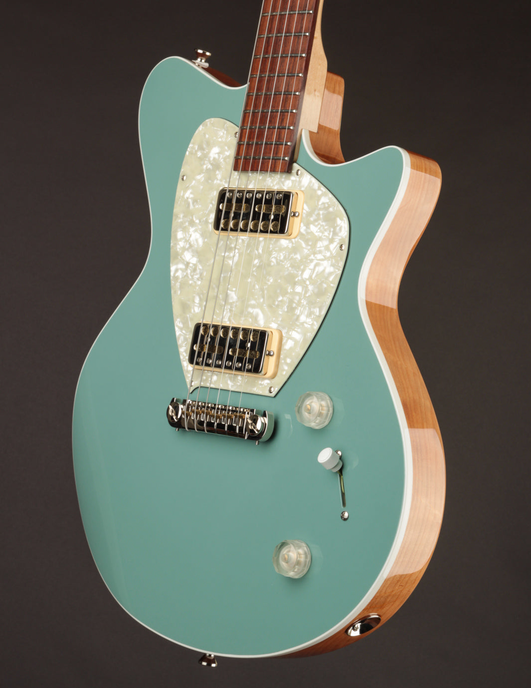 Featuring a top-only paint job (bound as well), Grenadillo fingerboard (sans markers), a Pearloid pickguard, custom Koll knobs (clear), and a pair of Lollar Gold Foils, this Troubadour gives off a decidedly mid-century vibe, which we absolutely love! Stunning, no?