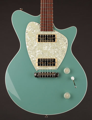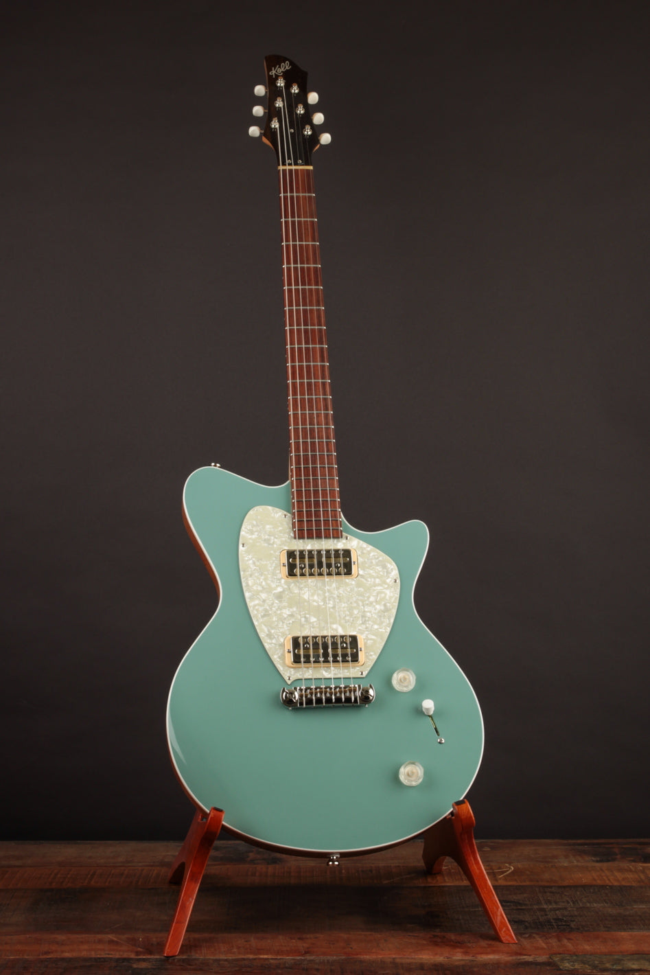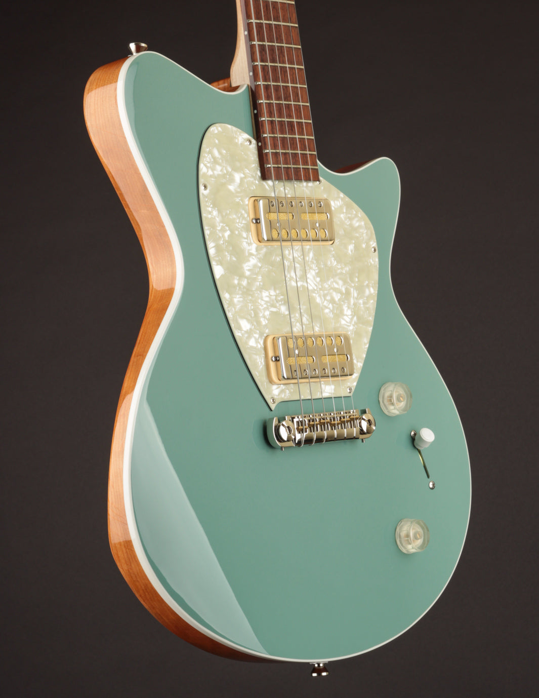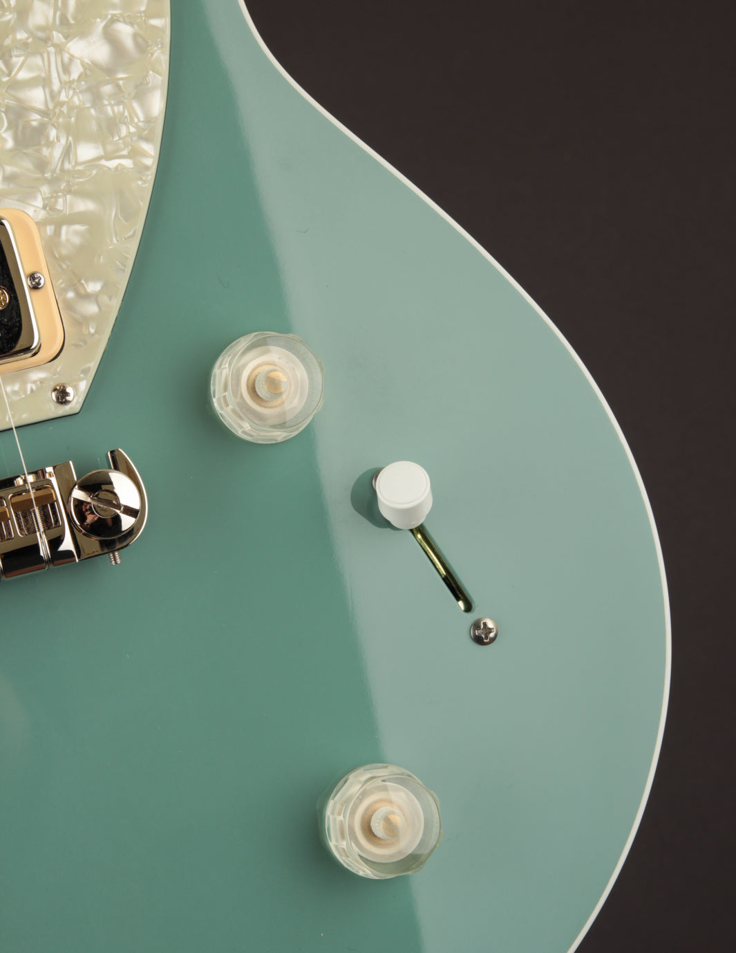Featuring a top-only paint job (bound as well), Grenadillo fingerboard (sans markers), a Pearloid pickguard, custom Koll knobs (clear), and a pair of Lollar Gold Foils, this Troubadour gives off a decidedly mid-century vibe, which we absolutely love! Stunning, no?