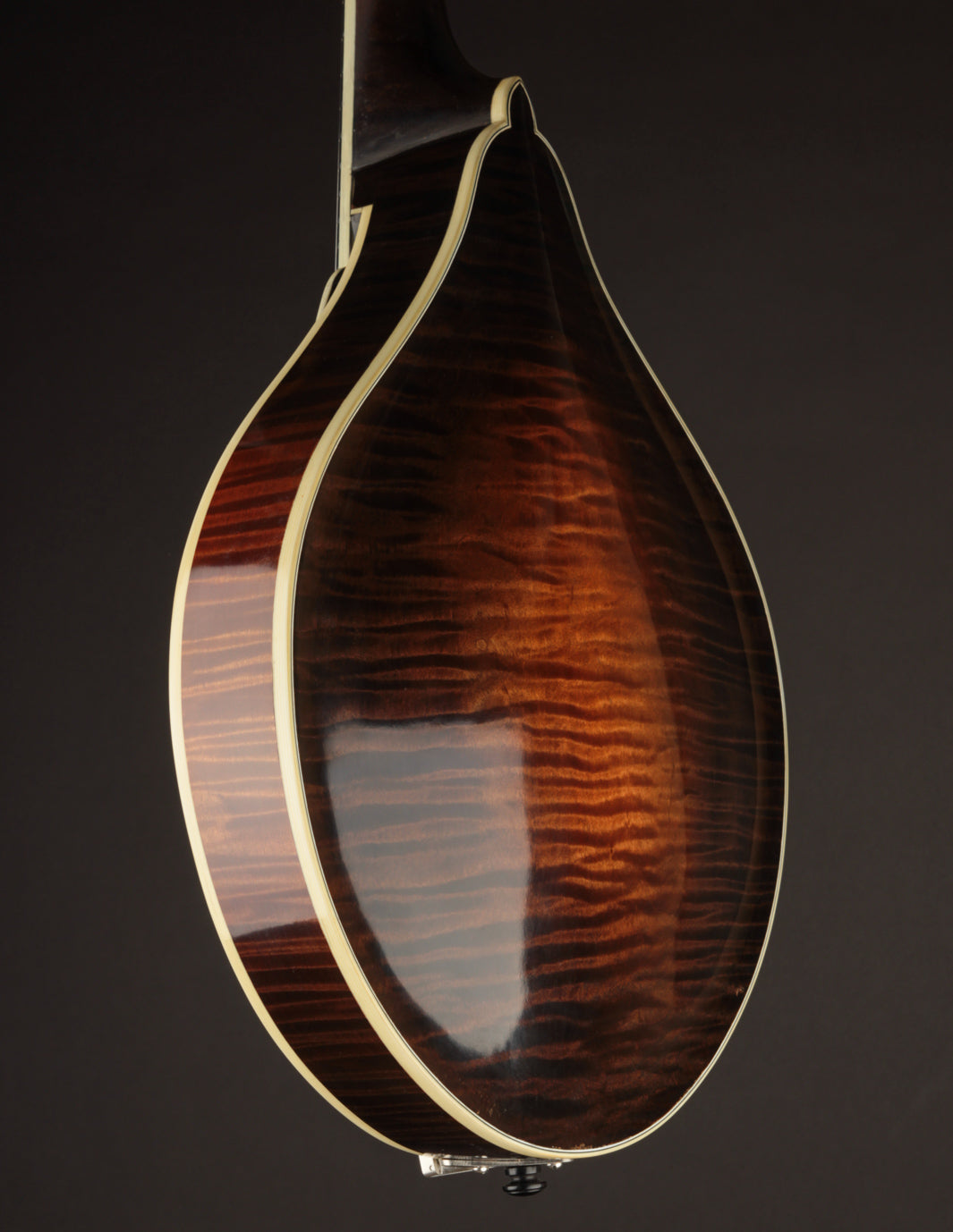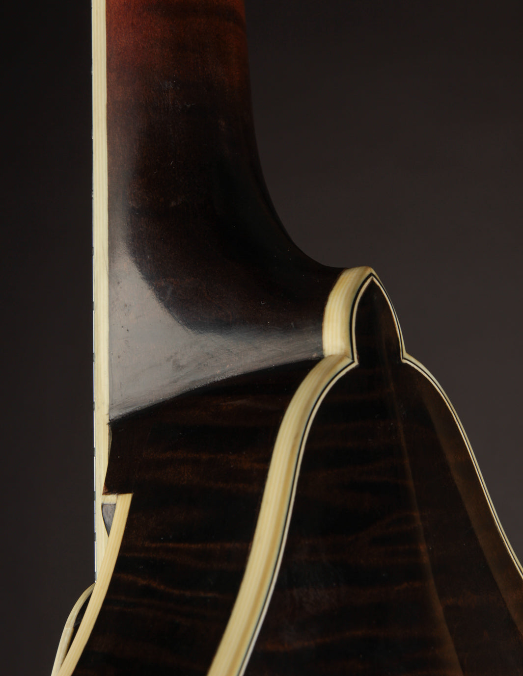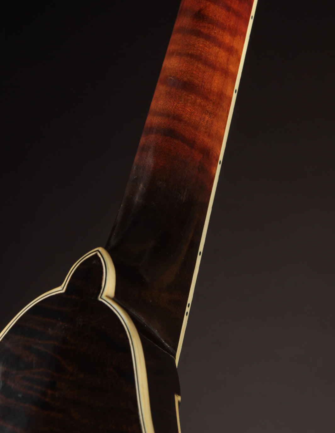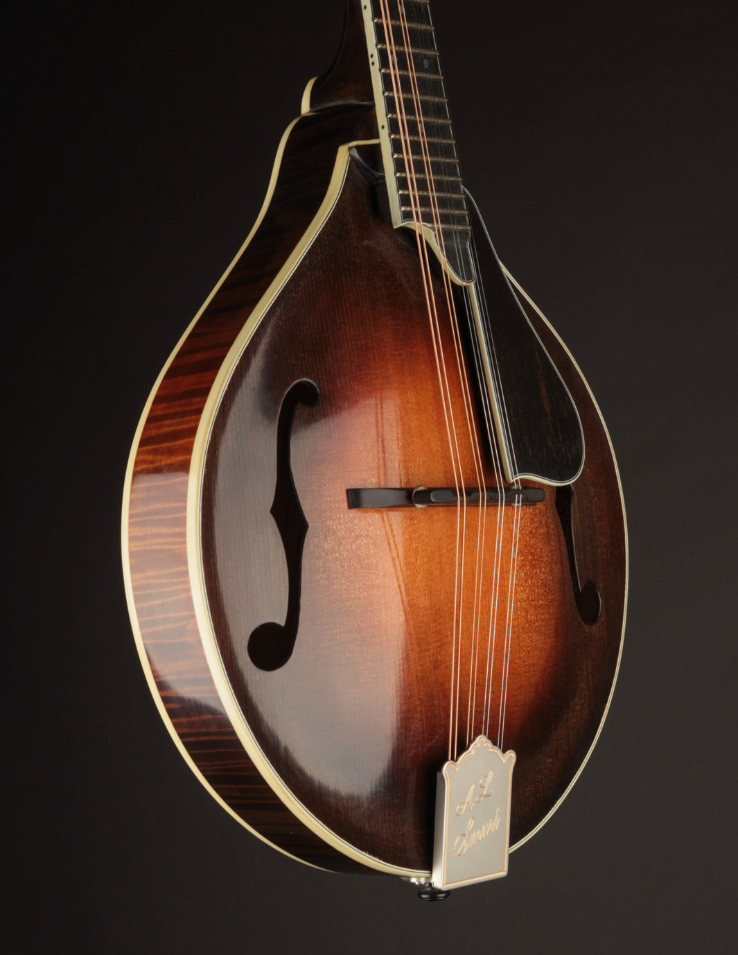 Lawrence always achieves great sonic results from Engelmann spruce, as evidenced by the open, dulcet voice on this mandolin. His best reserve maple makes for a very special instrument, indeed.