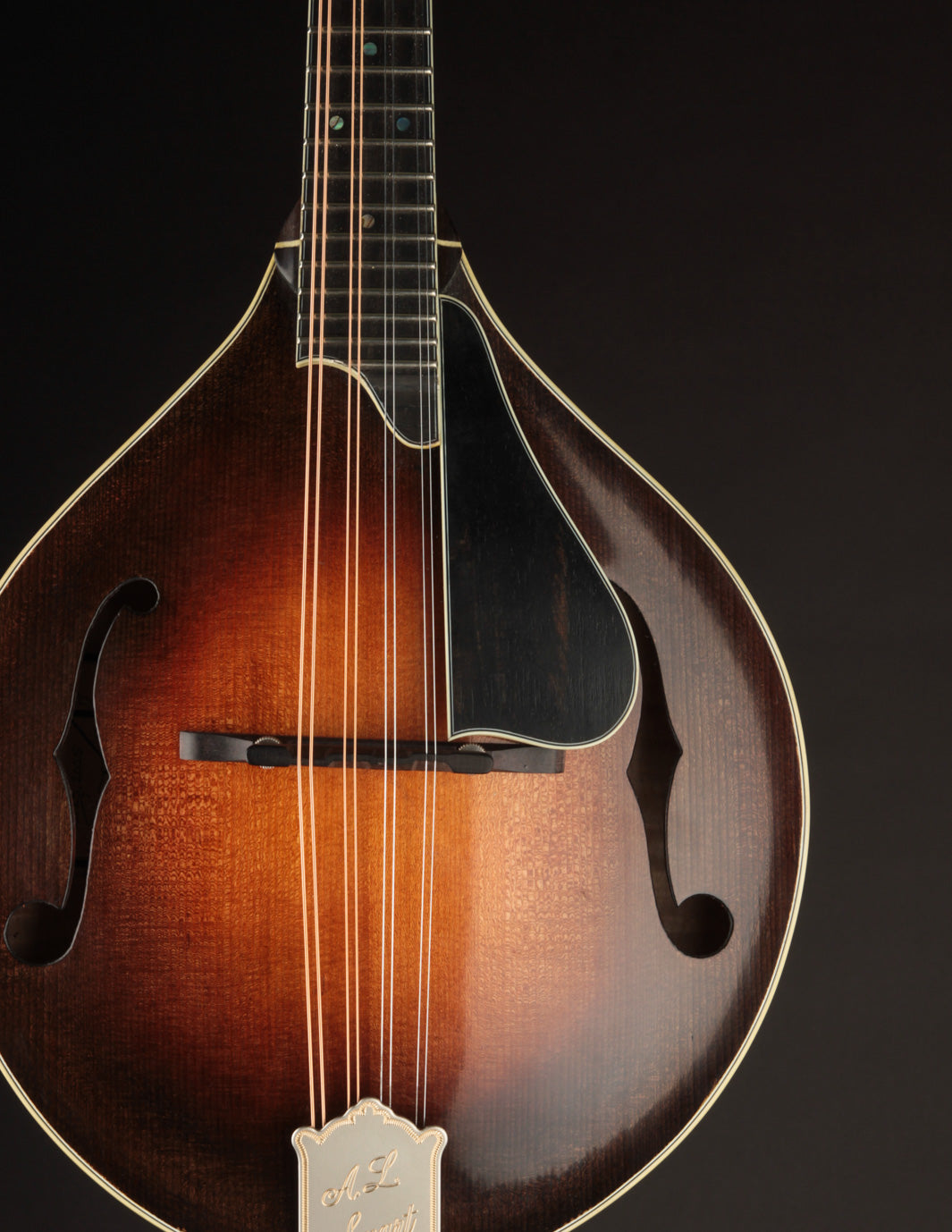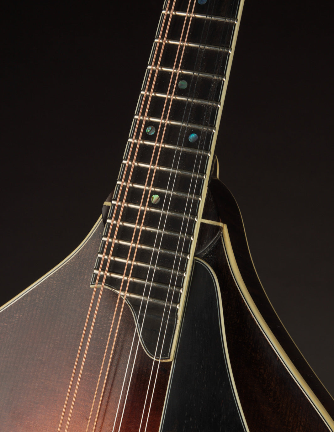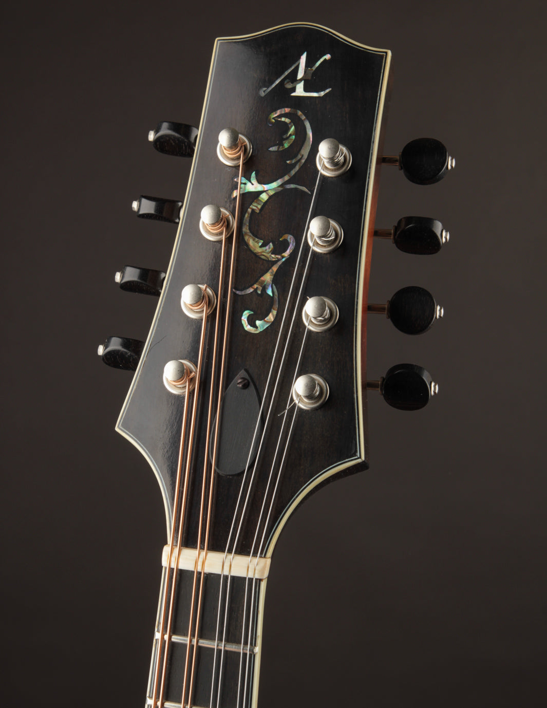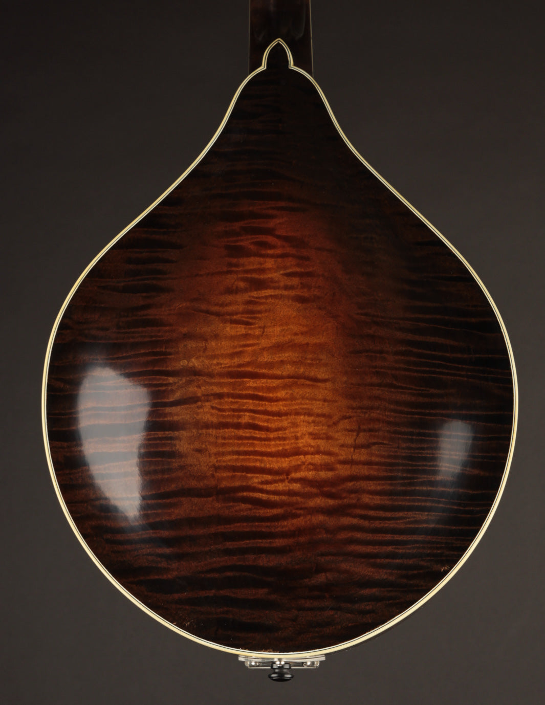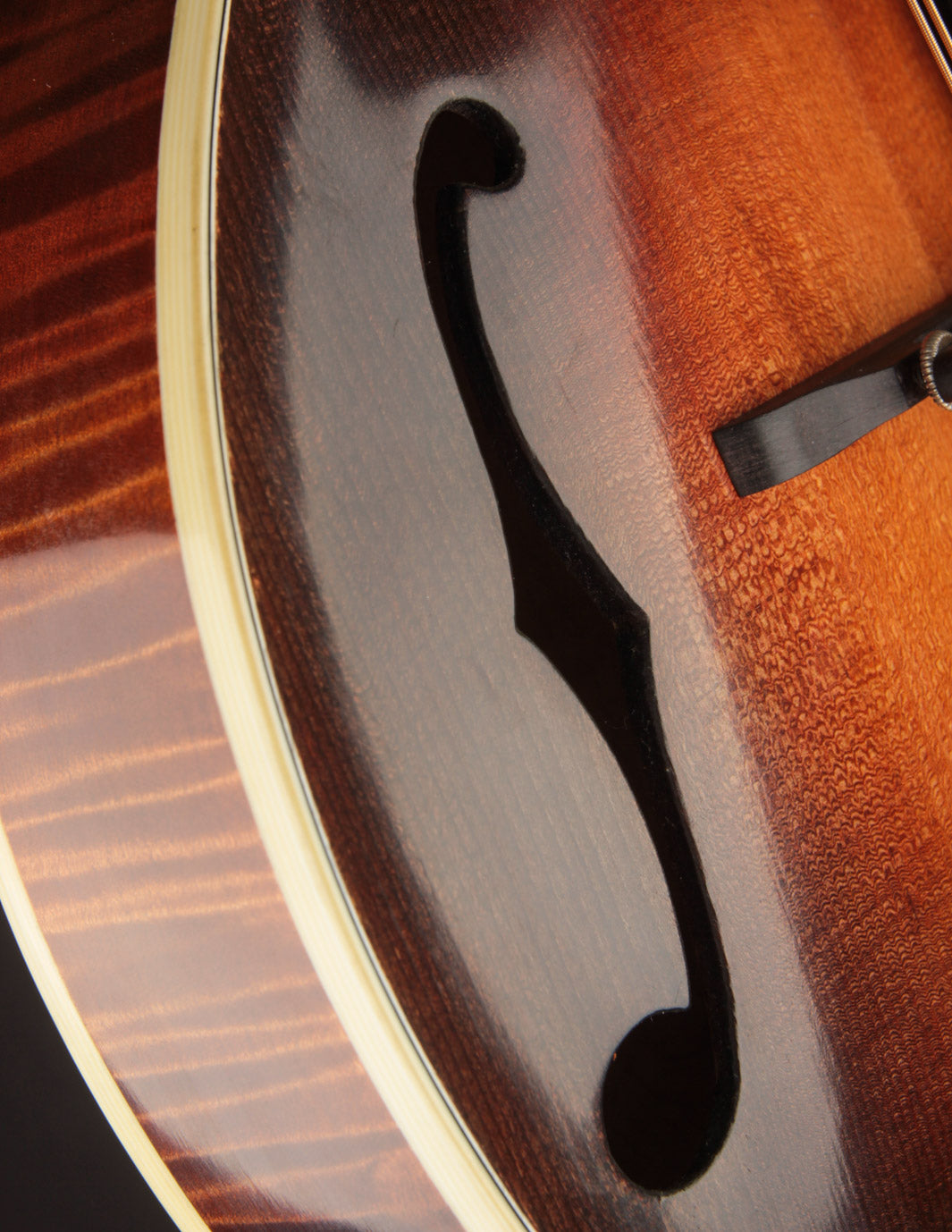 Lawrence always achieves great sonic results from Engelmann spruce, as evidenced by the open, dulcet voice on this mandolin. His best reserve maple makes for a very special instrument, indeed.