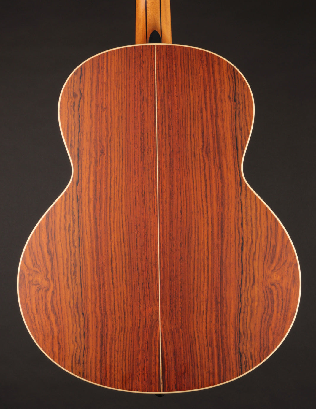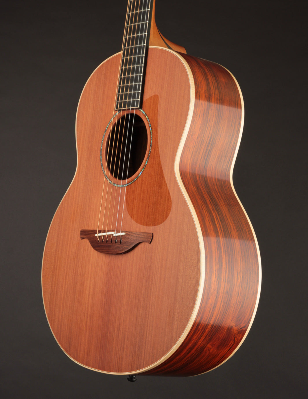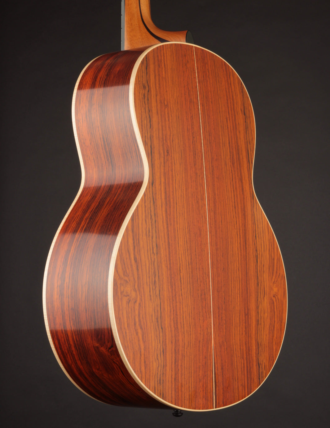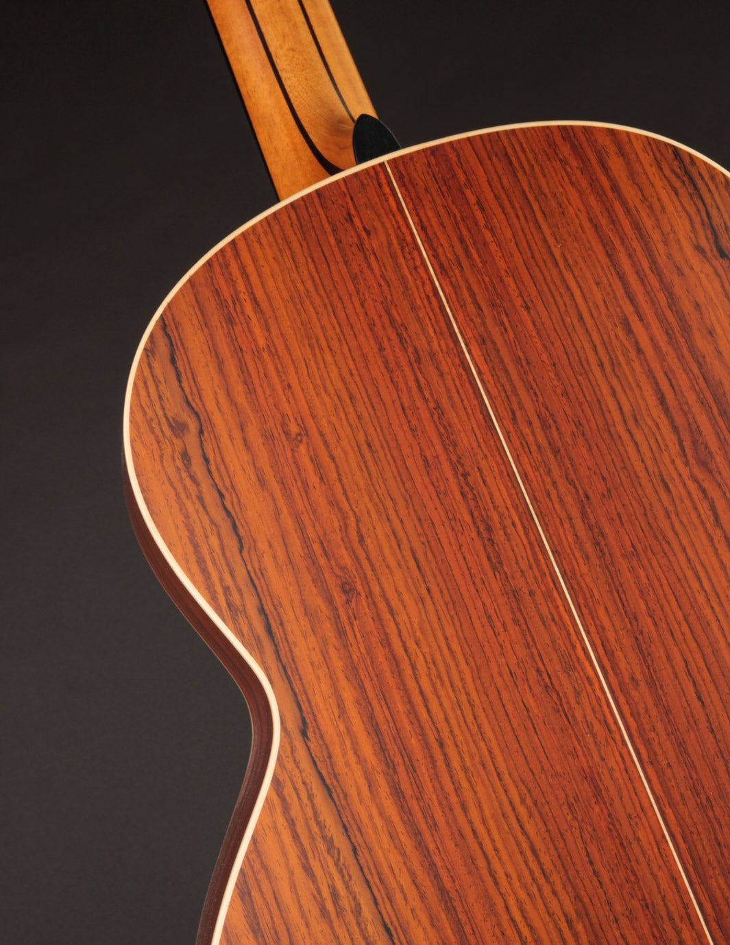 "Cocobolo is heavy, strikingly beautiful and a great wood for steel string guitars. Very similar to Brazilian rosewood in tone, clear, loud and yet warm at the same time. Perfect for someone who wants to be very versatile in playing styles from strumming, percussive picking to fingerstyle." ~ George Lowden