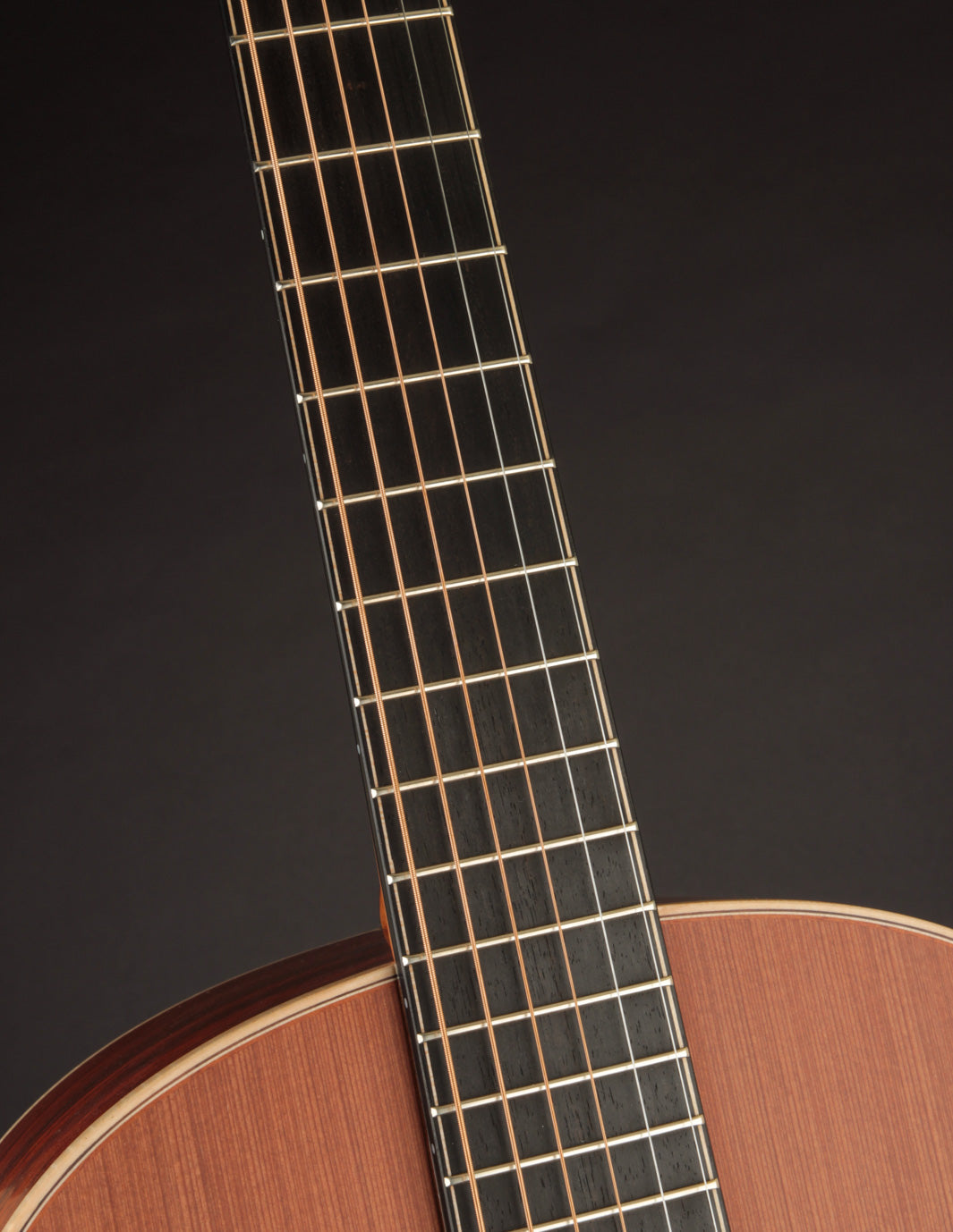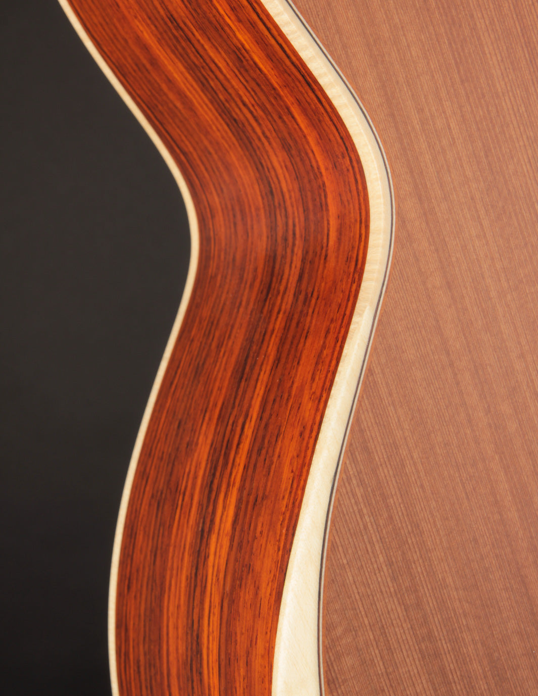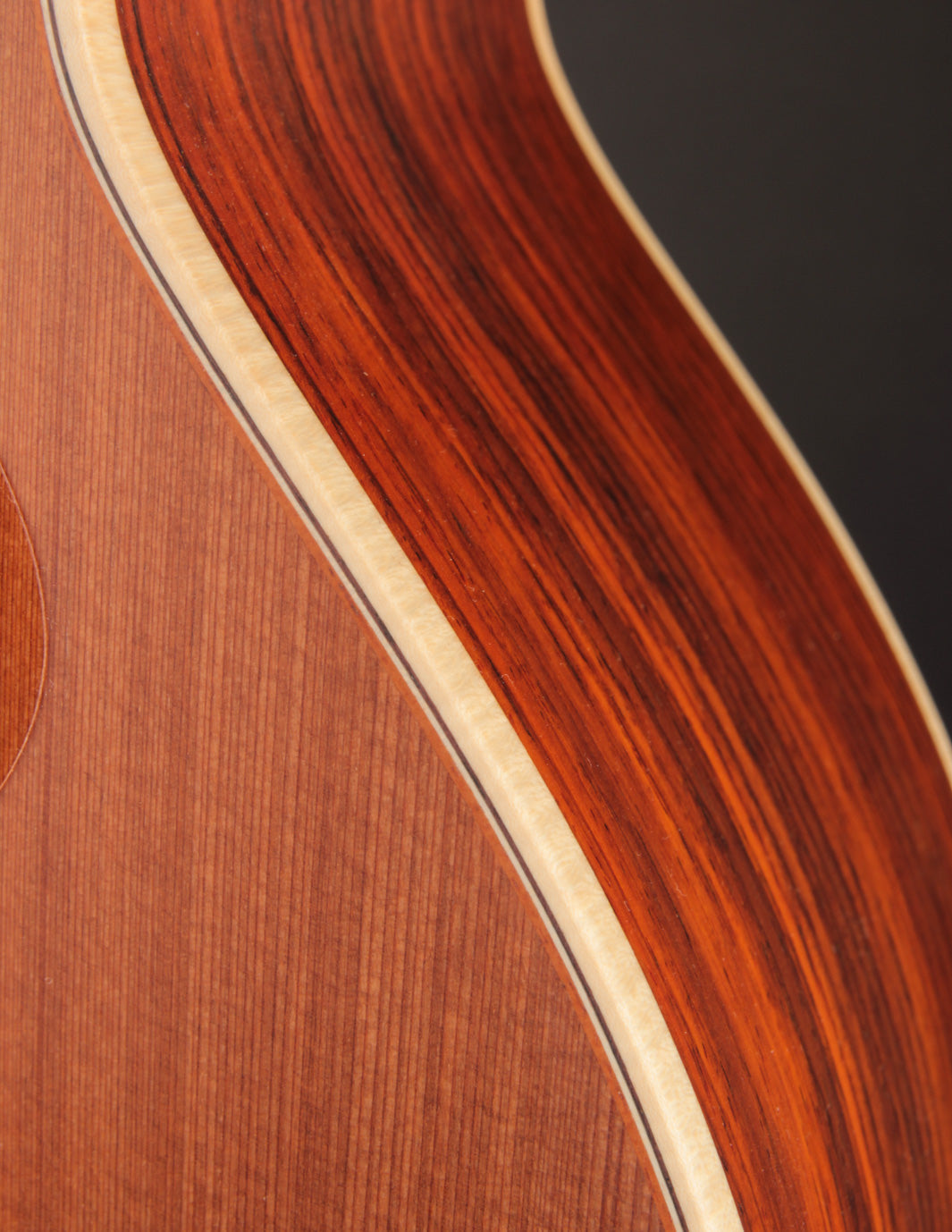 This F-35 features Cocobolo back & sides, a Redwood top, figured Maple bindings and arm bevel, a 25.5" scale and 1 3/4" nut width.