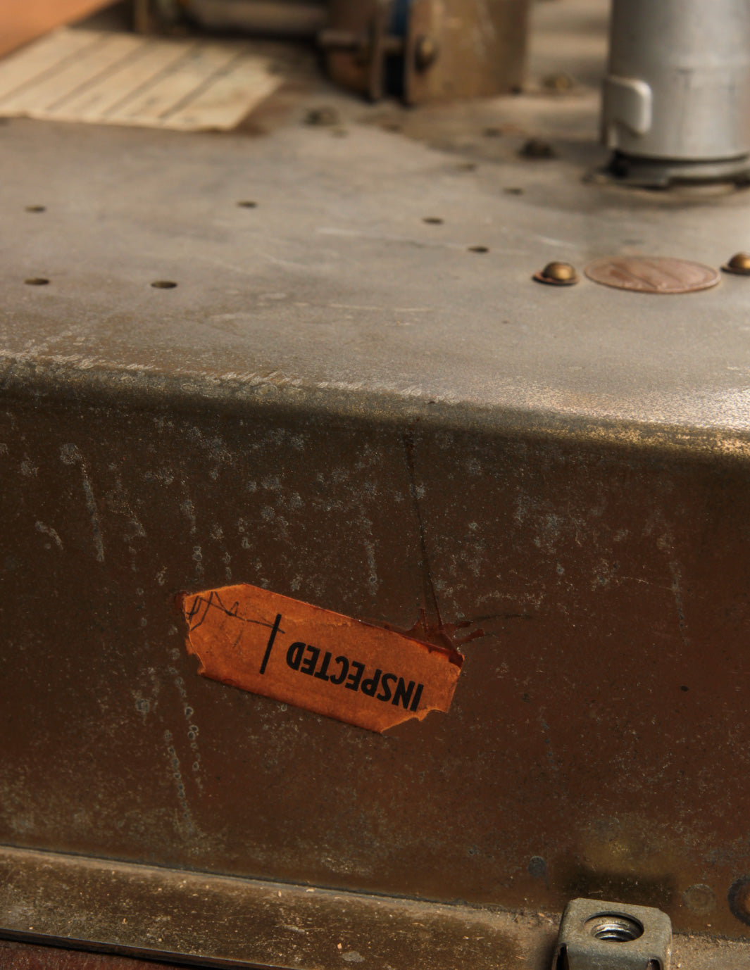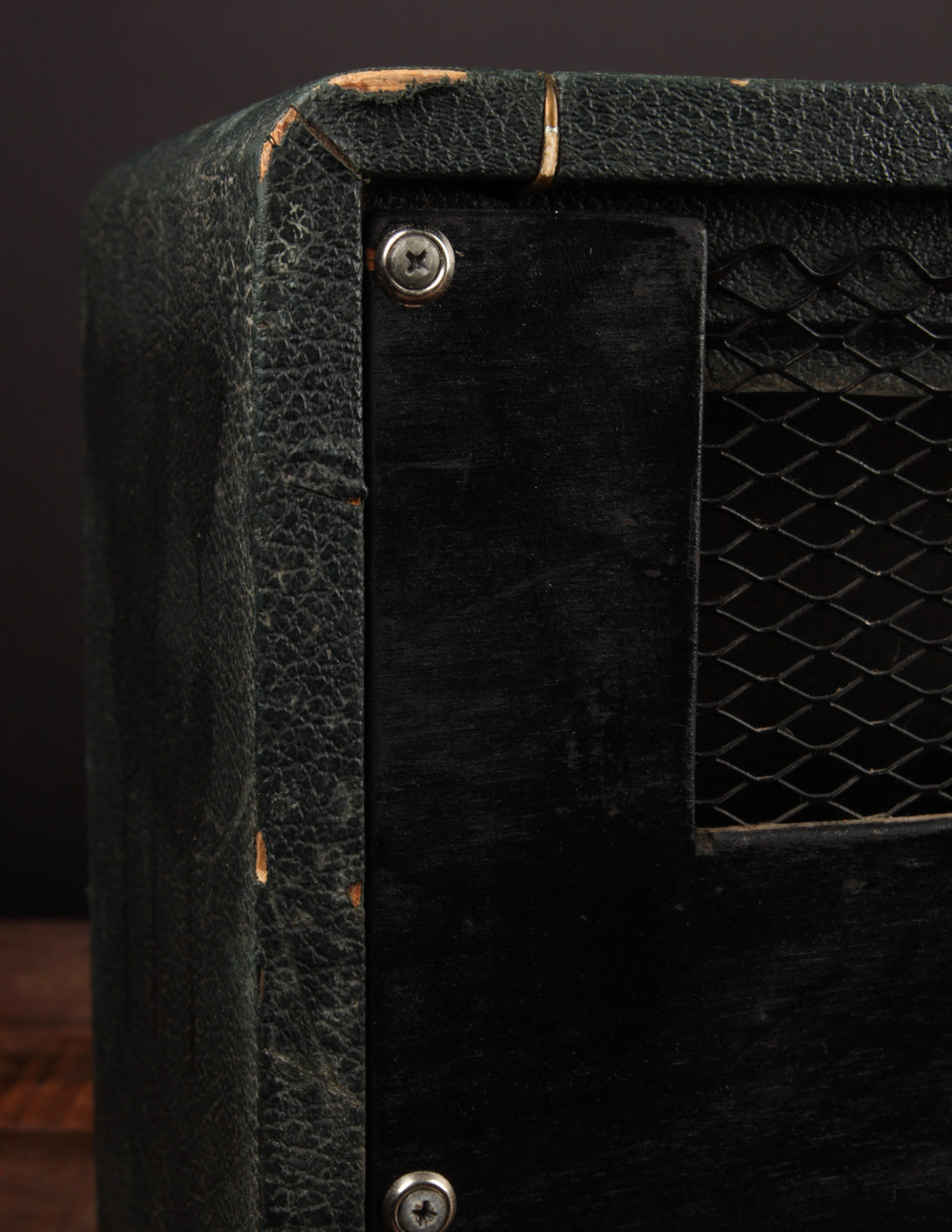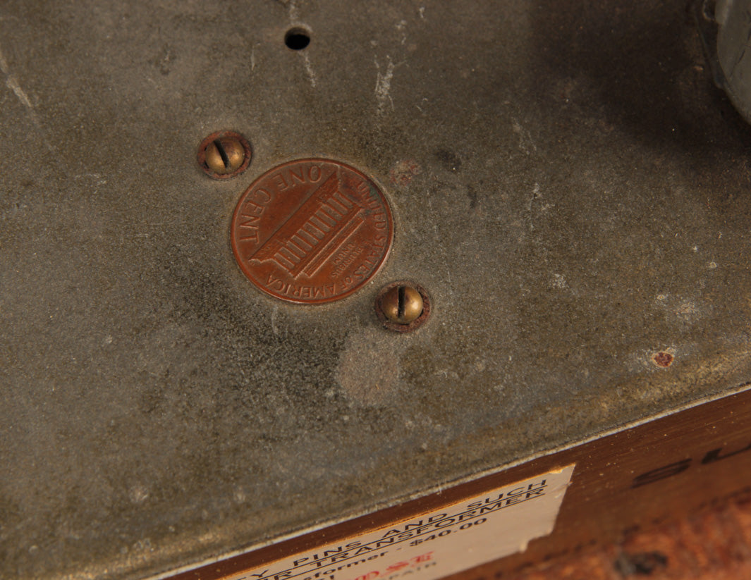 While we would consider the overall condition to be Very Good, there are a few particular changes of note that are worth mentioning. The most obvious is the replacement back panel, which is a more generic thin-ply replacement painted black. Second, previous work done on the amp shows the use of a penny to cover up a preamp tube chassis hole (the hole itself is factory, but the penny certainly is not!). The original speaker impedance selector switch was also replaced and now uses a knob to select through the ohm settings. The voltage selector was also disengaged to only allow operation at 120v. Lastly, a modern Marshall badge replaced the original, seemingly some time ago.