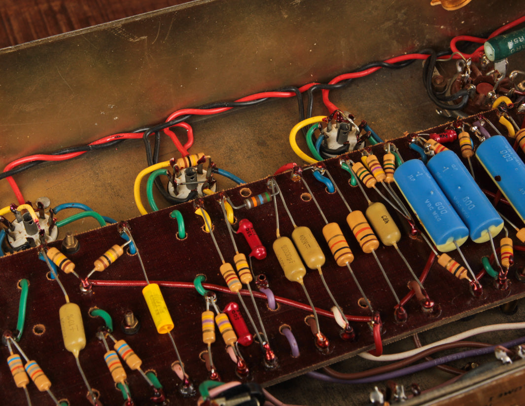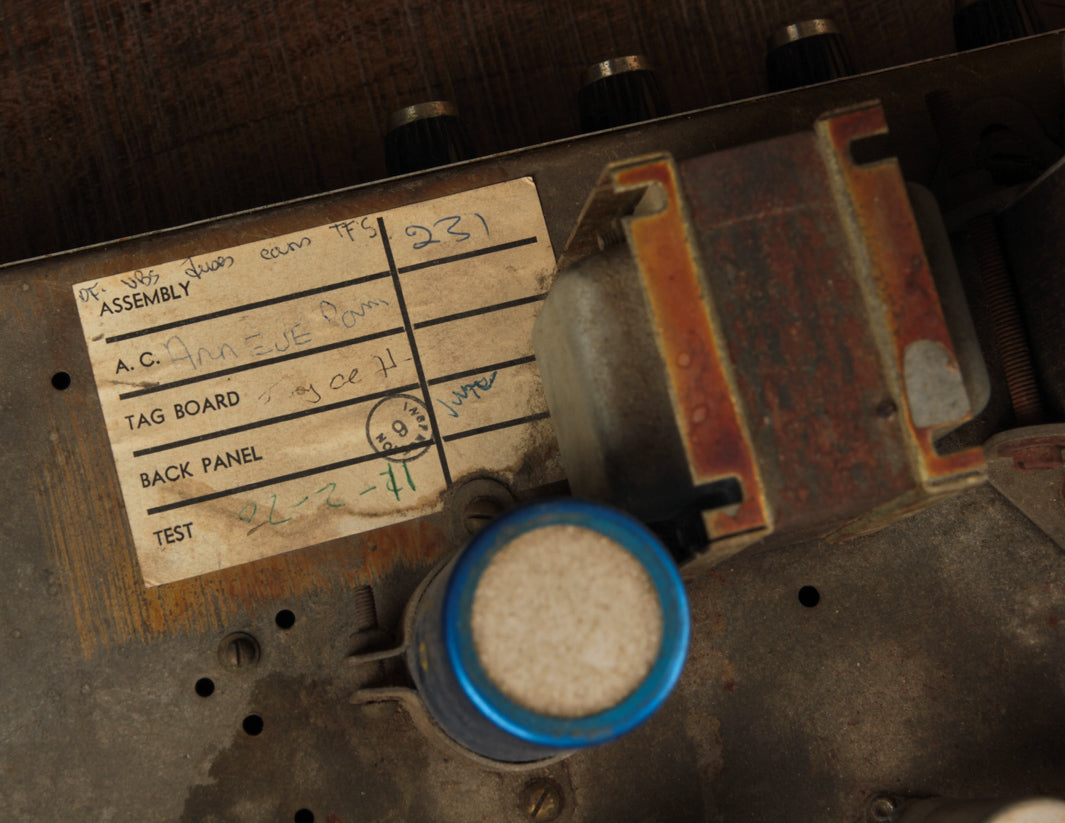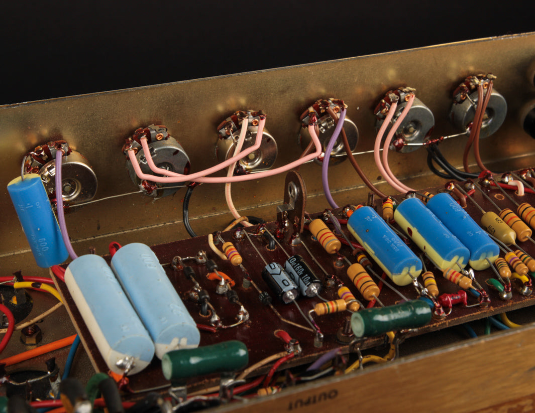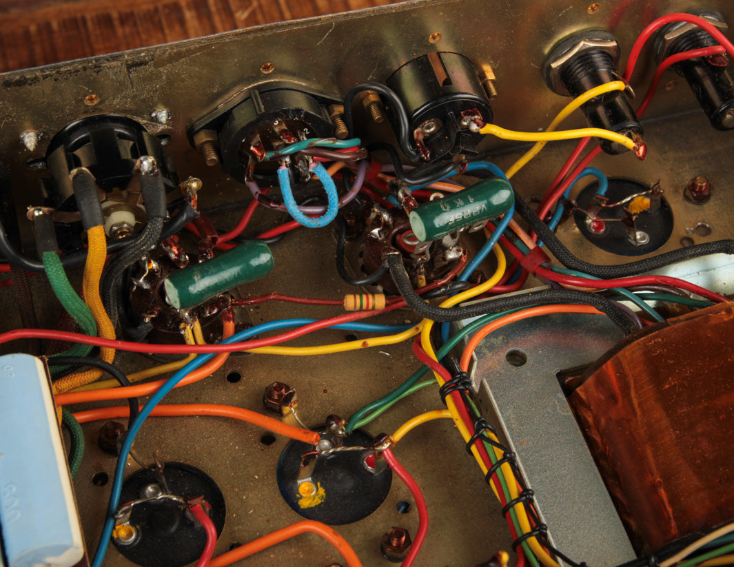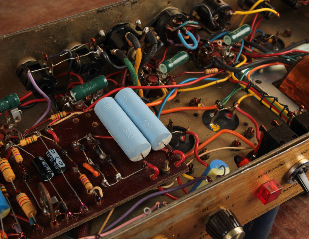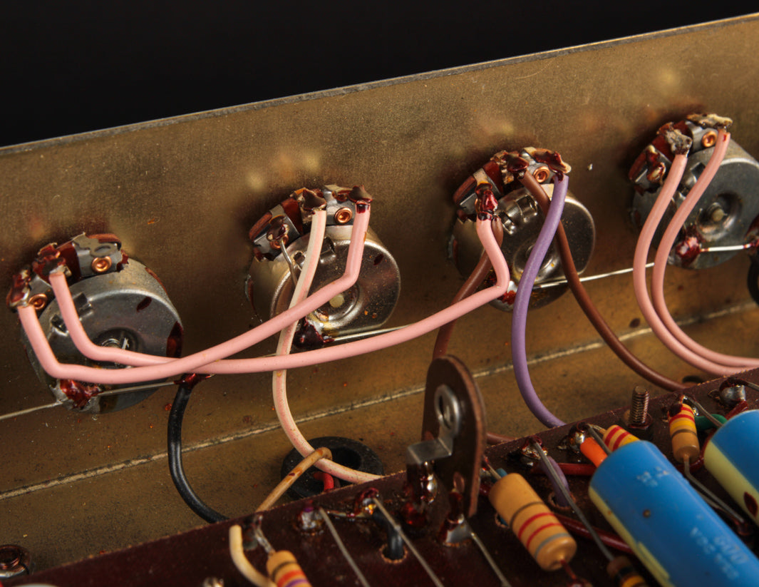 The good news? Transformers and pots along with the main PTP board are original to the amplifier, and no additional holes have been found on the chassis. The amp received its most recent service by way of Boston-area amp tech Stan Day, who completed the work in November 2022. The amp is fully serviced and ready to rock.