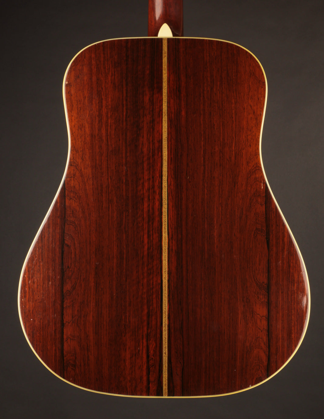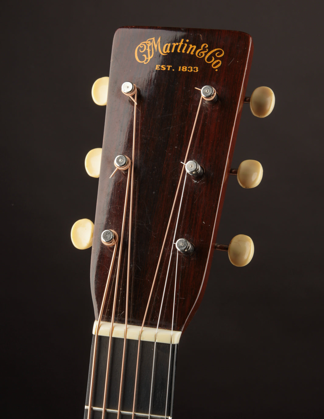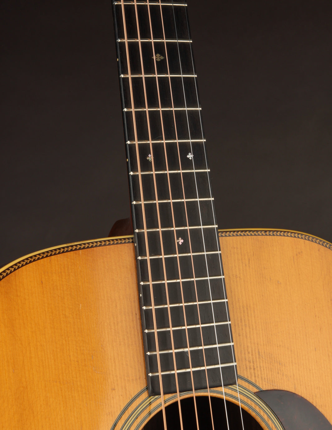 This herringbone-trimmed Martin D-28, serial number 87415, was stamped on March 16, 1944, and cleared final inspection on July 11th that same year. Amongst its batch siblings was 87422, the D-28 that would end up in the hands of Hank Williams, and which now resides in the Country Music Hall of Fame. While that's little more than an interesting footnote in 87415's history, it may lend credence to its excellence as a musical instrument: we have never heard a herringbone from this period we would not classify as an incredible guitar. Built towards the end of the scalloped-brace era, and equipped with ebony neck-support rods, these D-28s are lightweight, super-responsive, and typically exhibit huge dynamic range with great fundamental "woodiness" of sound alongside lots of sparkle and complexity. 87415 is no exception to this rule; and shows grand-piano characteristics as it relates to shimmer and power across its voice. It's a hugely warm-sounding instrument, with pillowy bass, fat mids, and thick, round trebles all the way up the neck. An incredible, lifer of a flatpicking guitar, it responds immediately and pleasantly, even to a light touch, and occupies a tremendous amount of sonic space when put into alternate tunings and played fingerstyle. As sound goes, we rate this guitar as highly as a wartime D-28 can be rated.