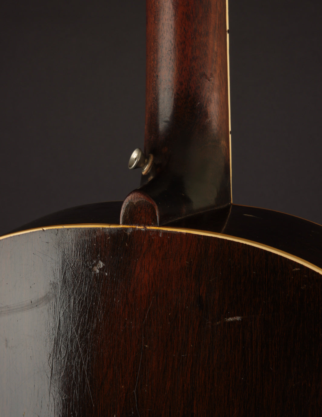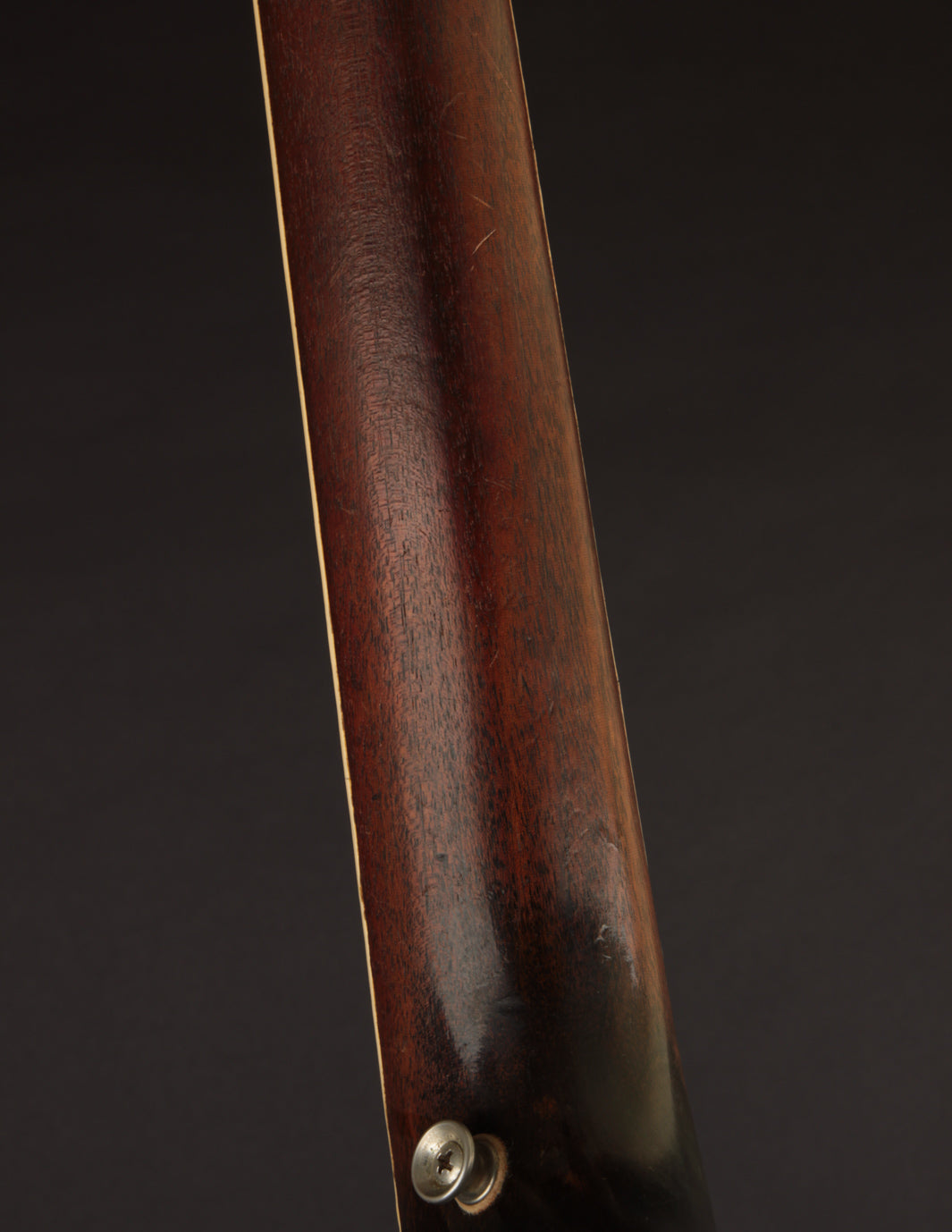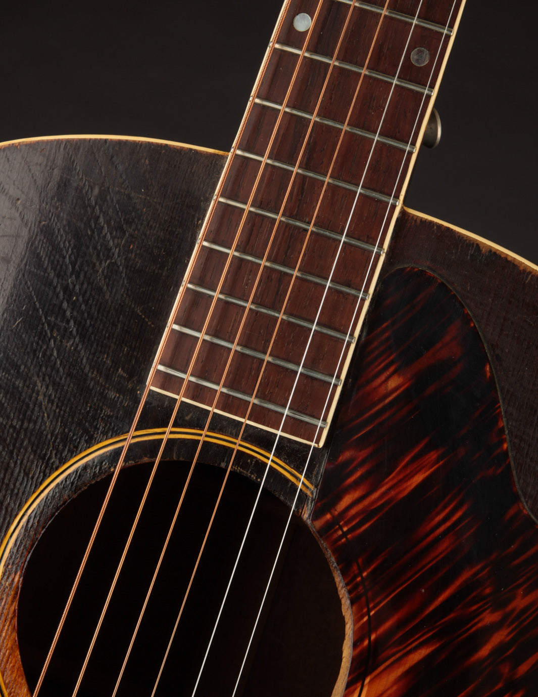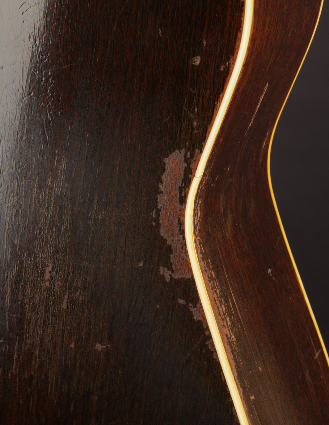 This particular guitar is very lightly built, which makes it a joy to play. The neck has a pronounced V profile, which has worn in well over the years and isn't particularly deep. The guitar has been refretted, a new nut has been installed, and an area of significant playwear near the bridge has been touched up with new finish. A very clean neck reset has been performed, and the guitar plays wonderfully under tension of light strings. One could certainly use mediums, though we don't think much will be added to the already splendid tone.