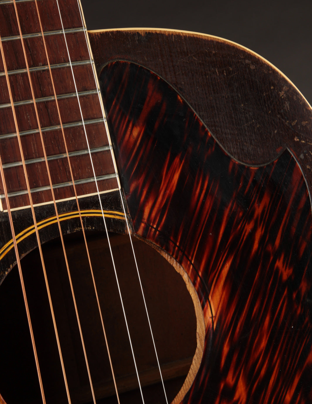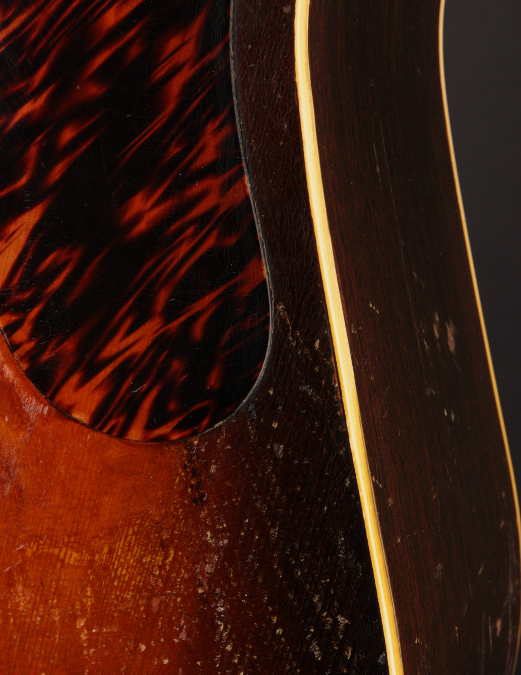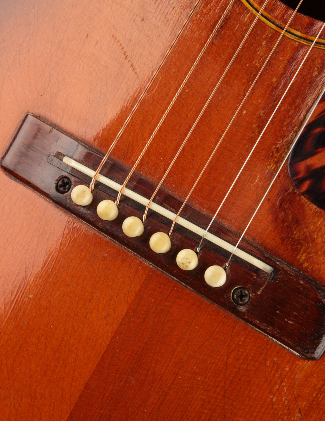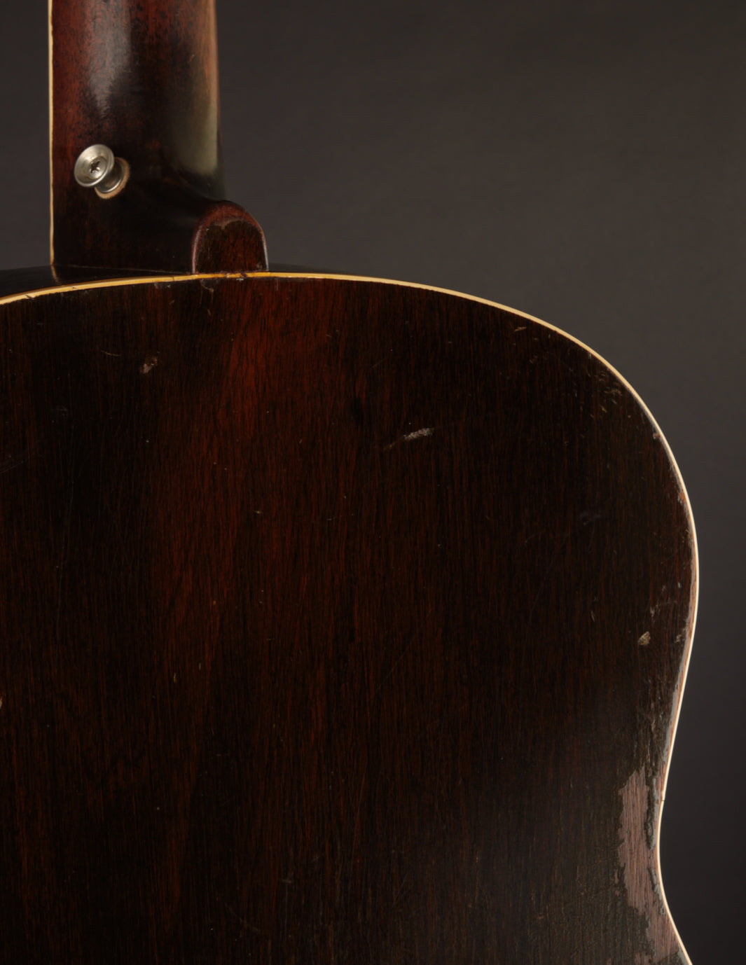 This particular guitar is very lightly built, which makes it a joy to play. The neck has a pronounced V profile, which has worn in well over the years and isn't particularly deep. The guitar has been refretted, a new nut has been installed, and an area of significant playwear near the bridge has been touched up with new finish. A very clean neck reset has been performed, and the guitar plays wonderfully under tension of light strings. One could certainly use mediums, though we don't think much will be added to the already splendid tone.