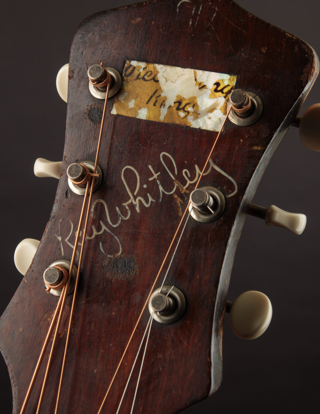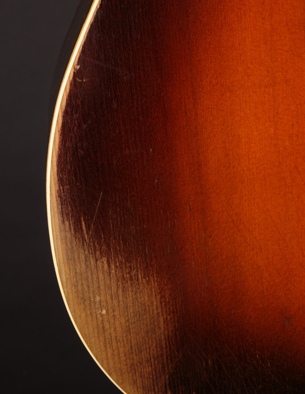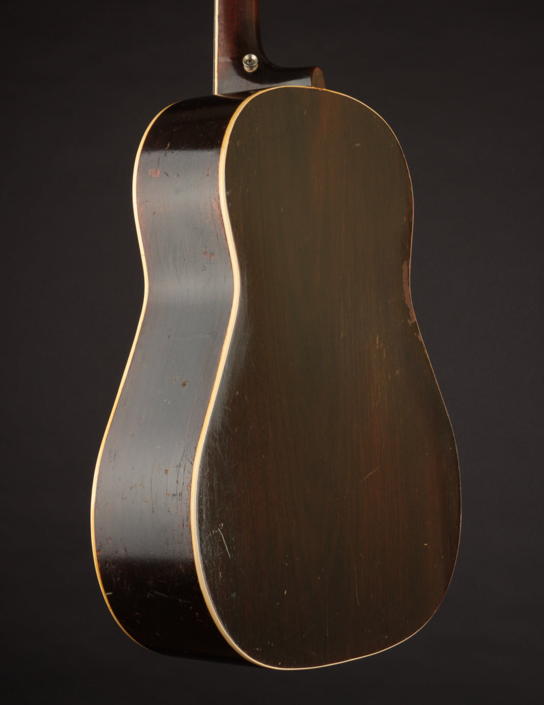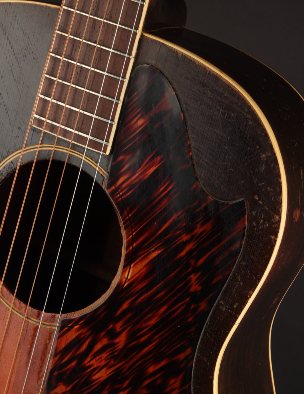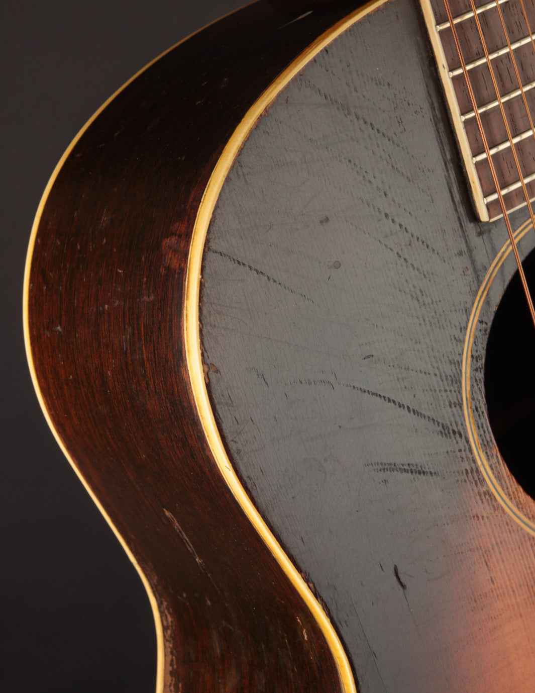 This particular guitar is very lightly built, which makes it a joy to play. The neck has a pronounced V profile, which has worn in well over the years and isn't particularly deep. The guitar has been refretted, a new nut has been installed, and an area of significant playwear near the bridge has been touched up with new finish. A very clean neck reset has been performed, and the guitar plays wonderfully under tension of light strings. One could certainly use mediums, though we don't think much will be added to the already splendid tone.