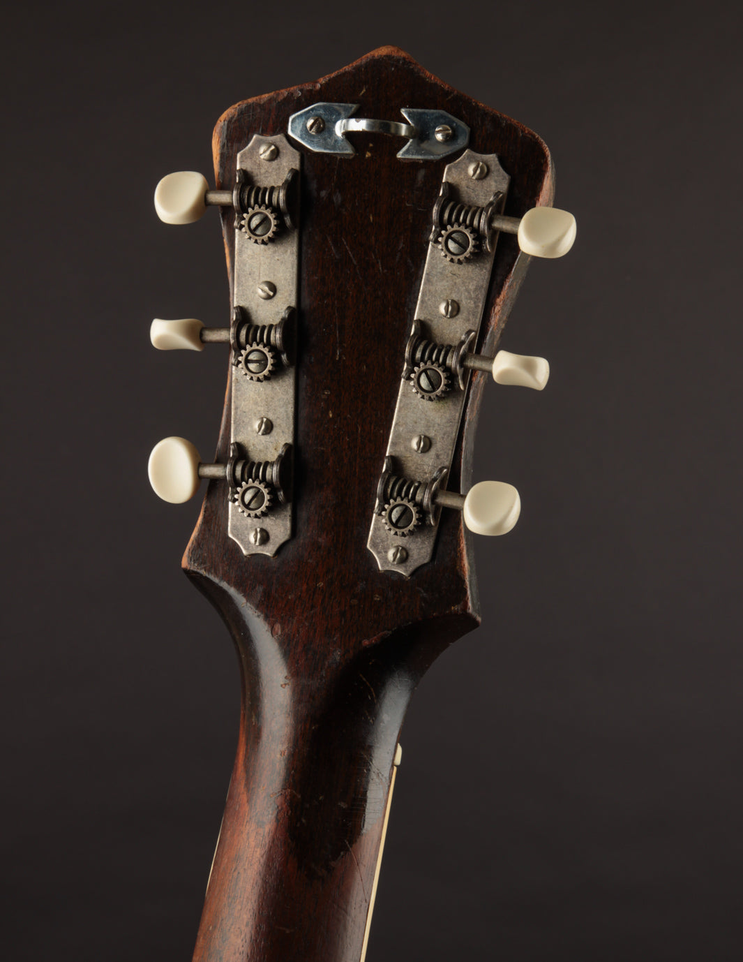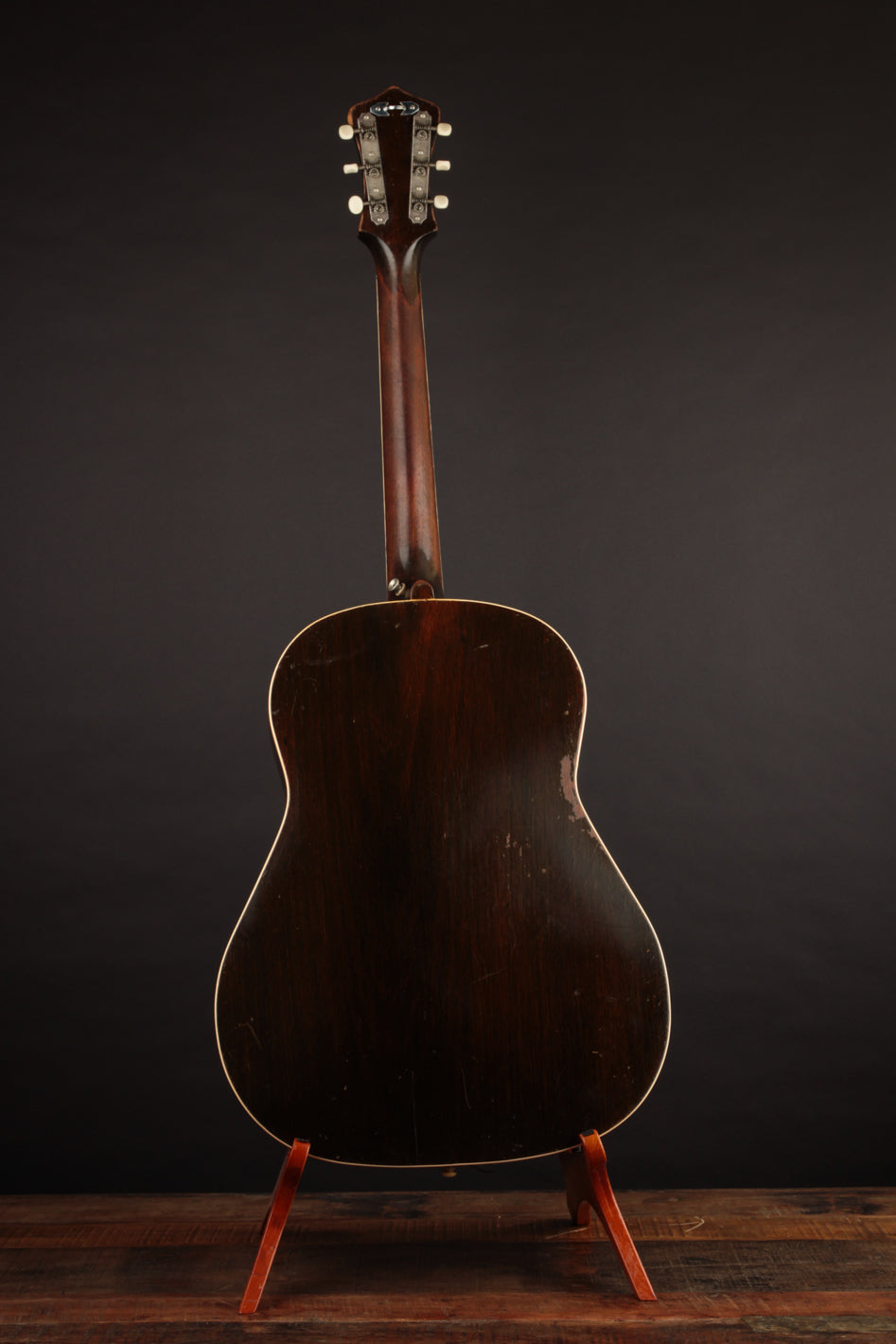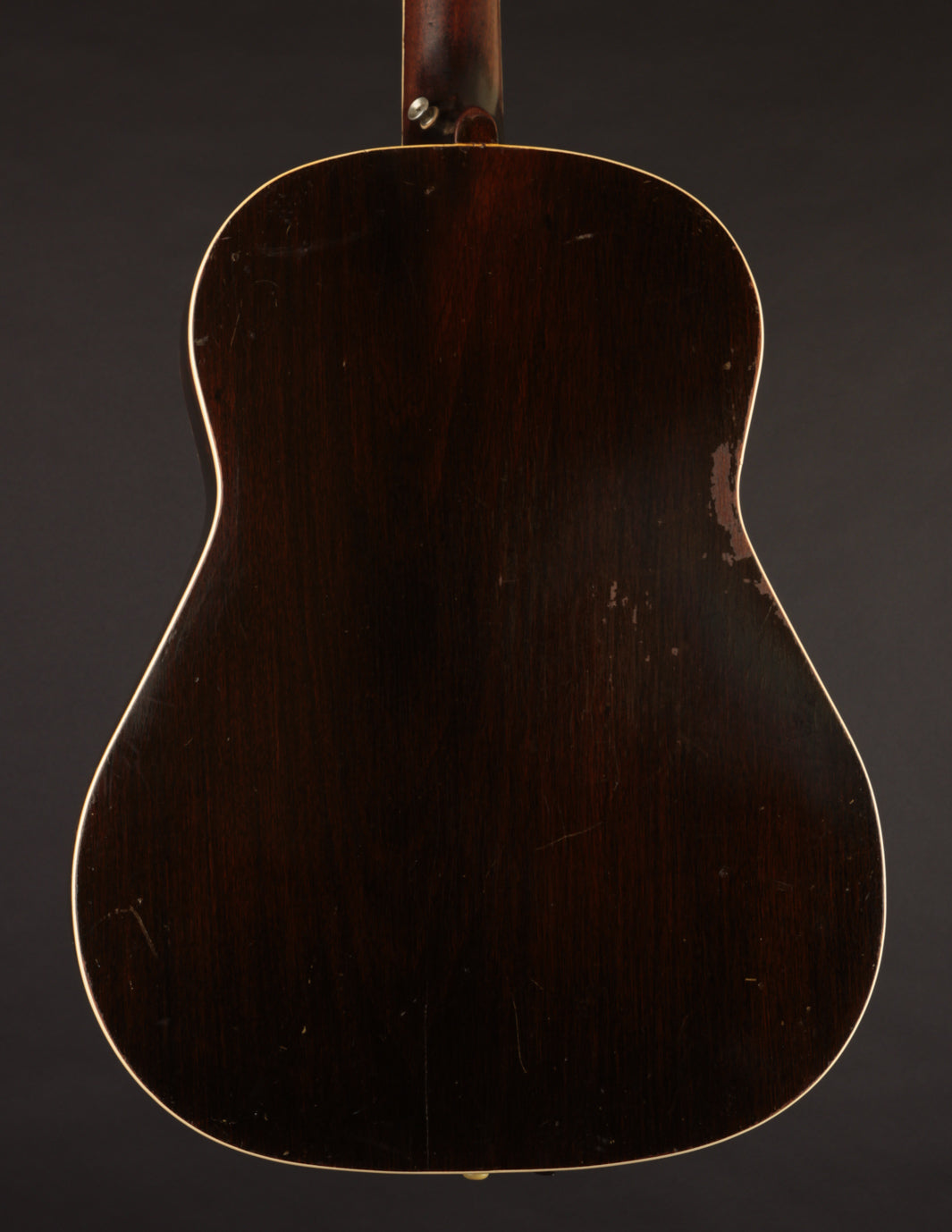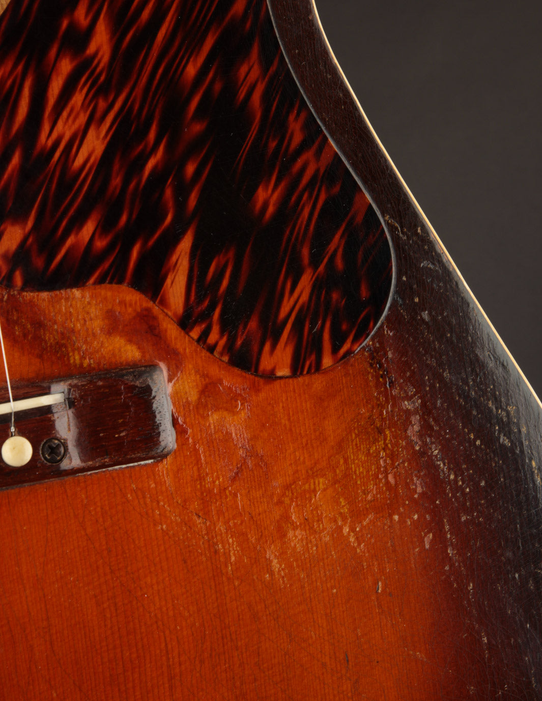 This particular guitar is very lightly built, which makes it a joy to play. The neck has a pronounced V profile, which has worn in well over the years and isn't particularly deep. The guitar has been refretted, a new nut has been installed, and an area of significant playwear near the bridge has been touched up with new finish. A very clean neck reset has been performed, and the guitar plays wonderfully under tension of light strings. One could certainly use mediums, though we don't think much will be added to the already splendid tone.