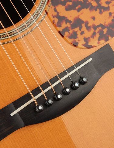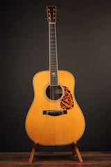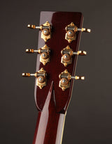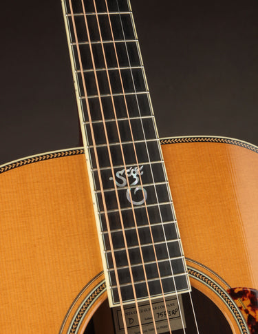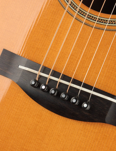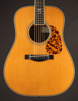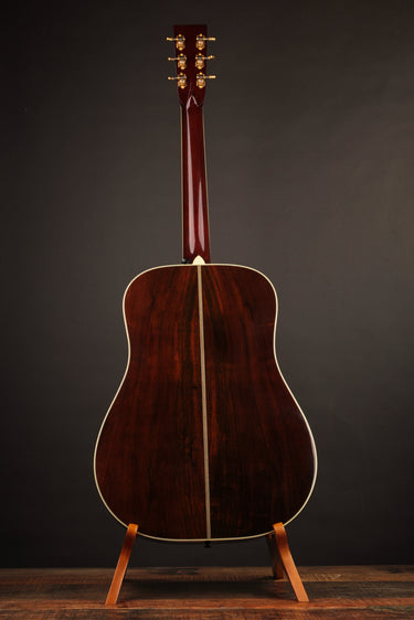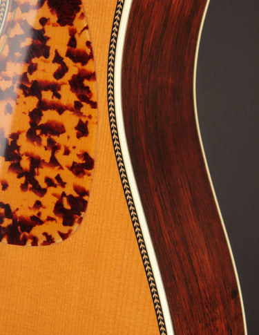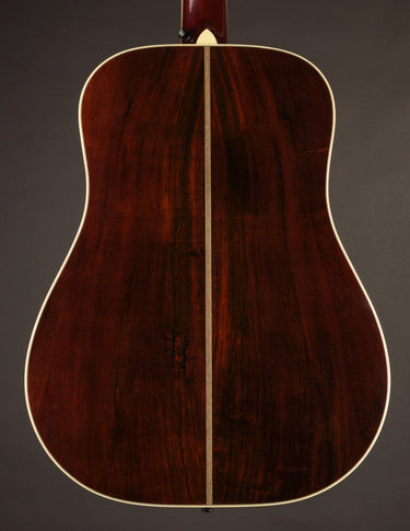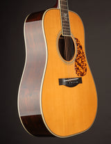 This guitar has been played, but remains in good overall condition. The top shows one noticeable ding between the bridge and end wedge, alongside minor dings in the lower bout. The back shows minor signs of handling (light button swirls, etc.) but still looks beautiful. Our shop has set it up anew, and it plays about as smoothly as a dreadnought can play. Priced with its original Ameritage case.