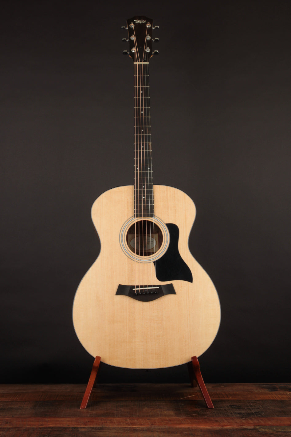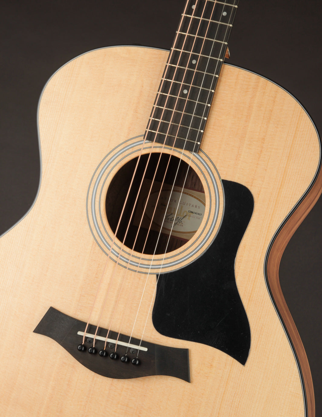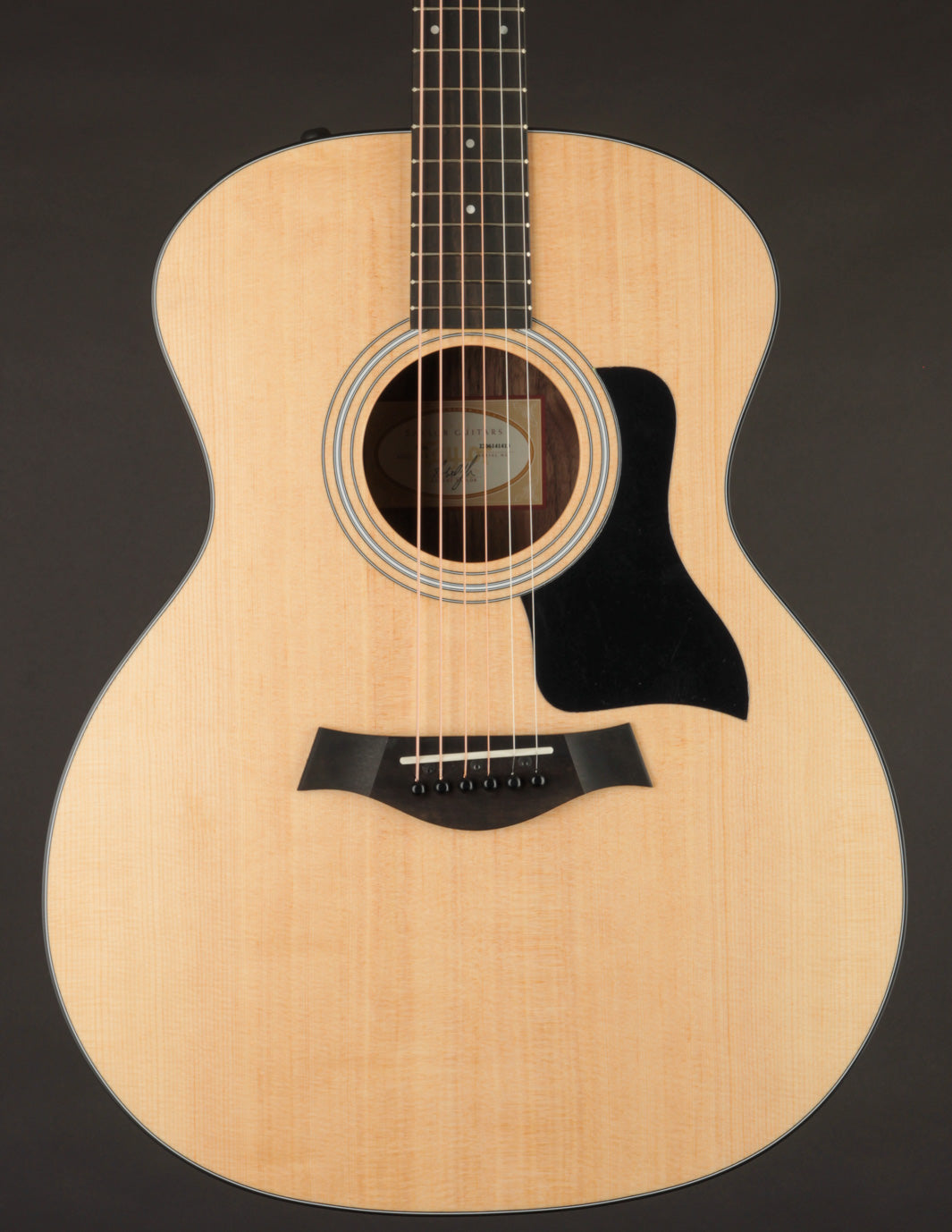 The Taylor 114e features a Grand Auditorium body style, a popular choice for its appealing versatility. Layered walnut back and sides and a solid Sitka spruce top produce clear and balanced tone with a pleasing projection and midrange focus.