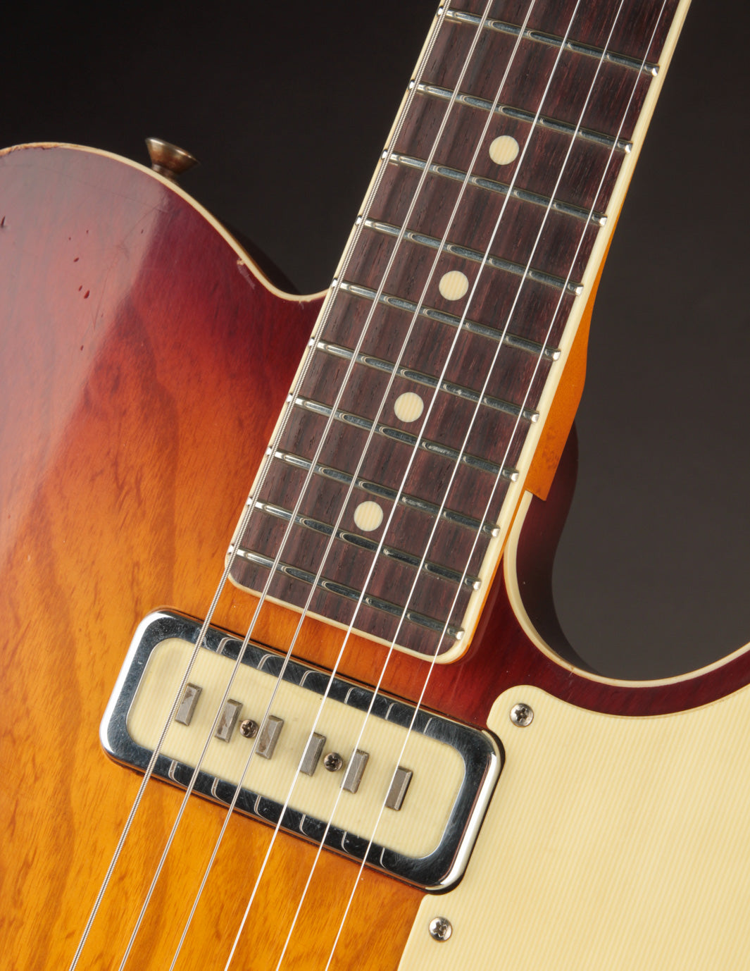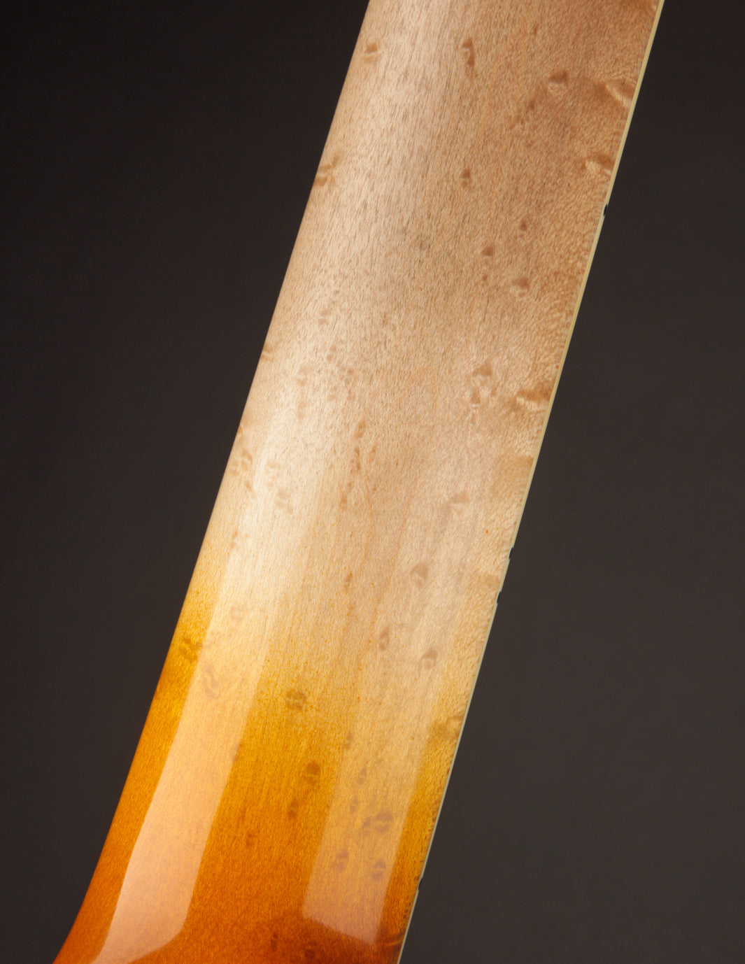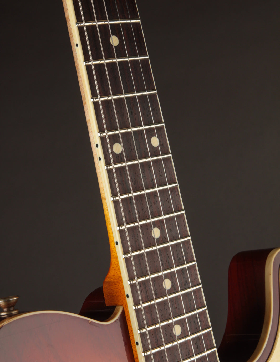 Finished in a lightly aged Tobacco Burst nitro-lacquer over a one-piece Swamp Ash body, this G/T is paired with a beautifully figured 3A Birdseye Maple neck ('53 C profile measuring .87-.96") and a luxurious (inlayed!) East Indian Rosewood fretboard. Elegant grained ivoroid binding, pickguard, inlays, and pickup cover inserts heighten its visual appeal.