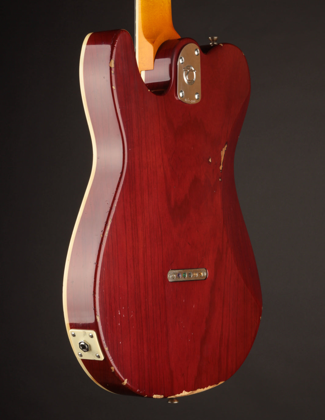 Hardware choices highlight Ron’s meticulous eye for performance: a compensated Thorn Brass Knuckle single-piece saddle set into a custom notched bridge plate, locking tuners (no string tree required), and a sleek custom control plate that put the controls in the perfect spot for manipulation.