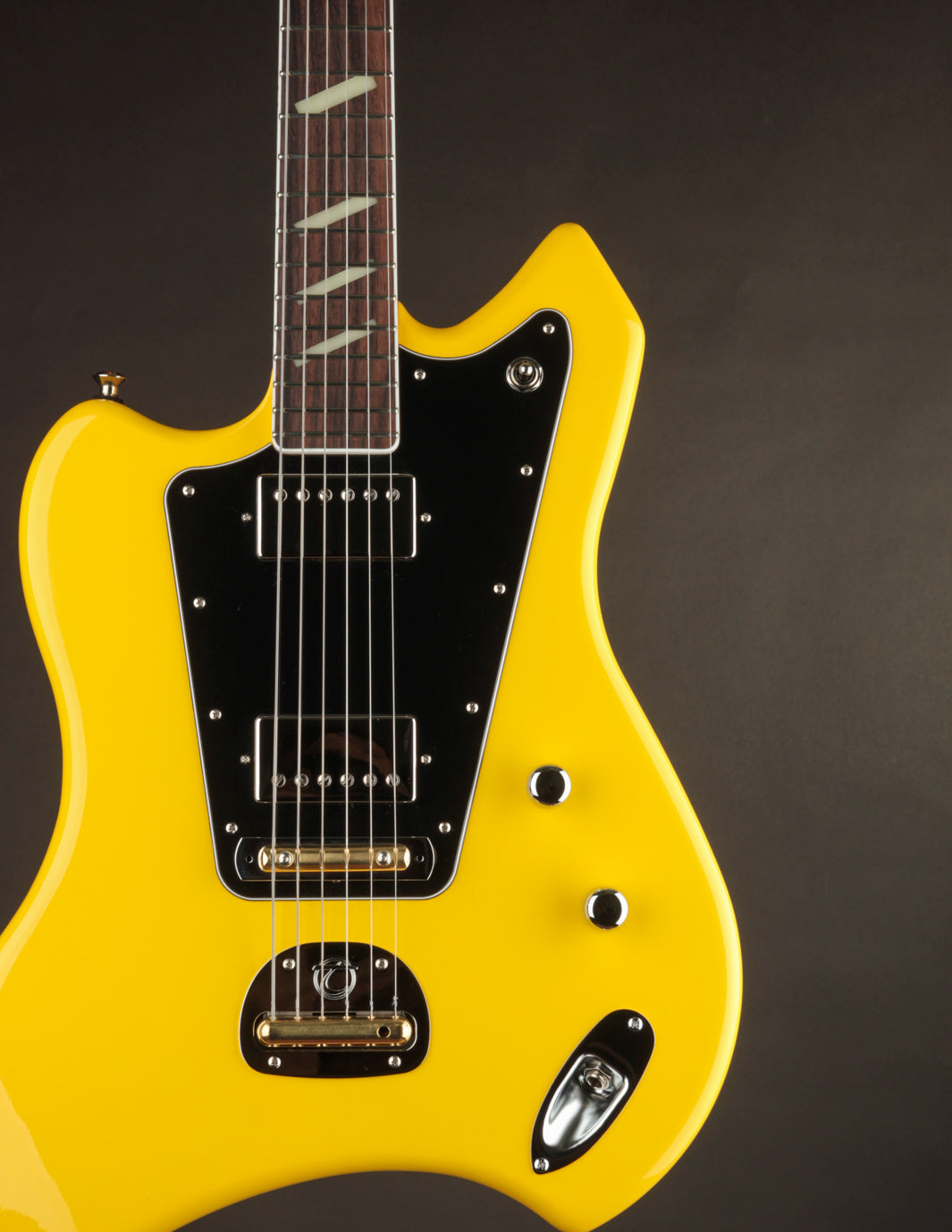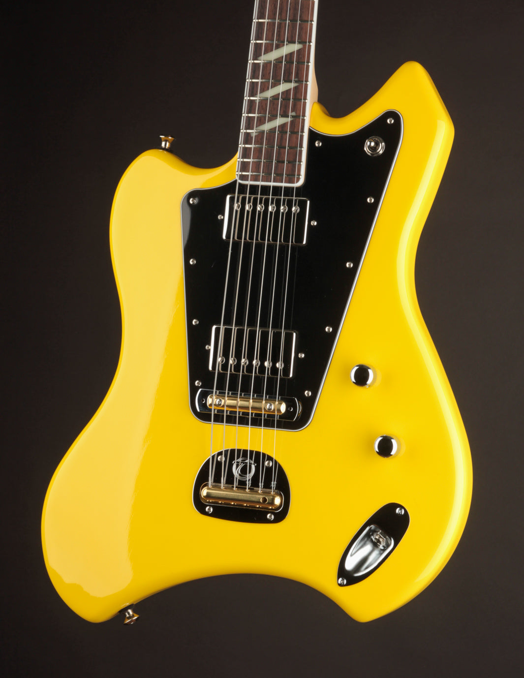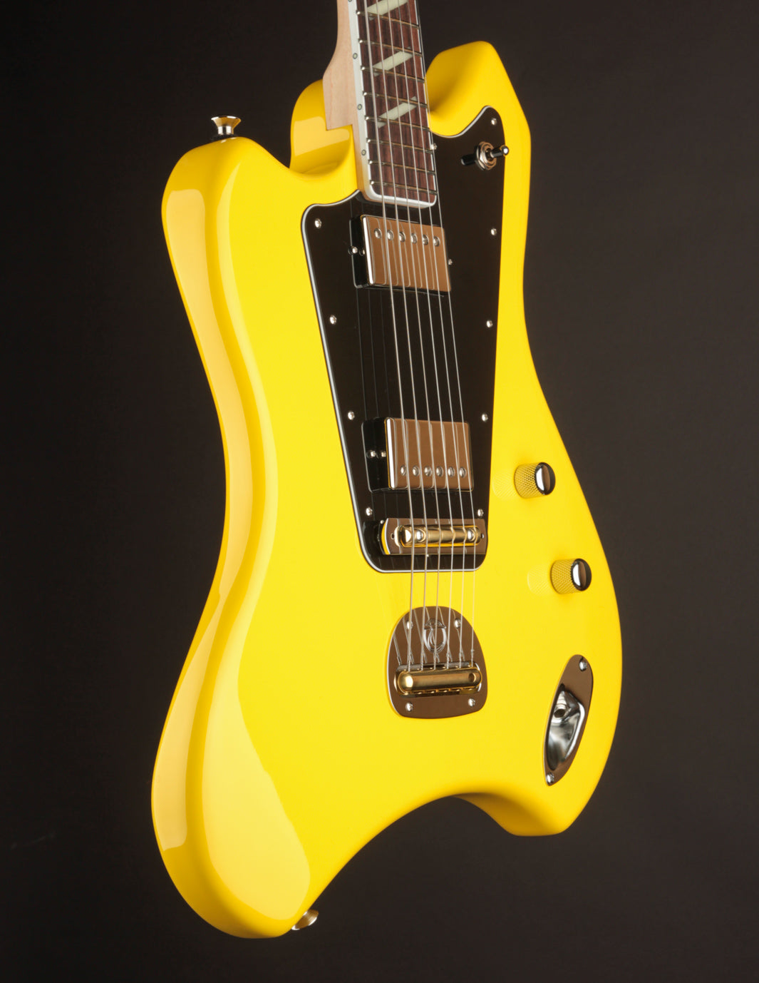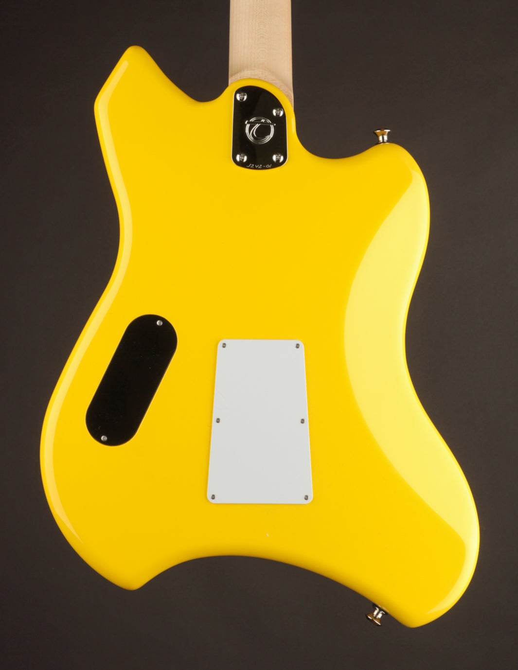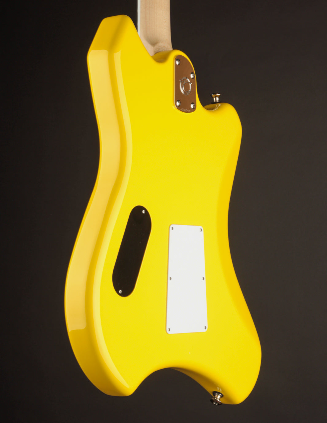The design started with a few rough influences - a flipped Jazzmaster silhouette, a nod to the Hamer Phantom A5 GT (one of Josh's faves), and some key aesthetic and functional details. Add to that Thorn’s brilliant Brass Knuckle bridge and trem, Sperzel locking tuners, block inlays that glow in the dark (yes, really - yellow, because of course!), and a Strat-style output jack. The result? A rock-ready instrument that looks like it time-traveled from another dimension and landed squarely on stage with DEVO.