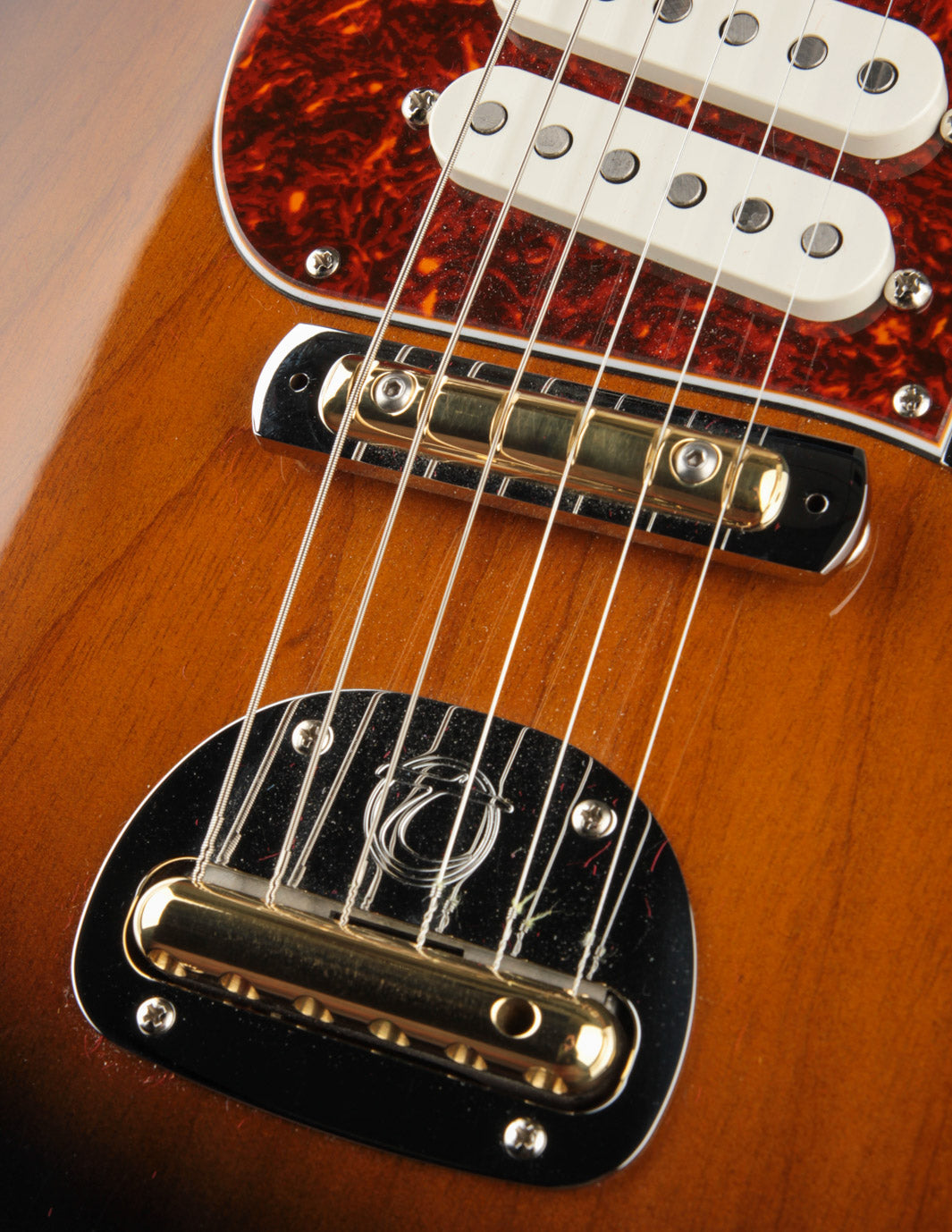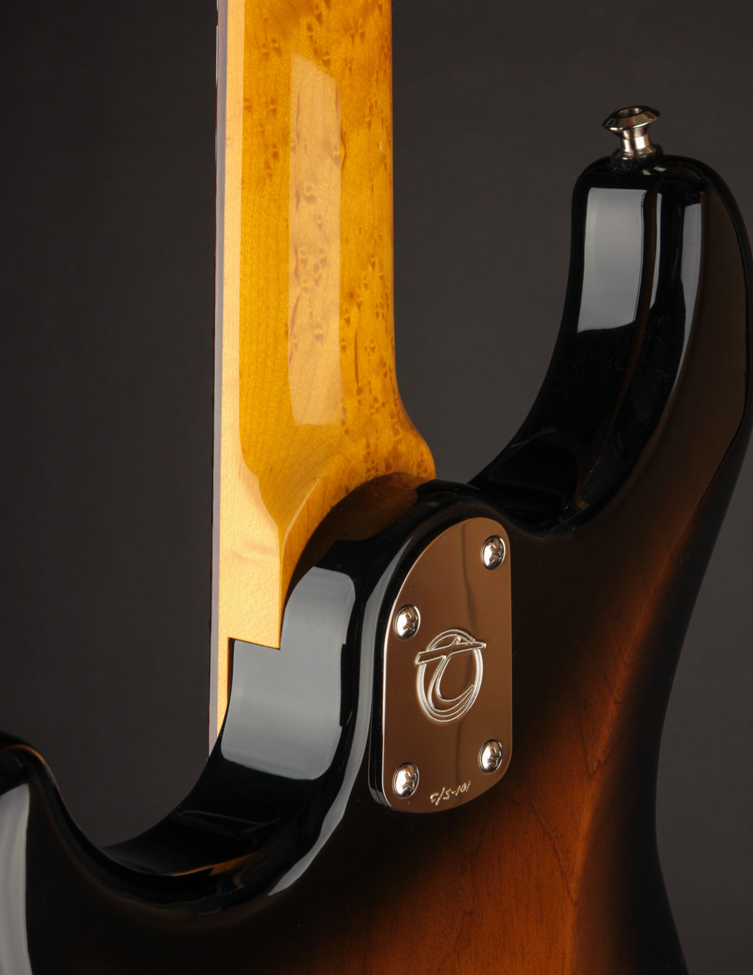 Last but not least...Ron's original bridge designs. The C/S comes in three bridge flavors - hardtail, 1-piece tremolo, and a 2 piece bridge & tremolo, the latter features Ron's "Brass Knuckle" saddle and ridiculously cool, touch-sensitive, and expressive tailside vibrato. The 1-piece tremolo has a very expressive, smooth travel with no tuning concerns whatsoever.