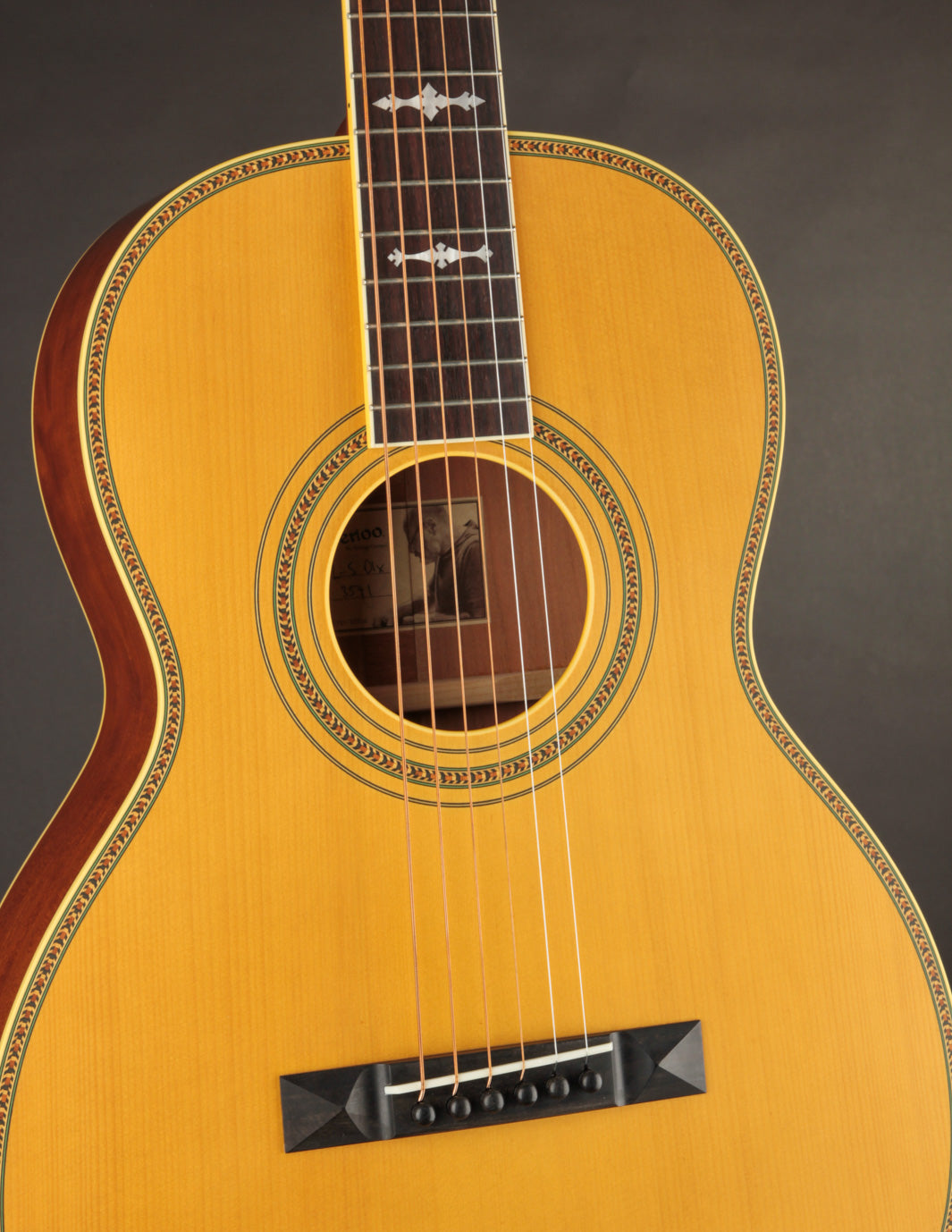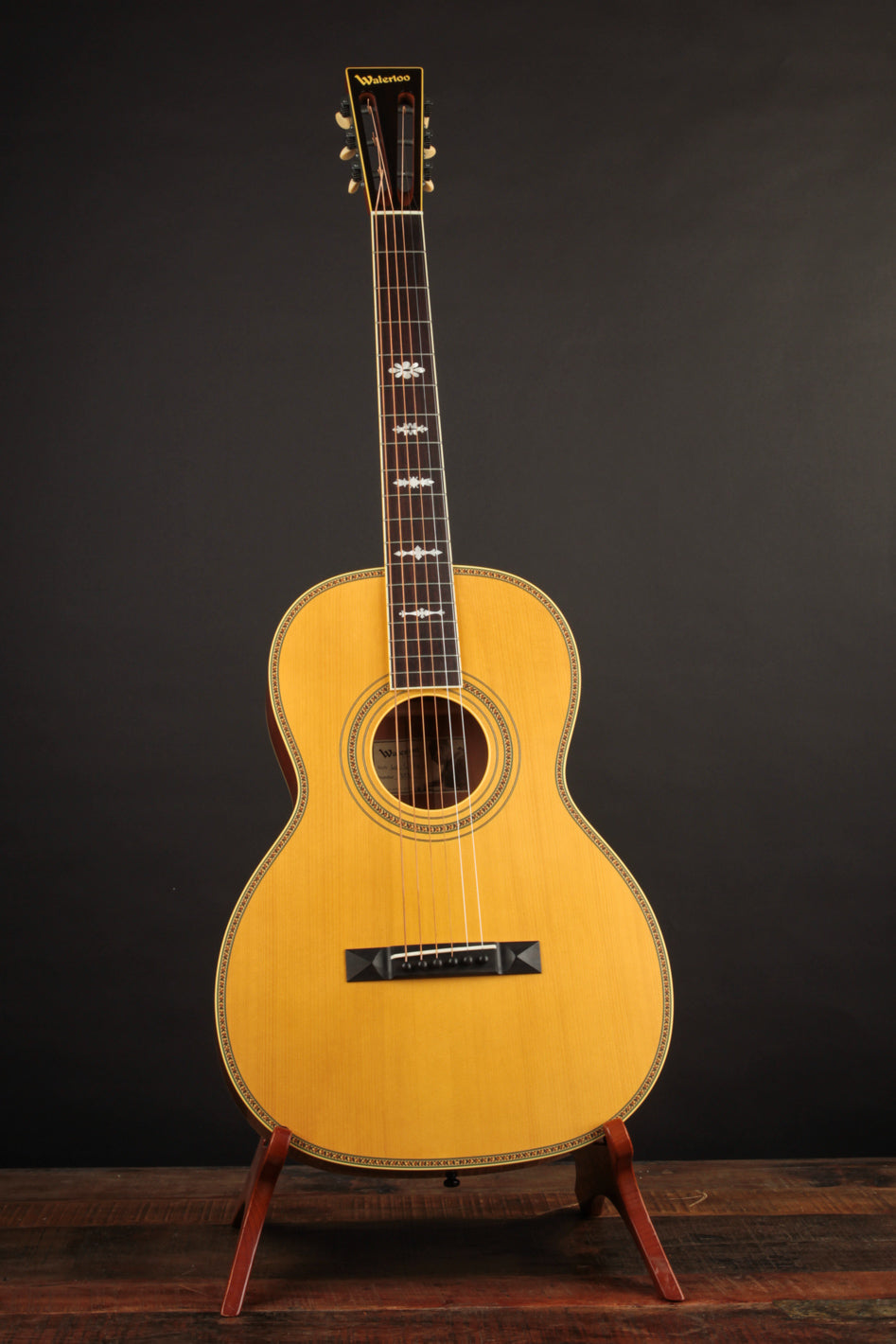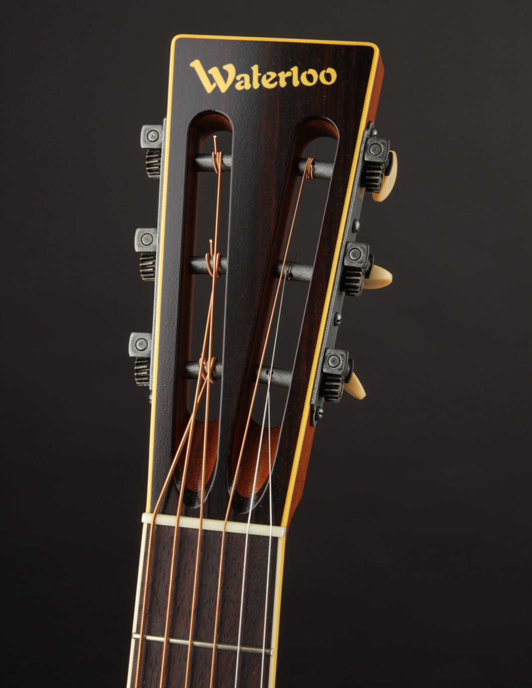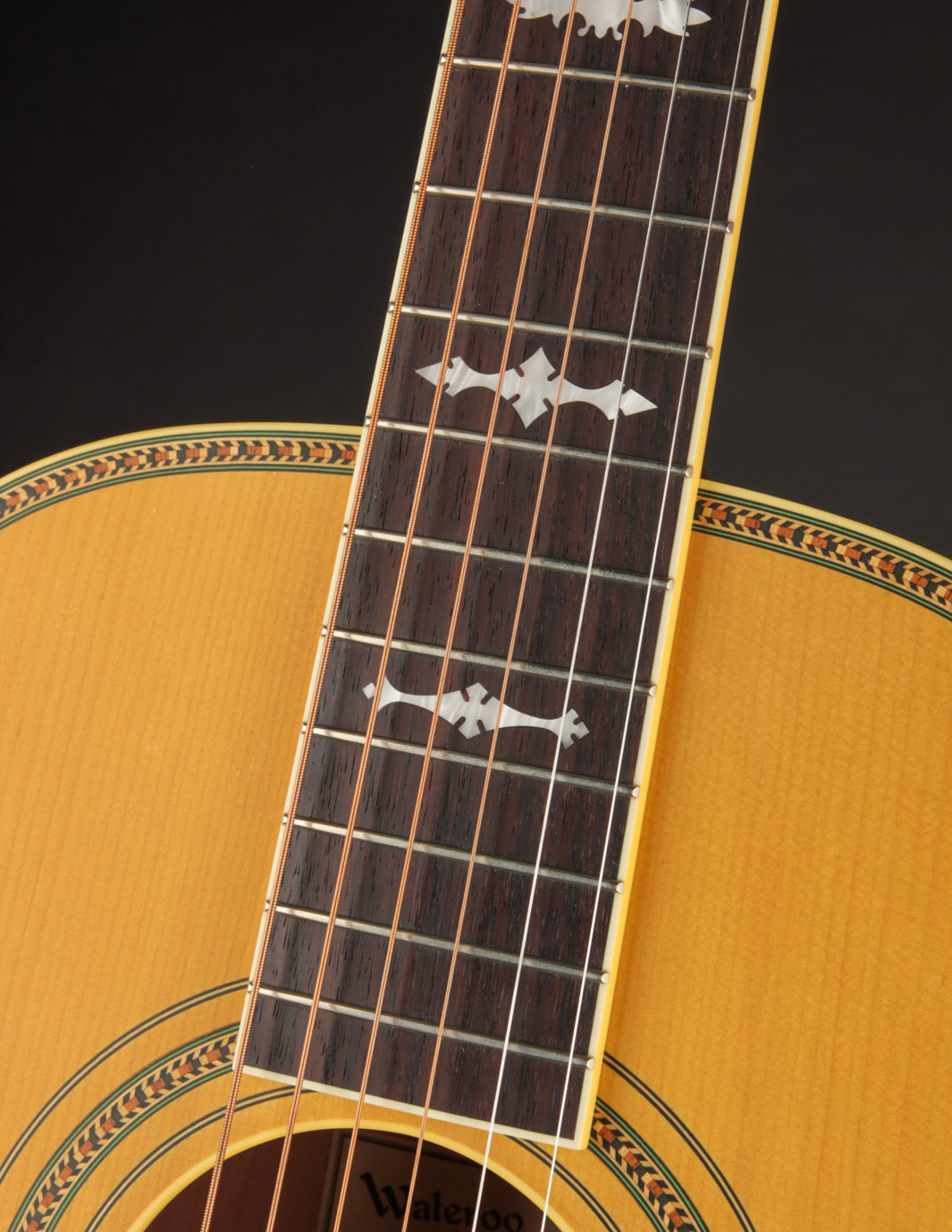 From Waterloo Guitars: "The WL-S Deluxe possesses a richness, dimensionality, and warmth that must be heard to be believed. Inspired by ornately appointed Stella guitars from the 1930’s, the WL-S features intricate wood purflings and custom acrylic inlays for an appearance to match its detailed tone. A hand rubbed varnish finish completes the WL-S both aesthetically and tonally, with a beautiful vintage patina and acoustical excitability that brings out the nuances of this ladder braced design. A solid cherry wood back and sides further enhance the unique character of this guitar, providing exceptional balance and articulation.