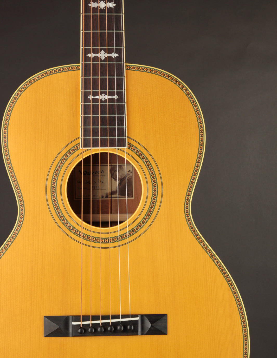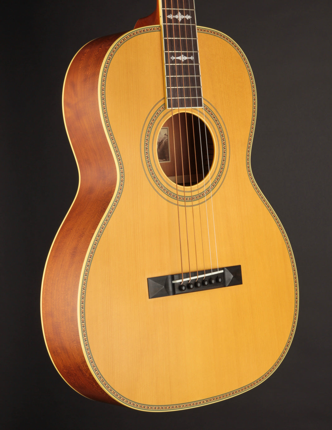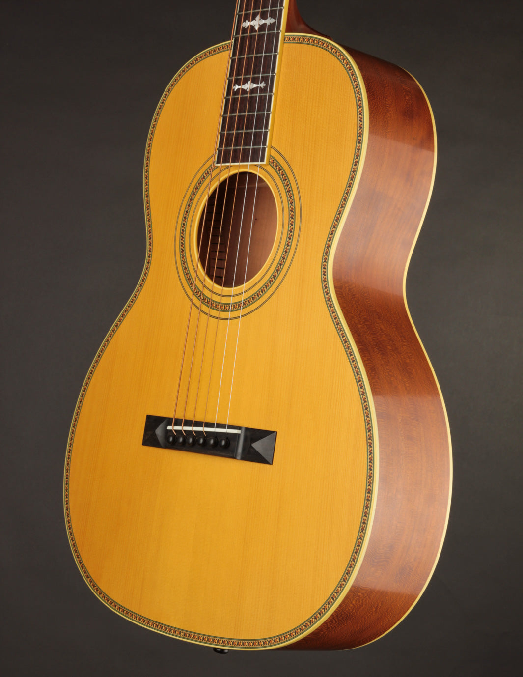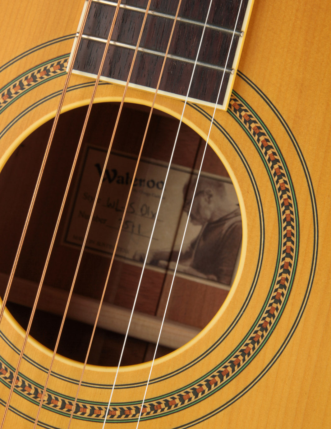 From Waterloo Guitars: "The WL-S Deluxe possesses a richness, dimensionality, and warmth that must be heard to be believed. Inspired by ornately appointed Stella guitars from the 1930’s, the WL-S features intricate wood purflings and custom acrylic inlays for an appearance to match its detailed tone. A hand rubbed varnish finish completes the WL-S both aesthetically and tonally, with a beautiful vintage patina and acoustical excitability that brings out the nuances of this ladder braced design. A solid cherry wood back and sides further enhance the unique character of this guitar, providing exceptional balance and articulation.